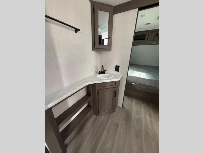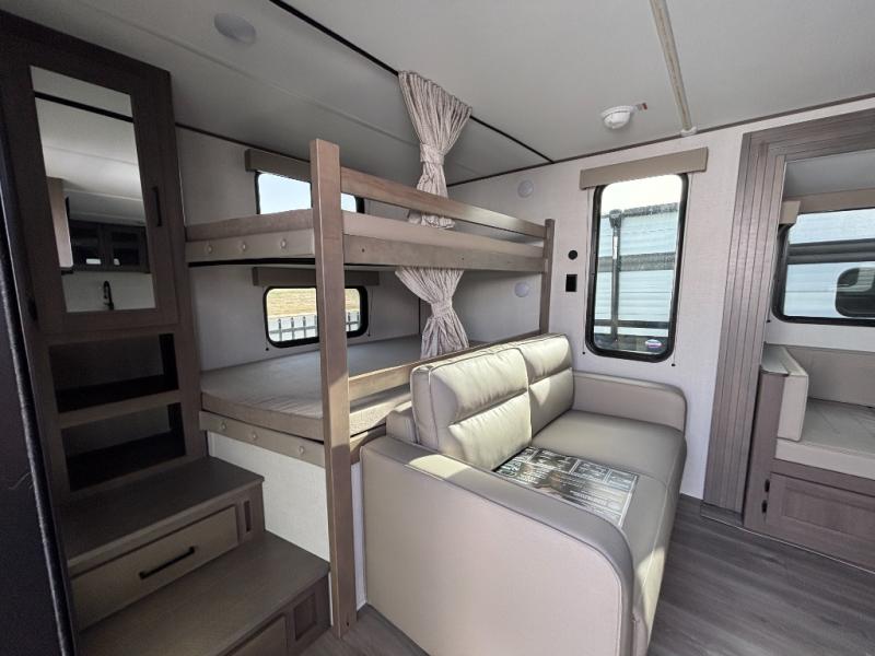Your crew of eight will love camping in this spacious travel trailer! There are double-size bunks in the back with step storage and an added wardrobe for your guests' things plus exterior storage for camp gear galore. A walk-thru bath will create a front master bedroom you are sure to love, especially with its queen bed, wardrobe storage, and private exterior entry door! The main living area will be a favorite place to hang out with its U-shaped dinette, theater seating and 32" TV. If the weather is nice, you may just find yourselves outdoors since there is a rear exterior griddle and 1.7 cu. ft. refrigerator!