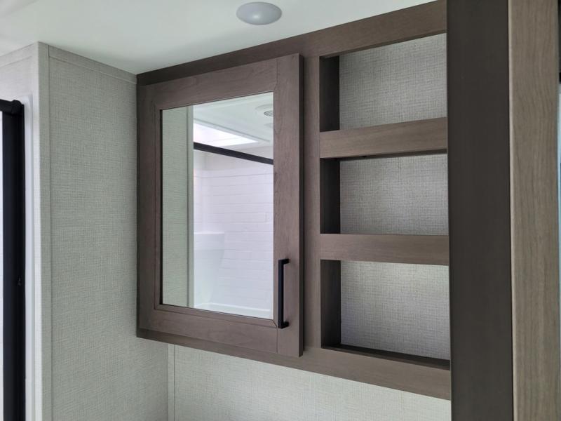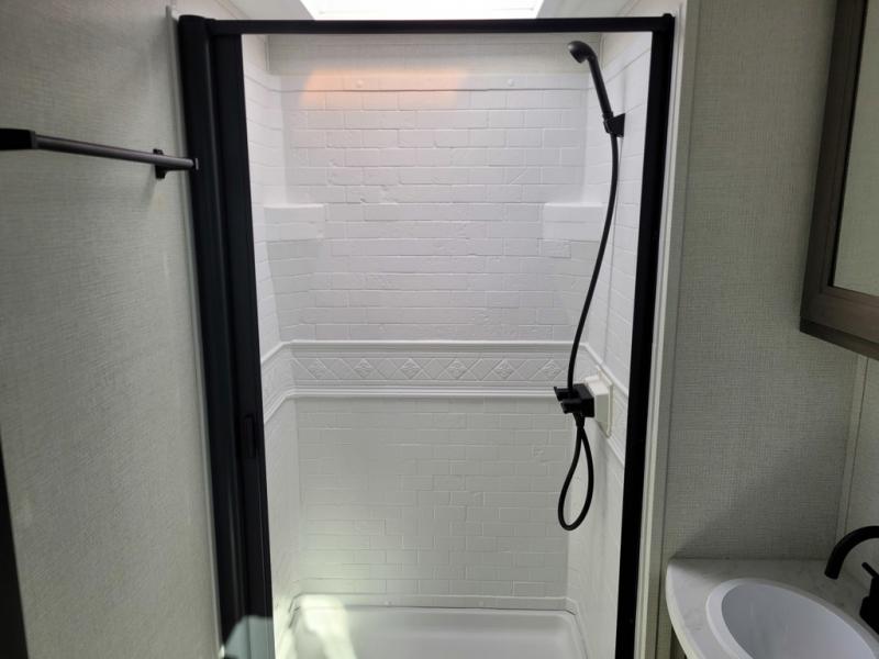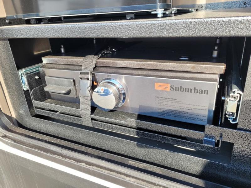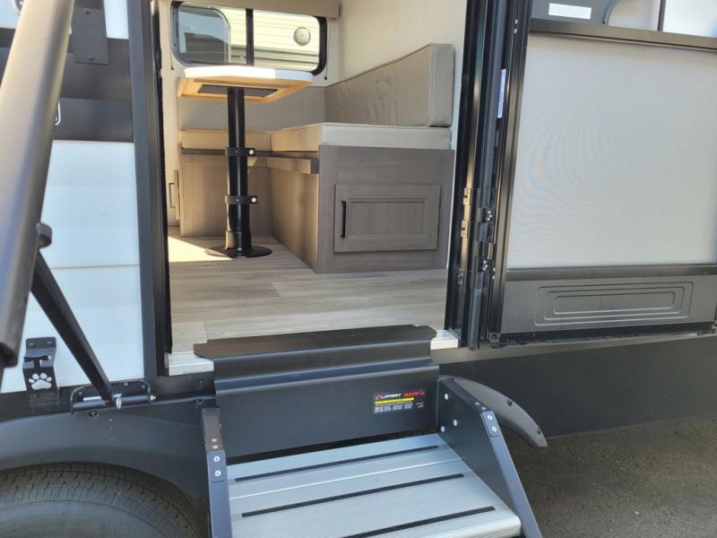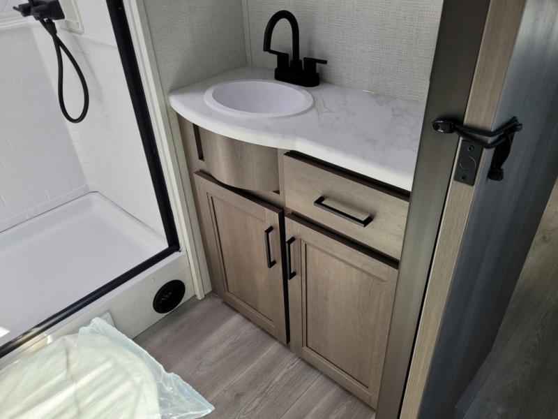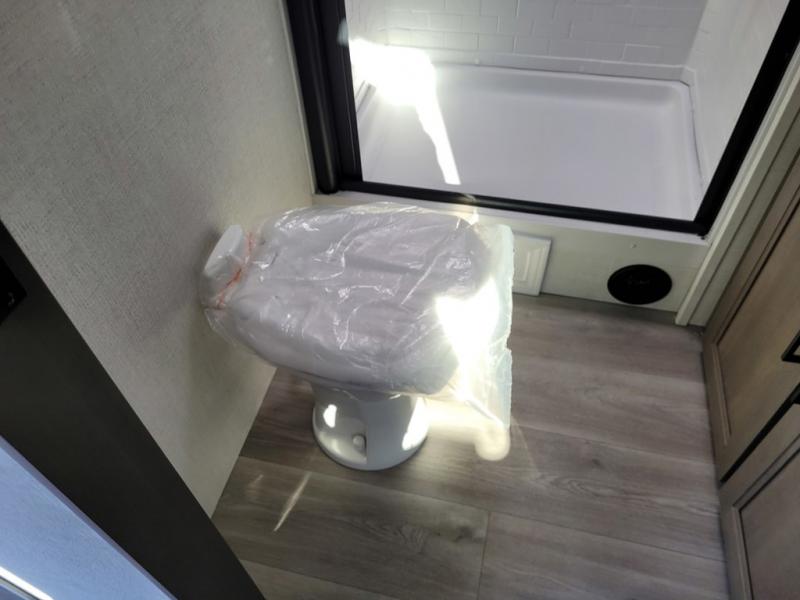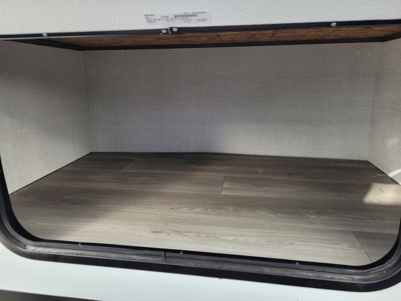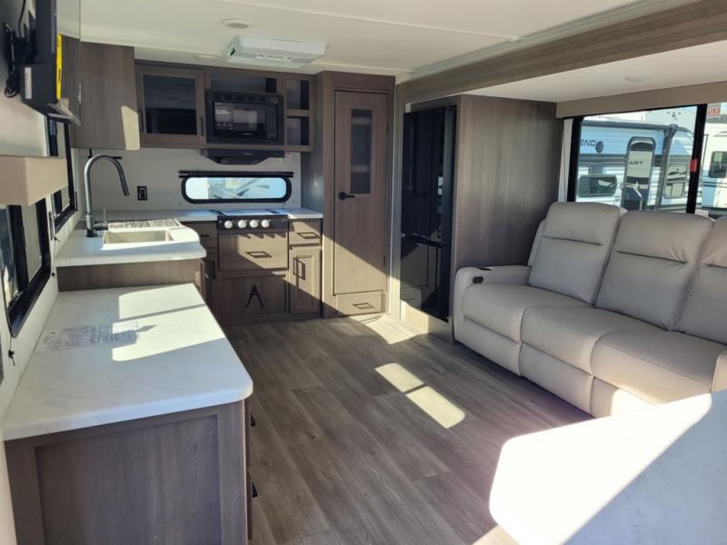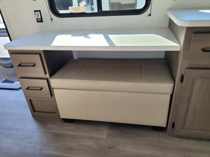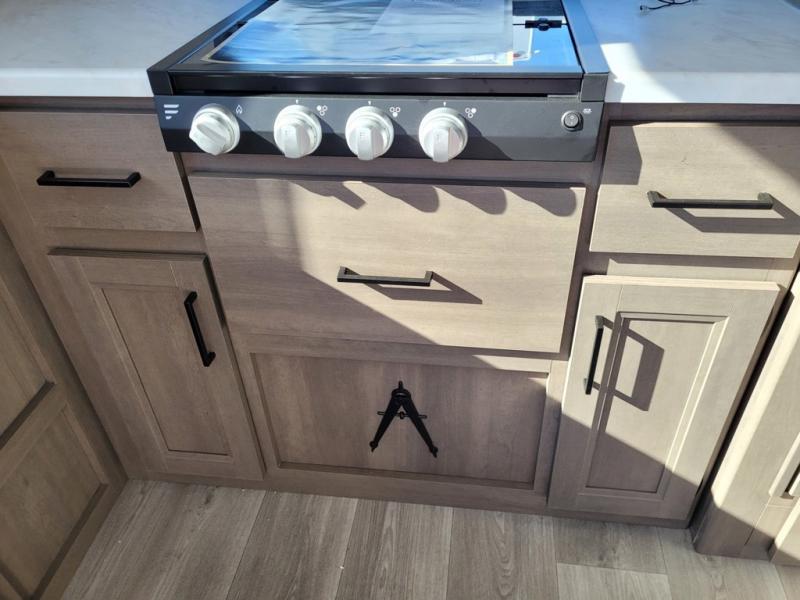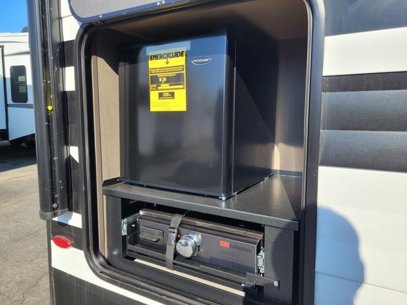 If you're looking for a cozy travel trailer for two, this is the one! You can sleep soundly each night on the king bed slide out, and you'll find plenty of storage in the front wardrobe. There is even washer and dryer prep if you choose to add those appliances. After you've freshened up in the full bath with a walk-in shower, you can head to the rear kitchen to make breakfast. There is ample counter space here, along with a three burner range and an air fryer/convection microwave, plus a pull-out trash can for easy clean up. The breakfast nook provides a fun place to dine together, and if you're needing additional sleeping space you can switch it out for the optional sleeper sofa. A theater seating slide also provides tons of comfort, especially since it's in perfect view of the 32" TV! This model also includes an exterior griddle with a 1.7 cu. ft. refrigerator, protected by the 21' power awning so you can cook in the shade!