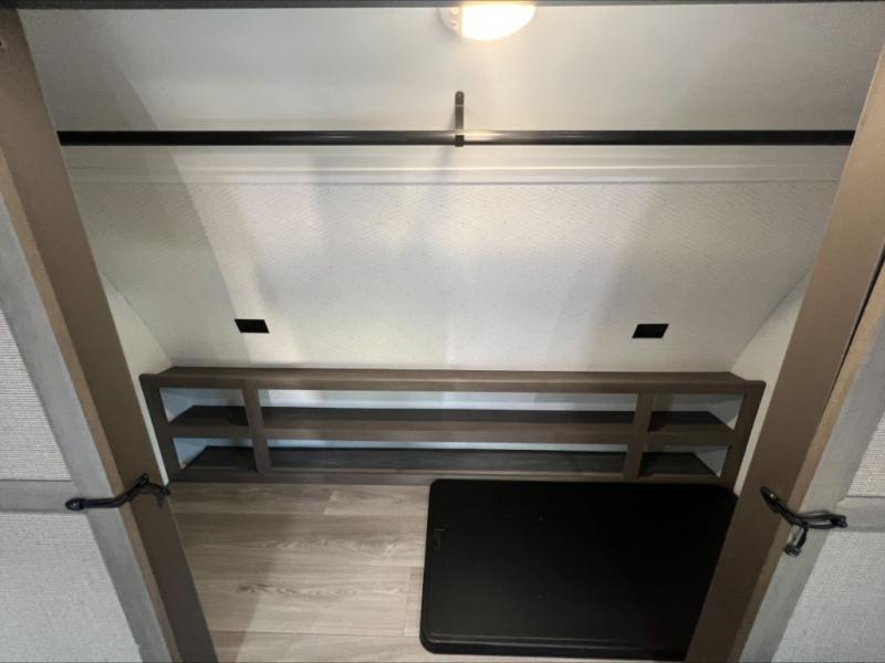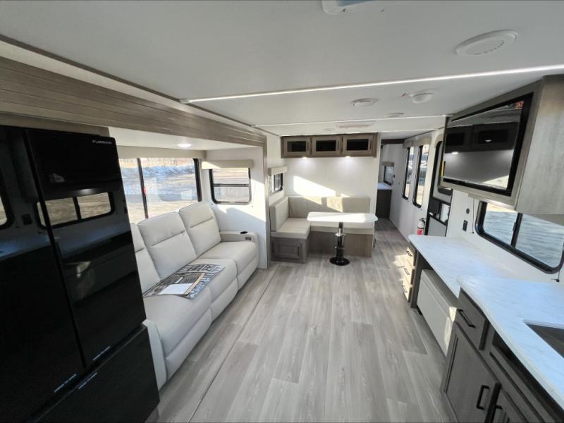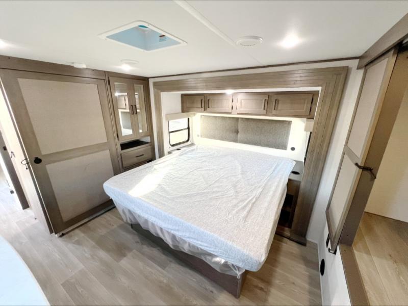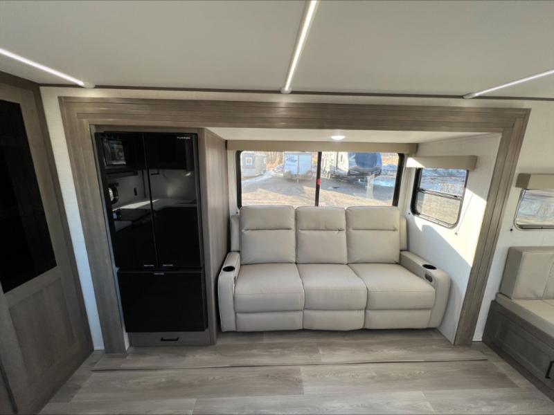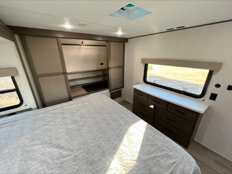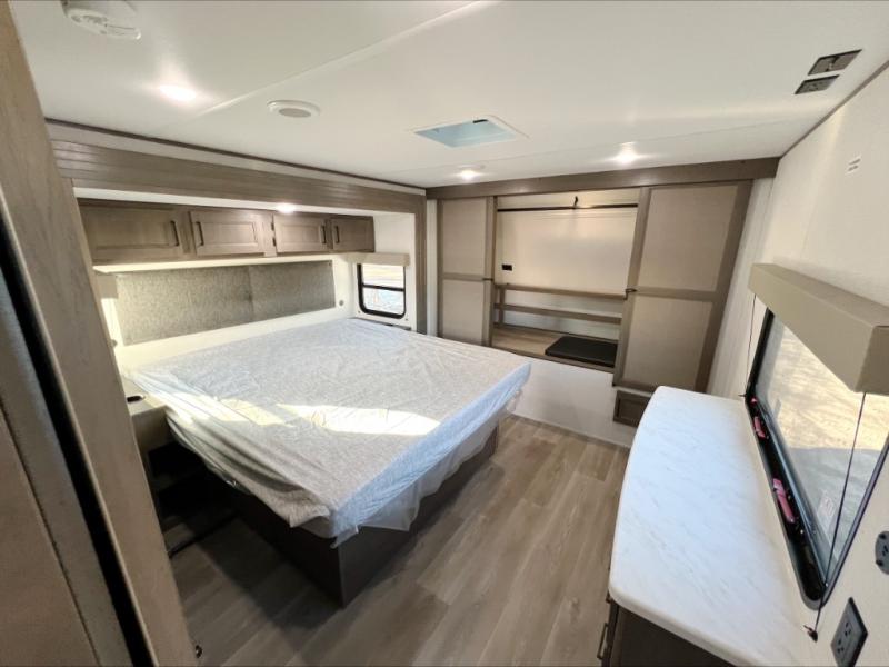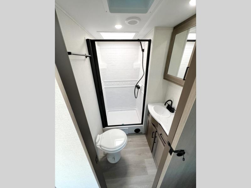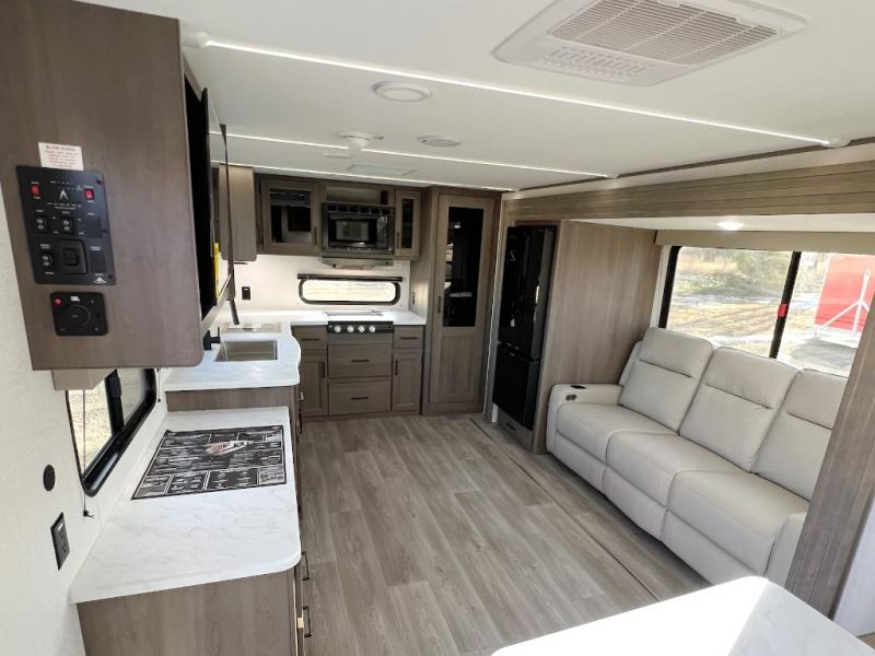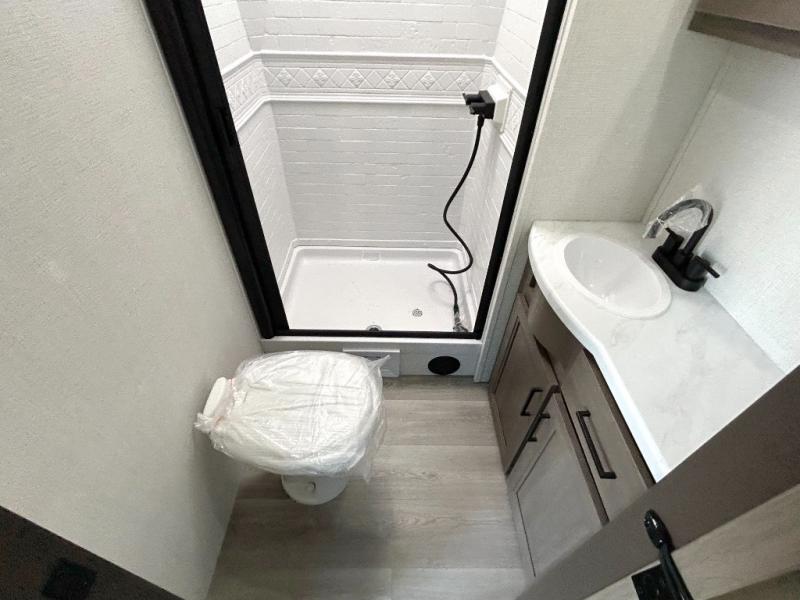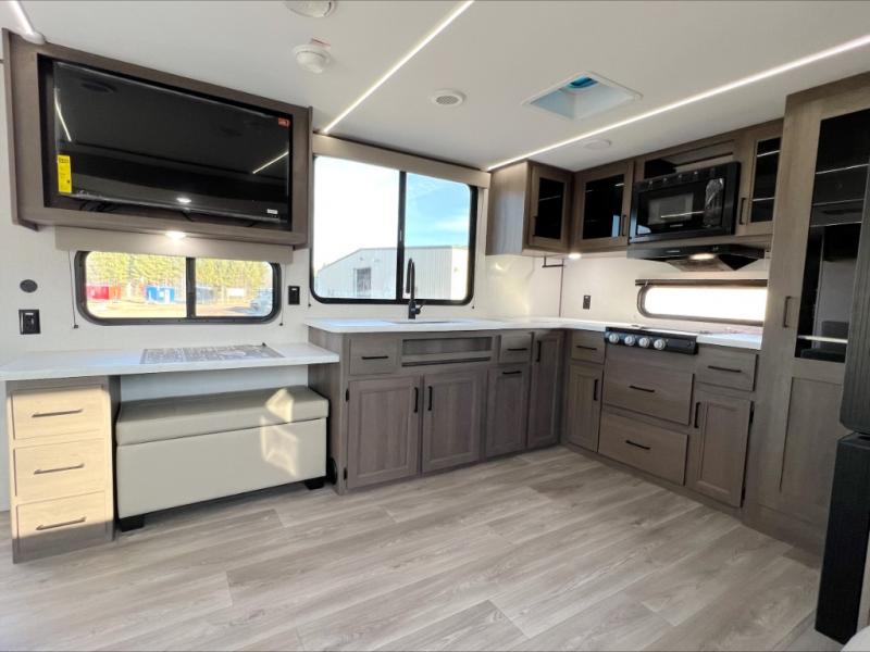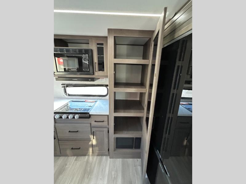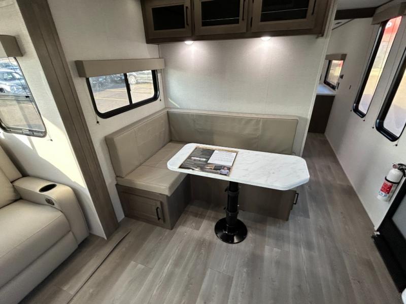 If you're looking for a cozy travel trailer for two, this is the one! You can sleep soundly each night on the king bed slide out, and you'll find plenty of storage in the front wardrobe. There is even washer and dryer prep if you choose to add those appliances. After you've freshened up in the full bath with a walk-in shower, you can head to the rear kitchen to make breakfast. There is ample counter space here, along with a three burner range and an air fryer/convection microwave, plus a pull-out trash can for easy clean up. The breakfast nook provides a fun place to dine together, and if you're needing additional sleeping space you can switch it out for the optional sleeper sofa. A theater seating slide also provides tons of comfort, especially since it's in perfect view of the 32" TV! This model also includes an exterior griddle with a 1.7 cu. ft. refrigerator, protected by the 21' power awning so you can cook in the shade!