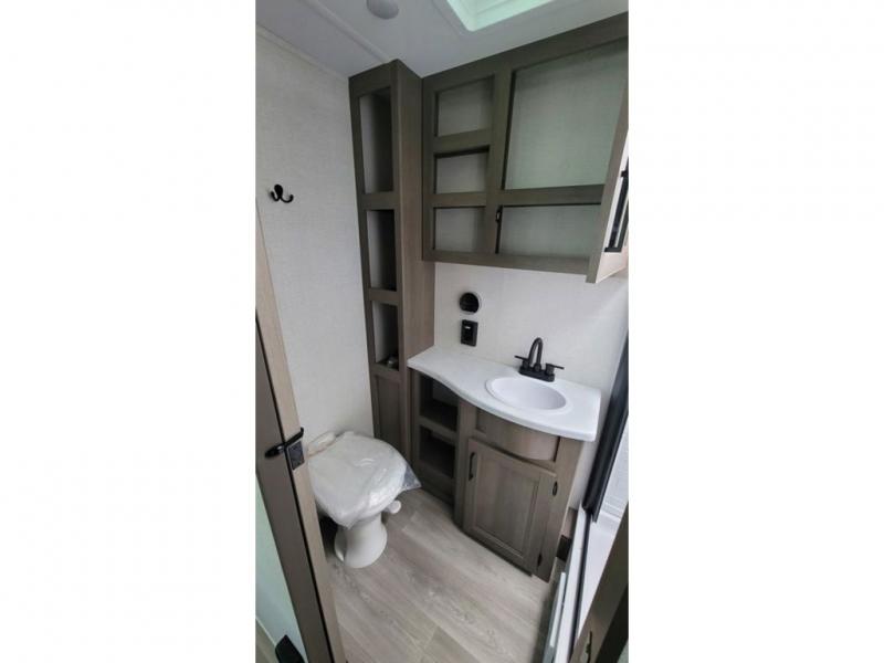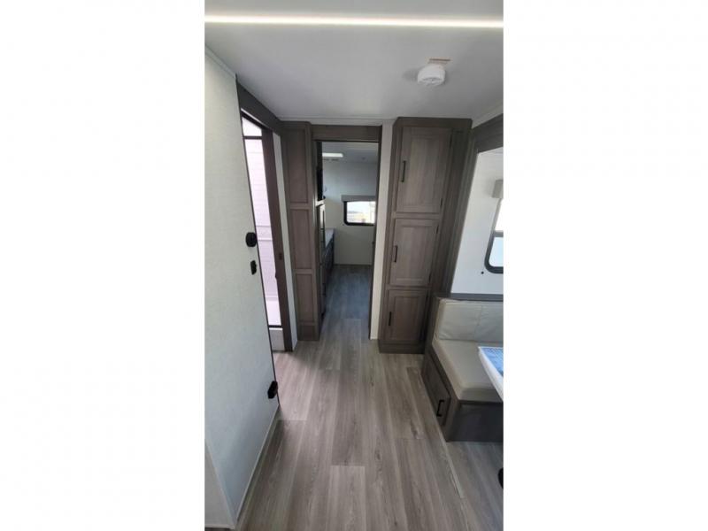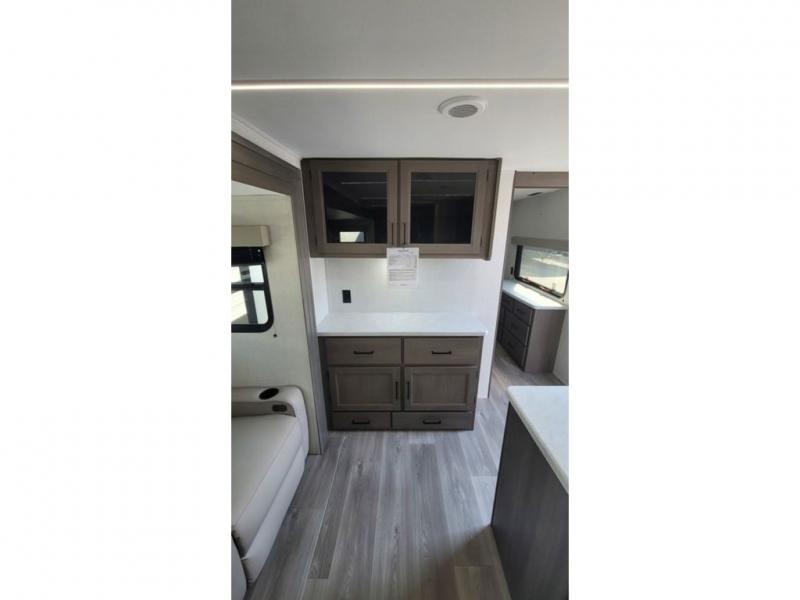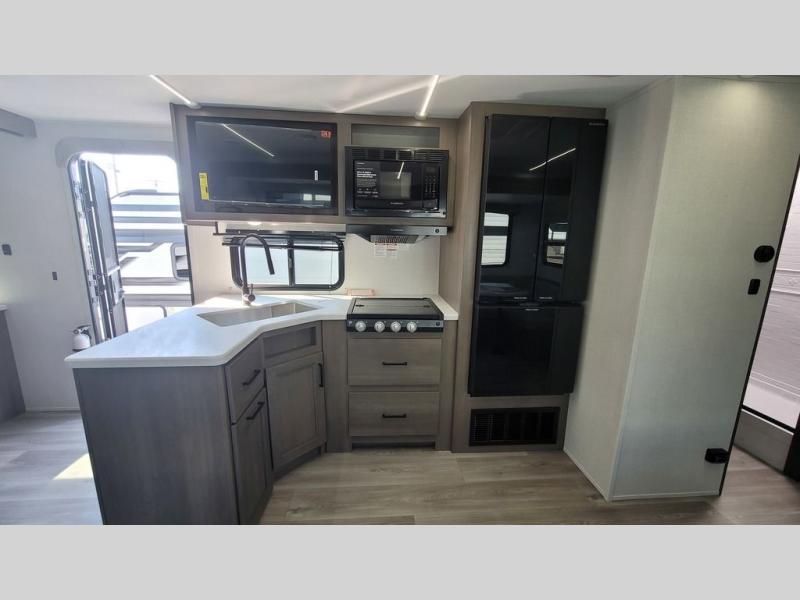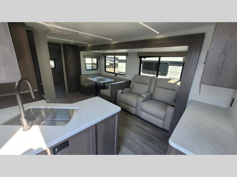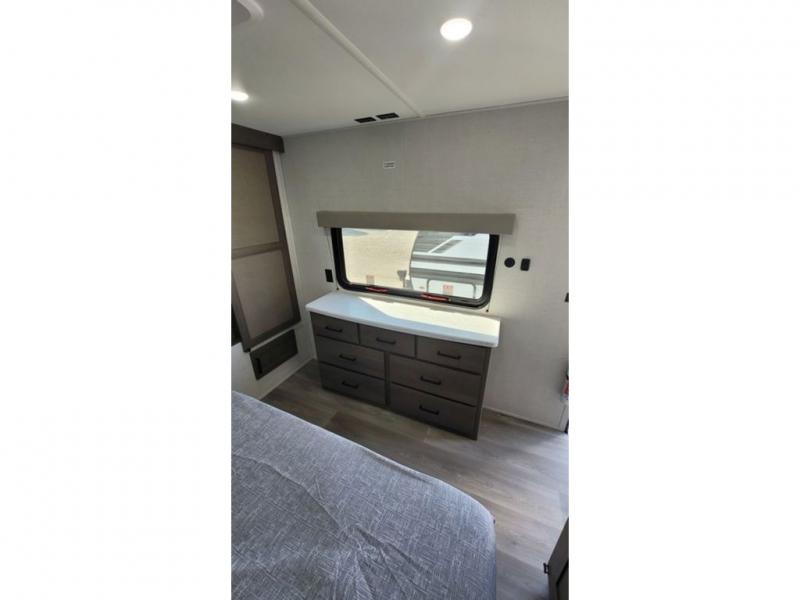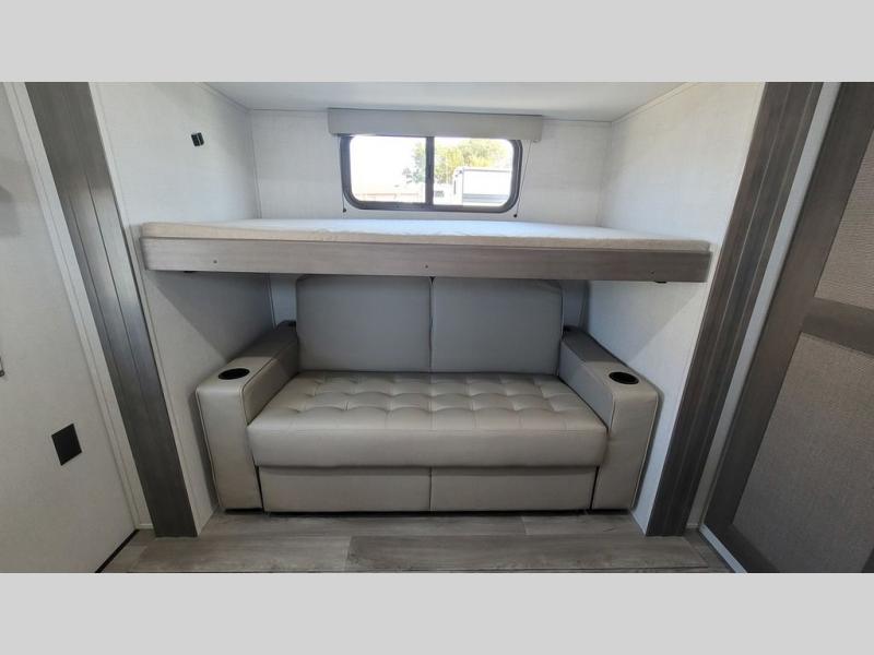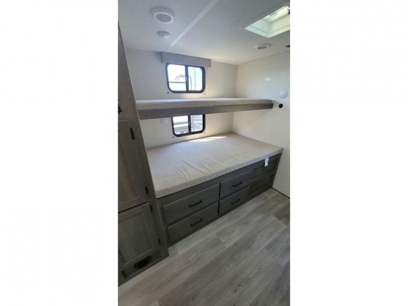 If you're looking for a travel trailer that can house your whole gang, this unit is the one! The rear private bunkhouse can sleep up to five since there is a sleeper sofa and three bunks, plus there are storage drawers for your guests' things. A front private bedroom will be perfect for the owners with a queen bed slide out and spacious front closet with washer and dryer prep! Whether you cook outside on the exterior griddle or inside on the three burner range, you'll be able to make your best meals. There is also a 12V French door refrigerator with a glass front and bottom freezer and a convection microwave/combo air fryer to enjoy some crispy fries! A U-shaped dinette and 60" sleeper sofa within the living room slide provides even more seating and sleeping space!