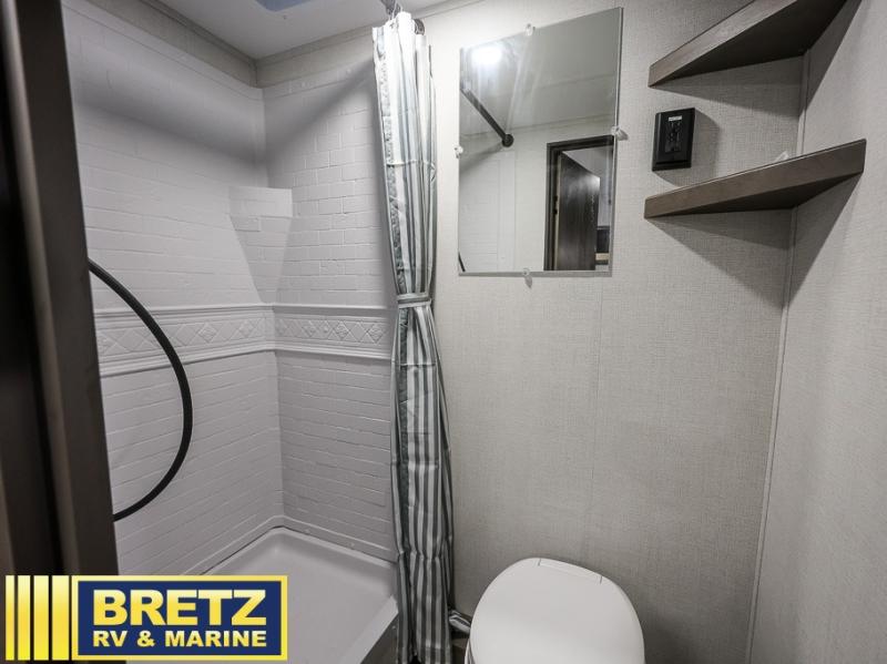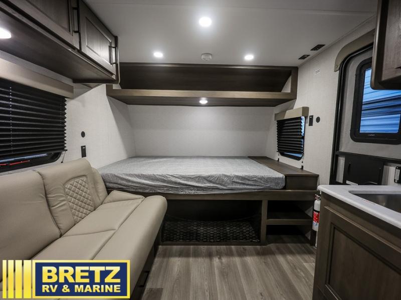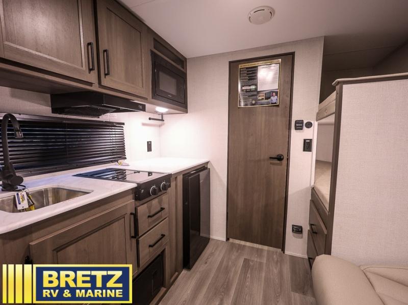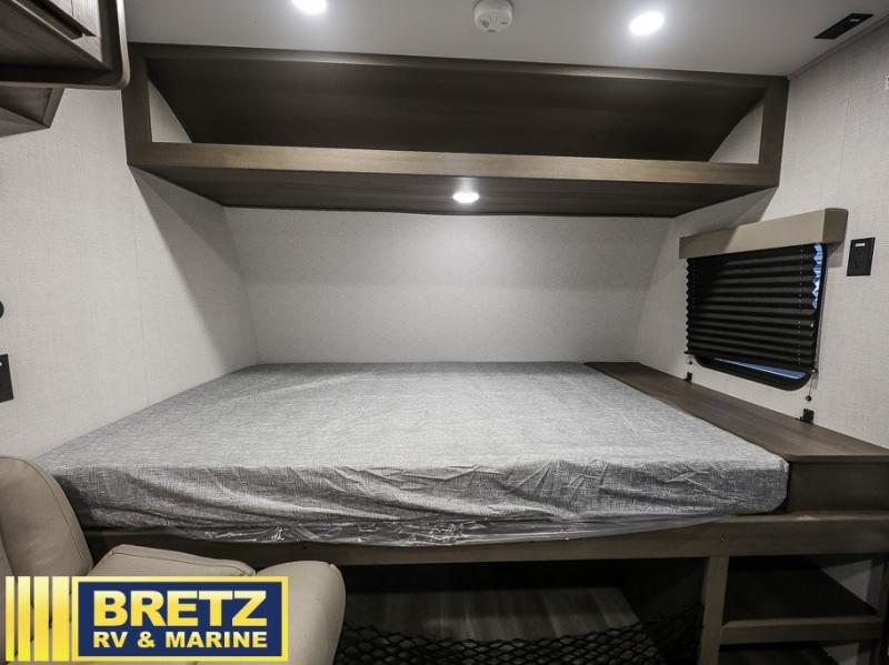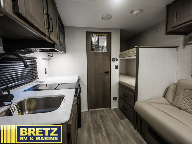 Camping trips to the lake have never been easier than with this travel trailer! The 28" x 67" bunks are right next to the private bath for easy nighttime use, and the front queen bed includes hidden storage for your things. There is also a 66" Jack knife sofa that provides a little more sleeping space for guests. A full kitchen lets you cook meals each day and there is an exterior LP quick connect if you want to fire up your own propane grill.