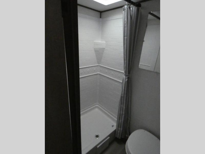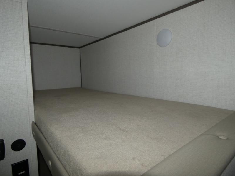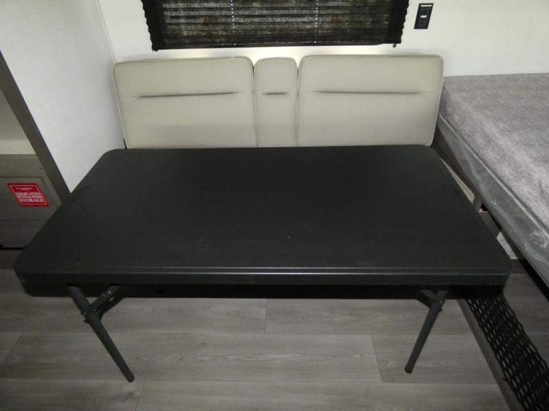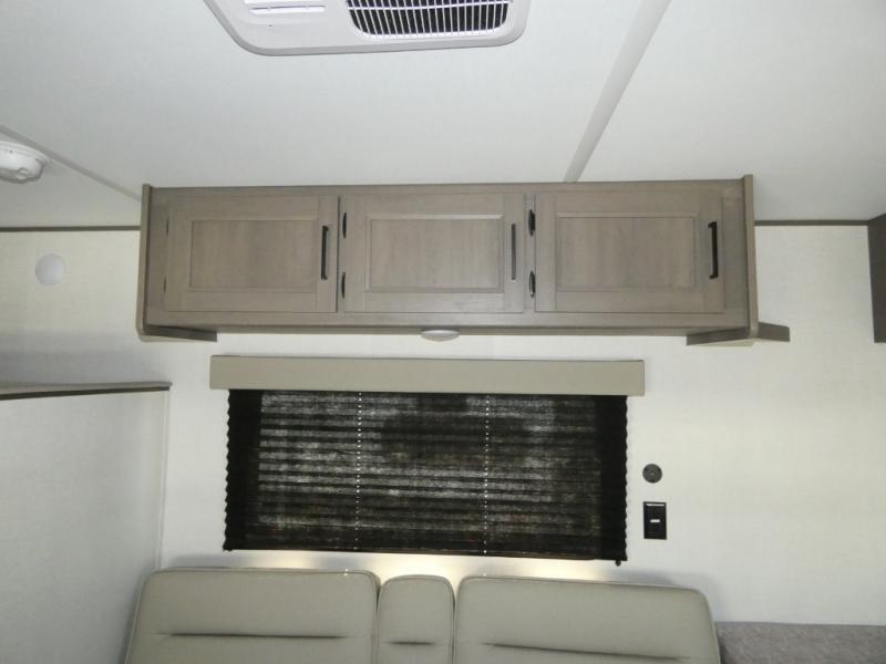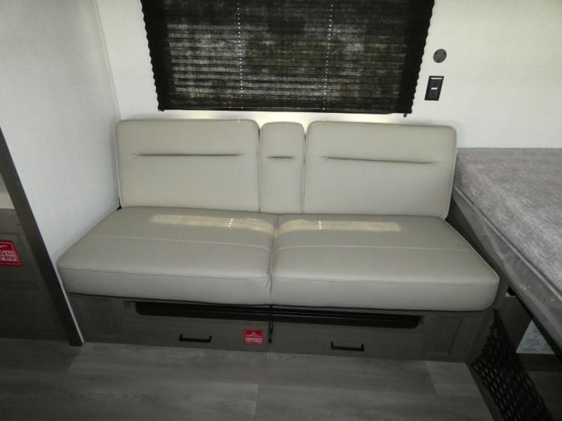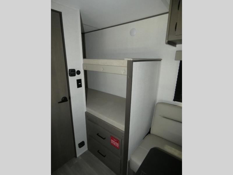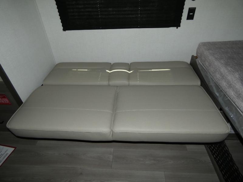 Camping trips to the lake have never been easier than with this travel trailer! The 28" x 67" bunks are right next to the private bath for easy nighttime use, and the front queen bed includes hidden storage for your things. There is also a 66" Jack knife sofa that provides a little more sleeping space for guests. A full kitchen lets you cook meals each day and there is an exterior LP quick connect if you want to fire up your own propane grill.