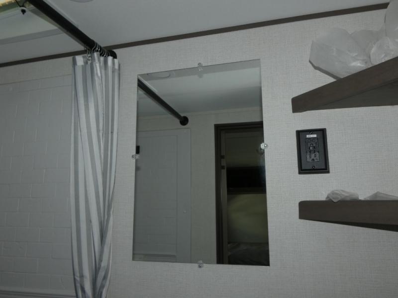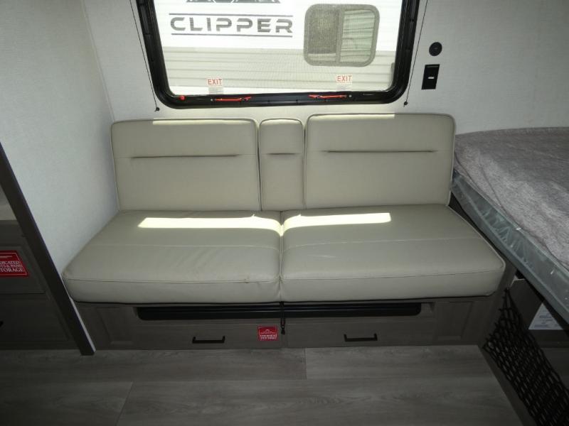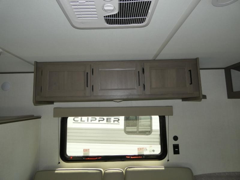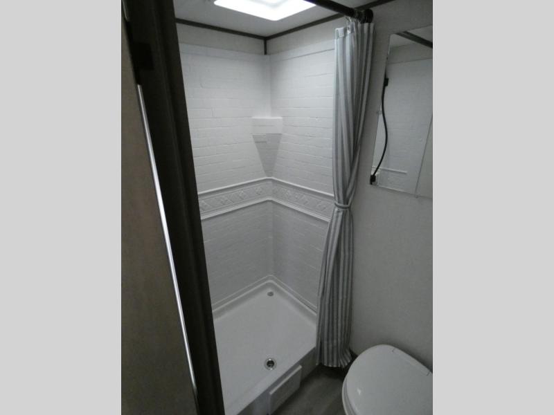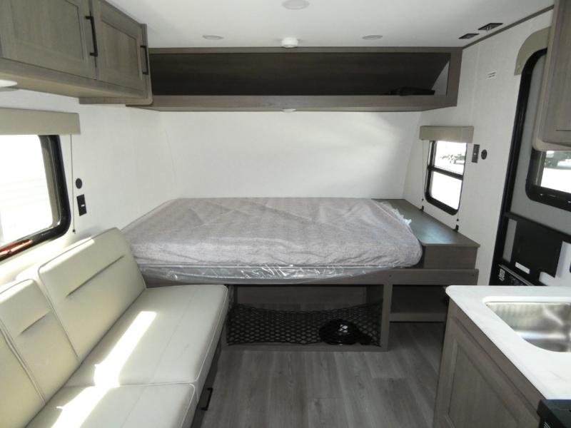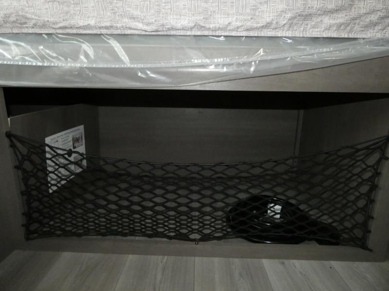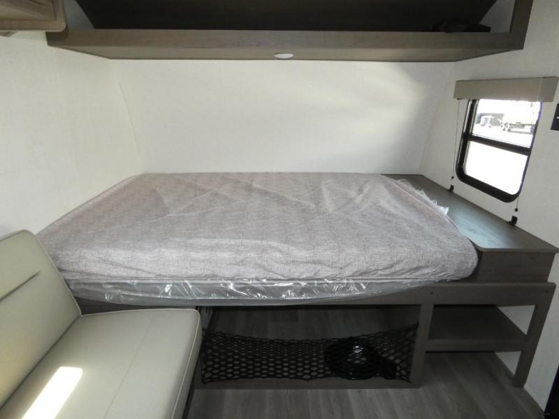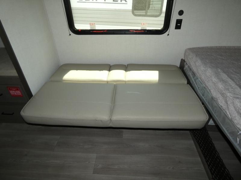 Camping trips to the lake have never been easier than with this travel trailer! The 28" x 67" bunks are right next to the private bath for easy nighttime use, and the front queen bed includes hidden storage for your things. There is also a 66" Jack knife sofa that provides a little more sleeping space for guests. A full kitchen lets you cook meals each day and there is an exterior LP quick connect if you want to fire up your own propane grill.