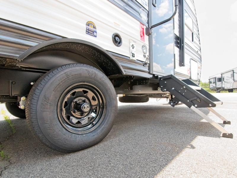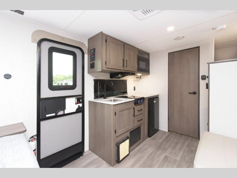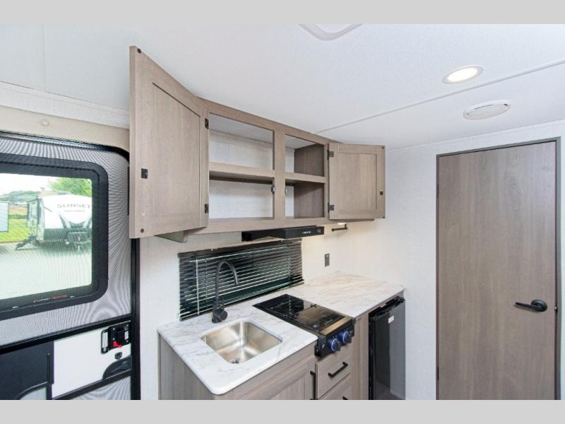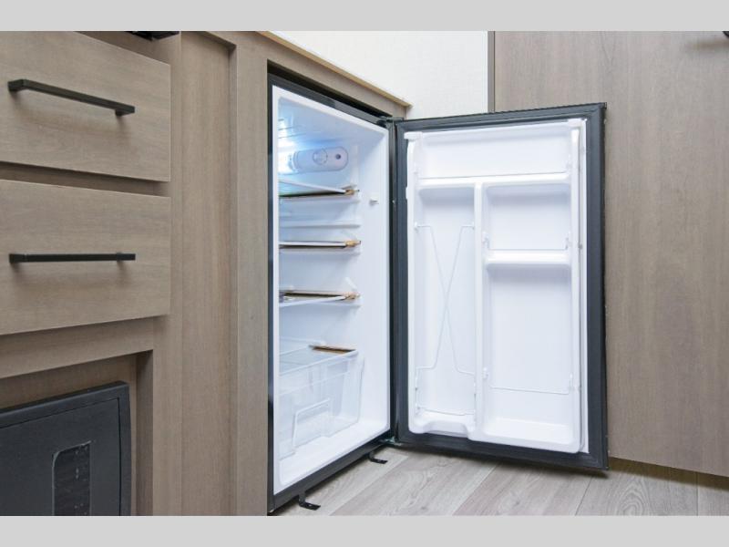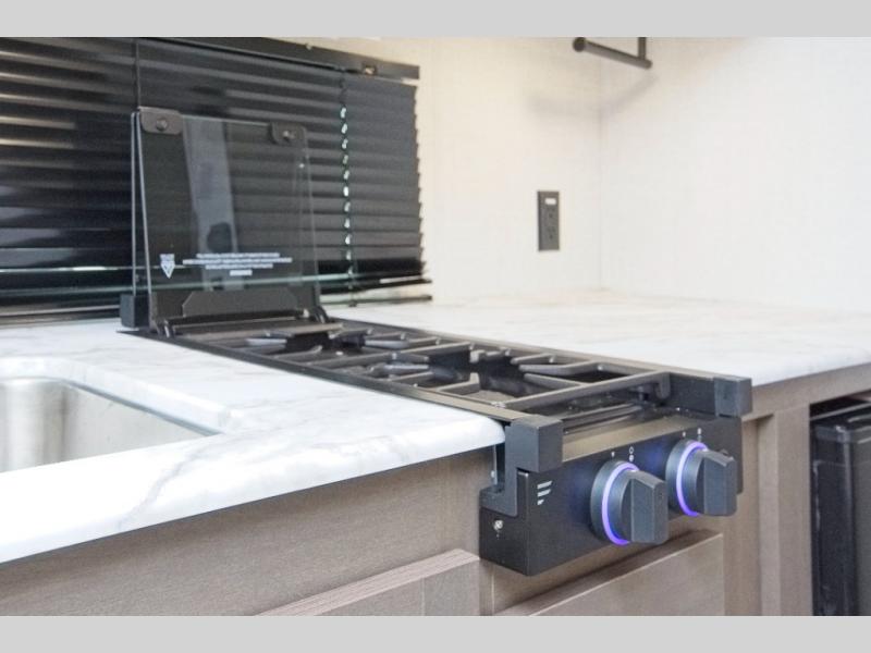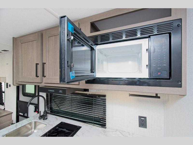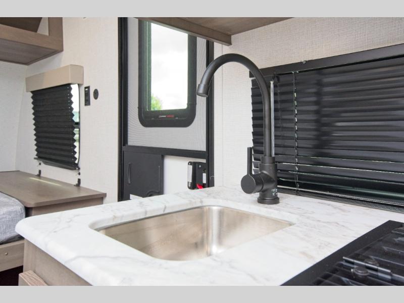 The fully equipped kitchen includes everything you need to prepare meals on the road, and the exterior LP quick connect lets you hook up your own propane grill for outdoor cooking.