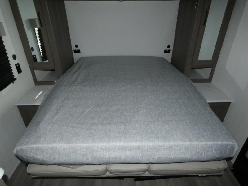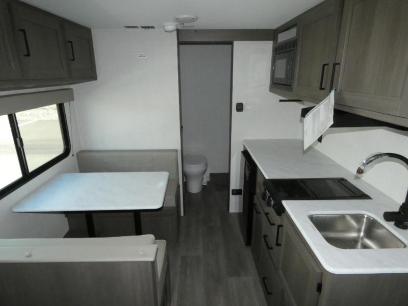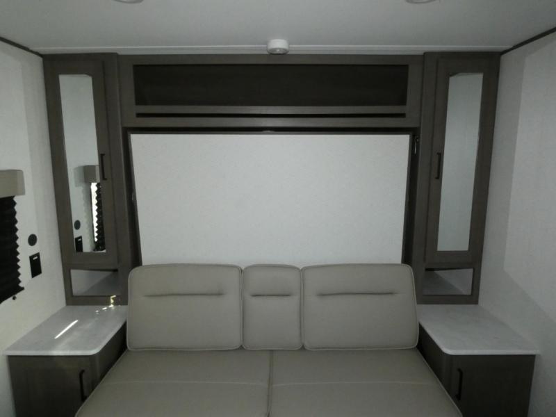 This is the perfect couple's trailer with versatile seating and sleeping space! You'll find a queen-size Murphy bed up front with storage space beside and above plus a full rear bath for added privacy. Once you've made lunch in the full kitchen, you can dine at the booth dinette, or take your plate outdoors to sit under the 10' power awning. You'll also find an unobstructed pass-thru storage outside that will be perfect for fishing poles, lawn chairs, tools and more!