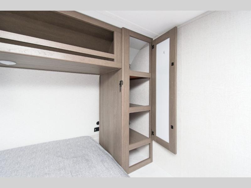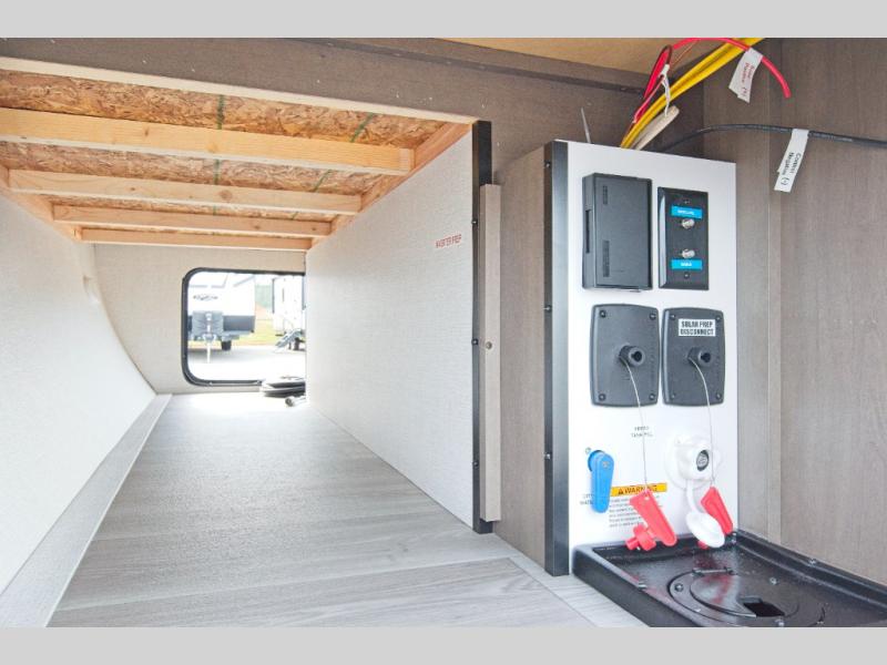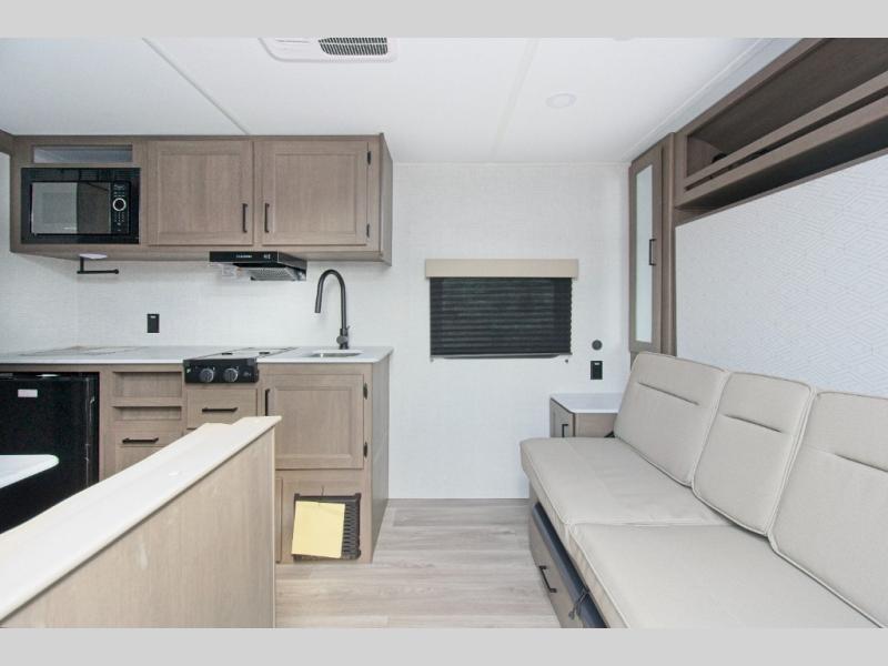 The Transcend One 151RB is thoughtfully designed to maximize space and comfort. The queen-sized Murphy bed offers a cozy sleeping area that can be easily tucked away to create more living space during the day. Enjoy a full rear bath, providing privacy and convenience, whether you're at the campsite or on the road. The booth dinette is perfect for meals or relaxing, and the 10' power awning extends your living space outdoors. Plus, the unobstructed pass-thru storage is perfect for stowing fishing gear, lawn chairs, and other essentials.