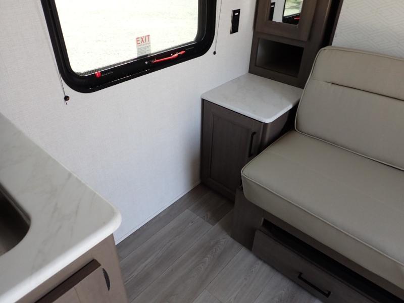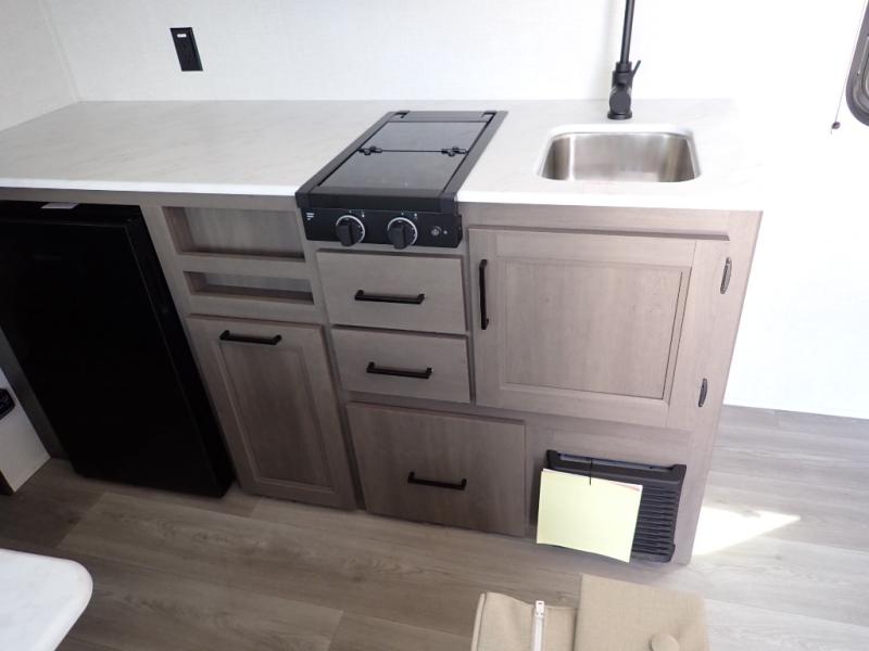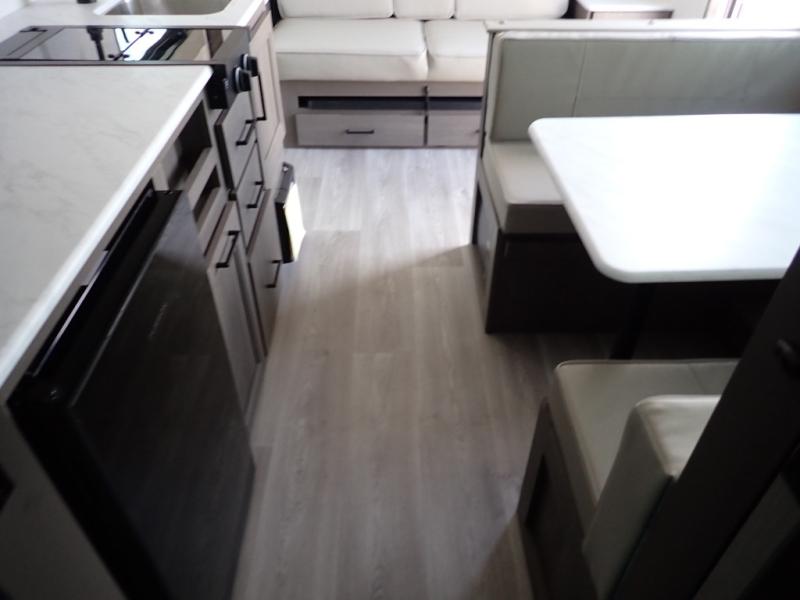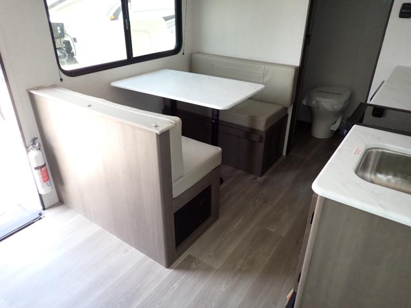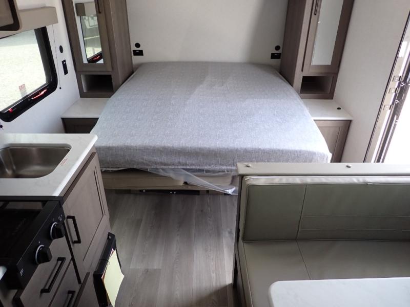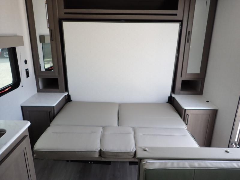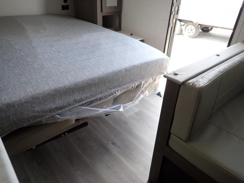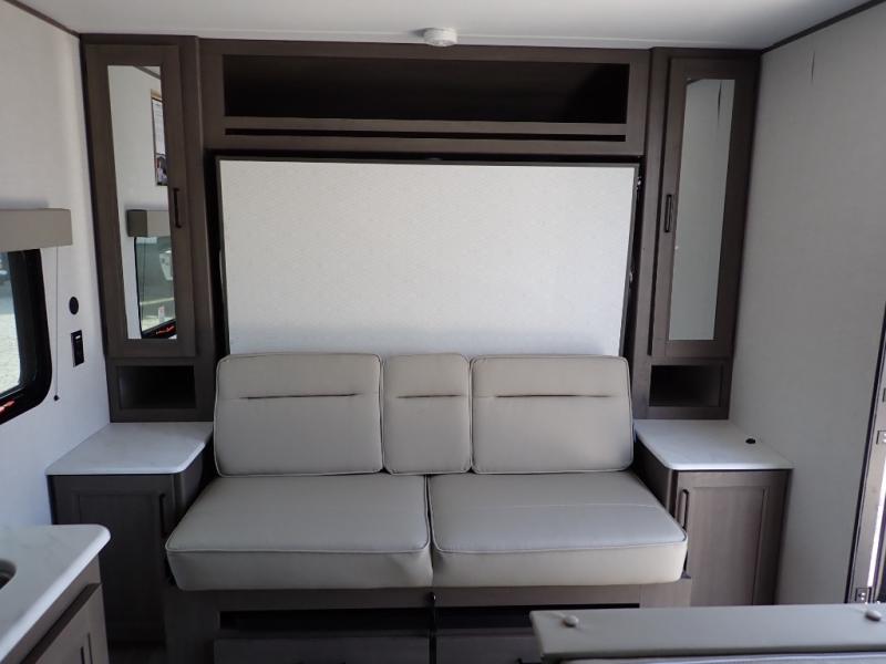 This is the perfect couple's trailer with versatile seating and sleeping space! You'll find a queen-size Murphy bed up front with storage space beside and above plus a full rear bath for added privacy. Once you've made lunch in the full kitchen, you can dine at the booth dinette, or take your plate outdoors to sit under the 10' power awning with an LED light. You'll also find an unobstructed pass-thru storage outside that will be perfect for fishing poles, lawn chairs, tools and more!