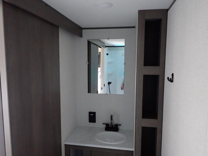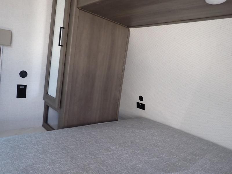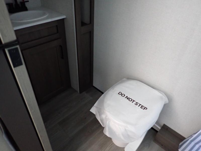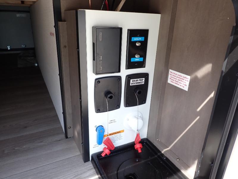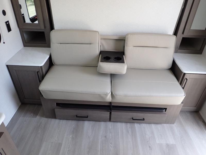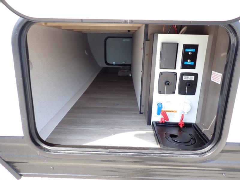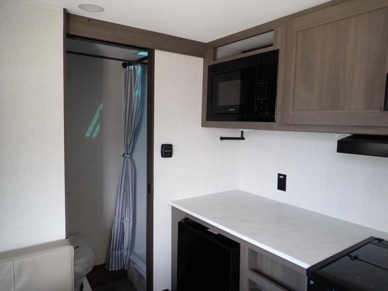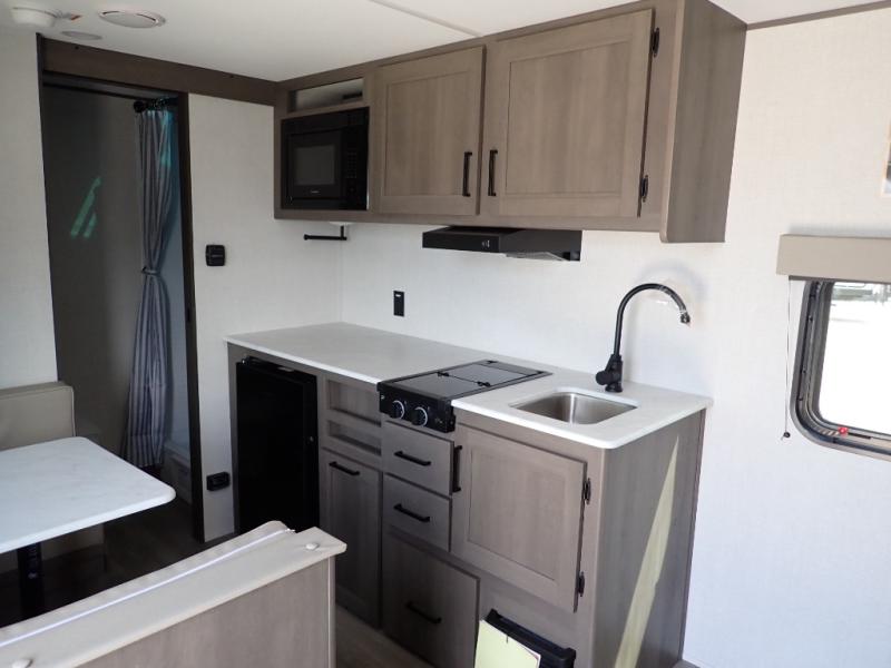 This is the perfect couple's trailer with versatile seating and sleeping space! You'll find a queen-size Murphy bed up front with storage space beside and above plus a full rear bath for added privacy. Once you've made lunch in the full kitchen, you can dine at the booth dinette, or take your plate outdoors to sit under the 10' power awning with an LED light. You'll also find an unobstructed pass-thru storage outside that will be perfect for fishing poles, lawn chairs, tools and more!