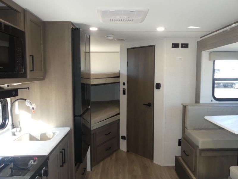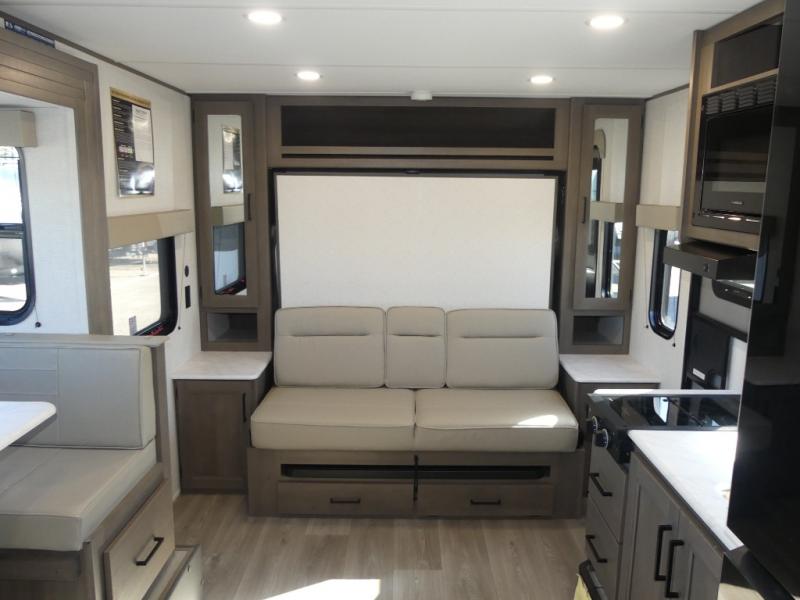 Spacious and versatile, this travel trailer is perfect for weekend trips to the campground or weeklong visits to the lake! There is a front Murphy bed with storage on both sides plus a pull-out pet drawer to keep your furry friends happy. Your guests or little ones will love the double-size bunks with privacy curtains, and the full bath is right next to the bunks for easy nighttime use. Once you make breakfast on the two burner range, you can dine at the booth dinette slide. And this model also includes an outdoor griddle and refrigerator if you want to make breakfast outdoors. Additional exterior features include a 16' power awning, an interior/exterior table, and a pass-thru storage for larger camp gear.