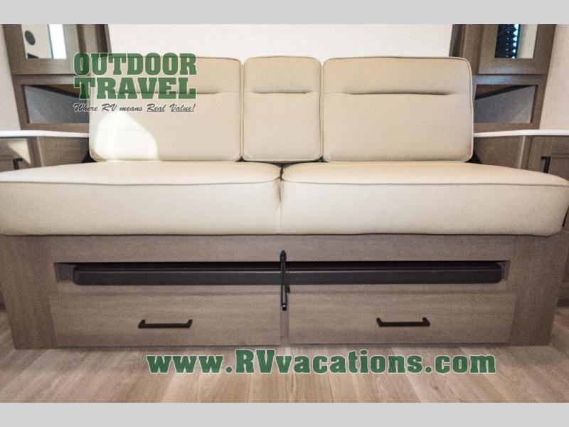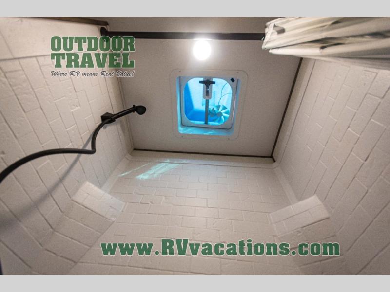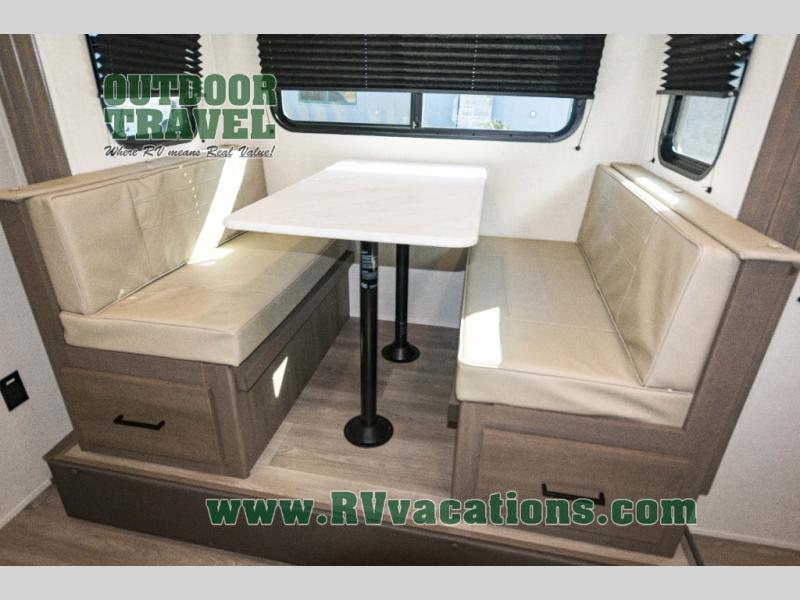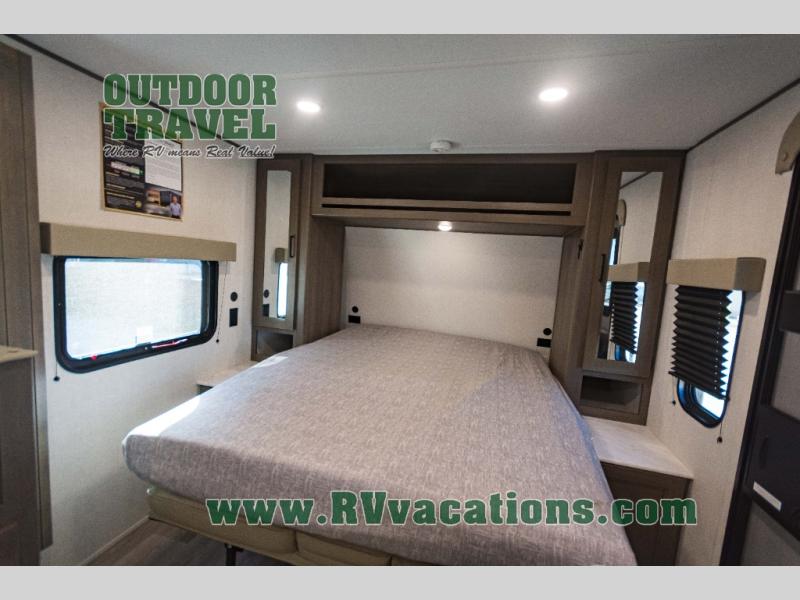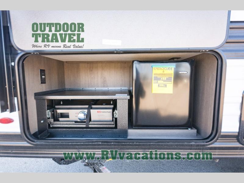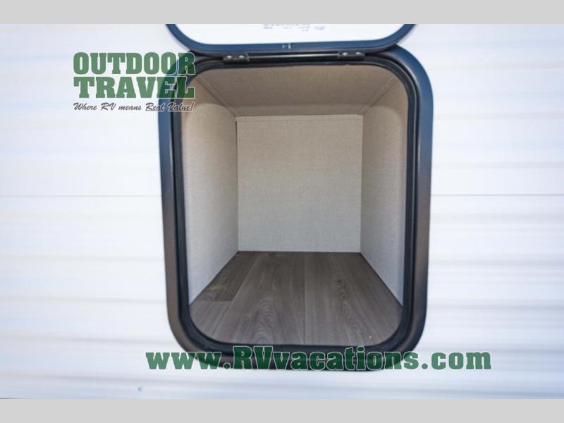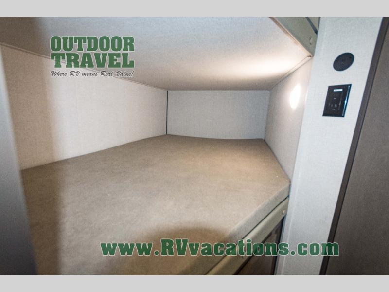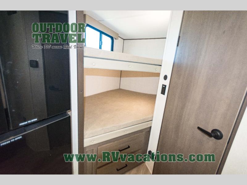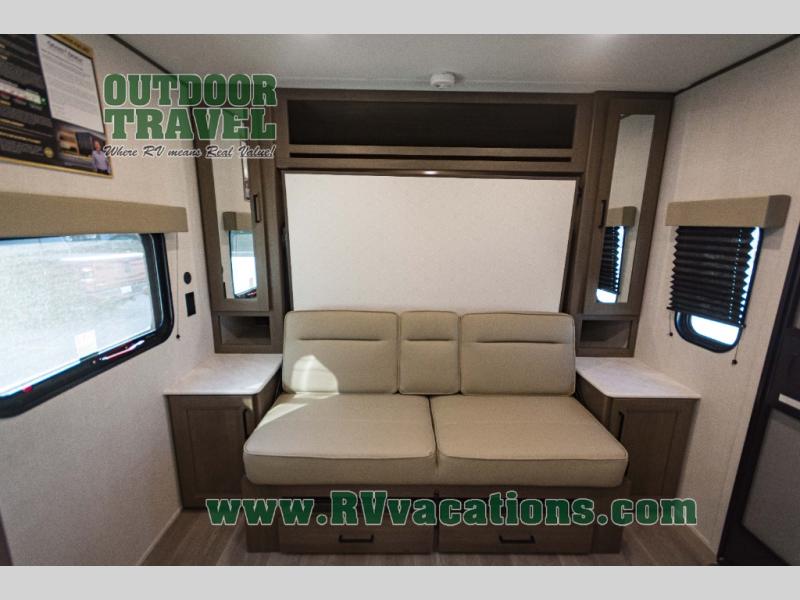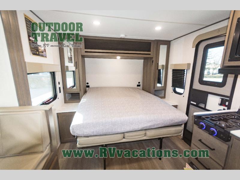 Spacious and versatile, this travel trailer is perfect for weekend trips to the campground or weeklong visits to the lake! There is a front Murphy bed with storage on both sides plus a pull-out pet drawer to keep your furry friends happy. Your guests or little ones will love the double-size bunks with privacy curtains, and the full bath is right next to the bunks for easy nighttime use. Once you make breakfast on the two burner range, you can dine at the booth dinette slide. And this model also includes an outdoor griddle and refrigerator if you want to make breakfast outdoors. Additional exterior features include a 16' power awning, an interior/exterior table, and a pass-thru storage for larger camp gear.