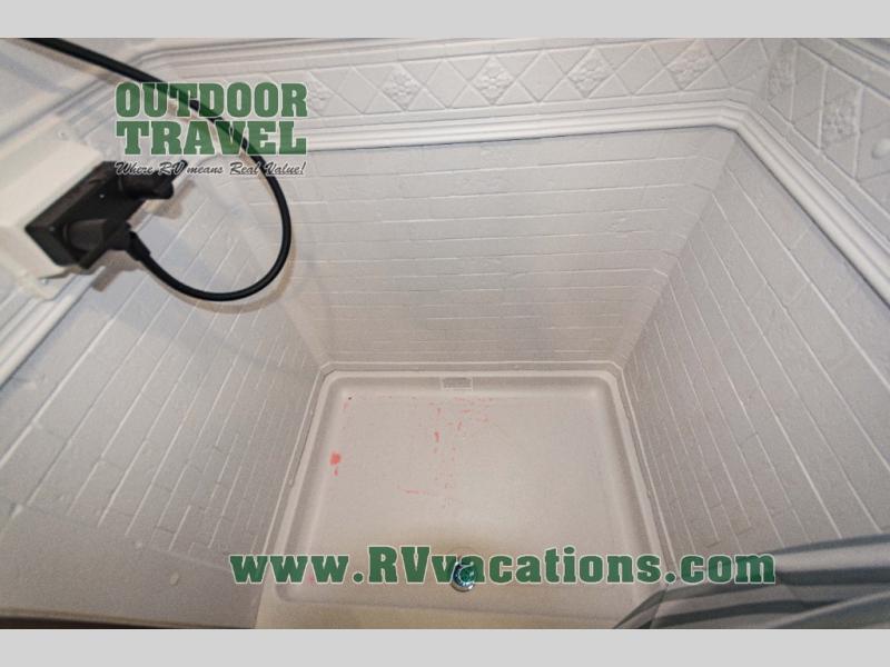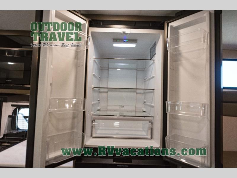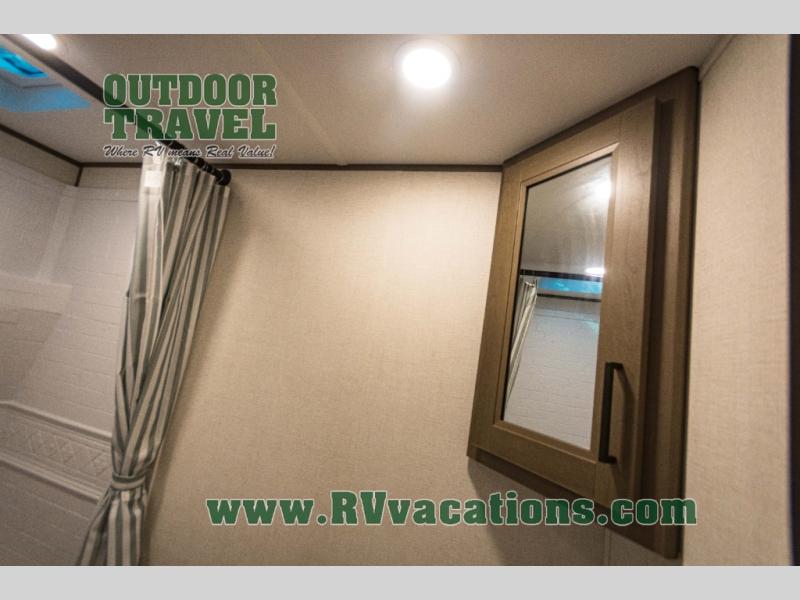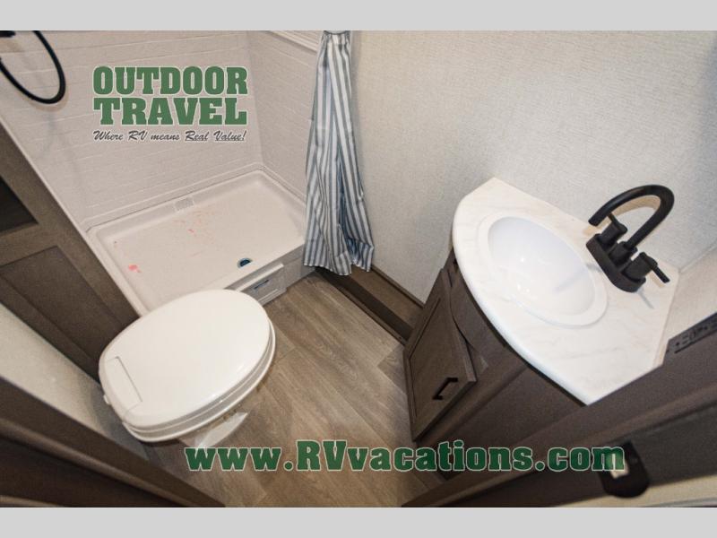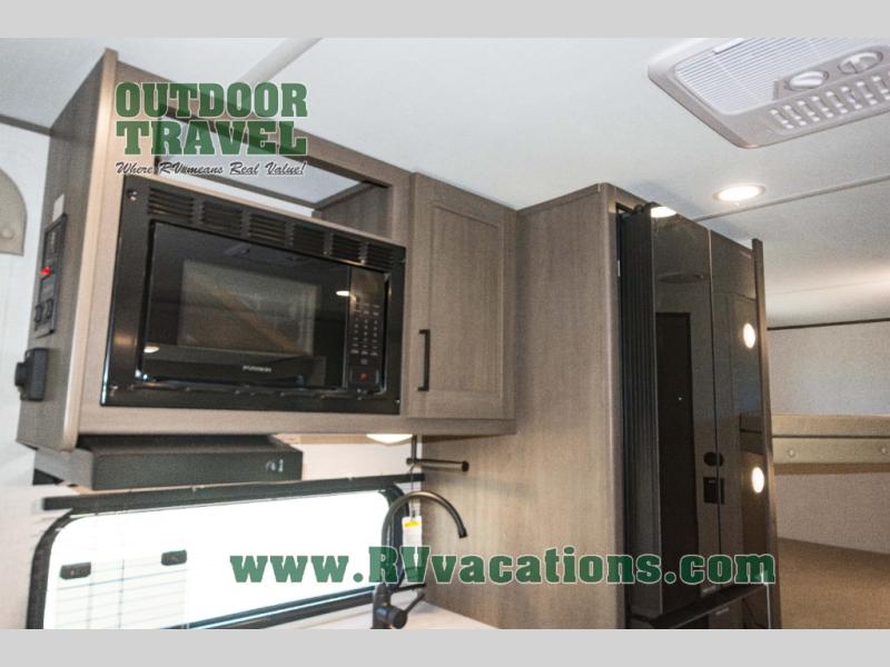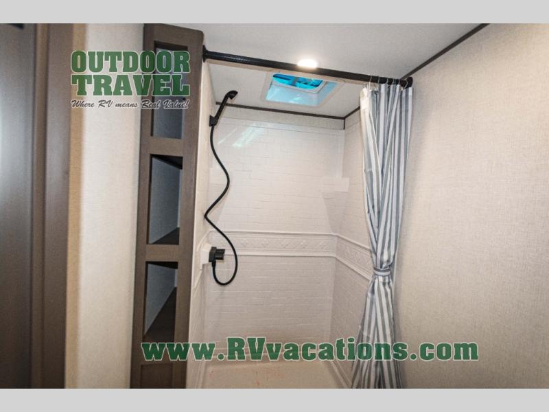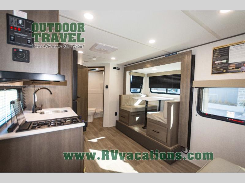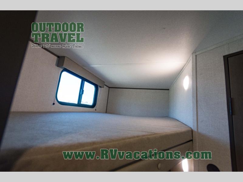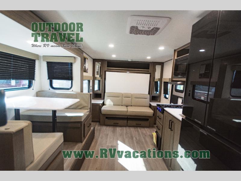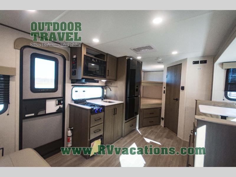 Spacious and versatile, this travel trailer is perfect for weekend trips to the campground or weeklong visits to the lake! There is a front Murphy bed with storage on both sides plus a pull-out pet drawer to keep your furry friends happy. Your guests or little ones will love the double-size bunks with privacy curtains, and the full bath is right next to the bunks for easy nighttime use. Once you make breakfast on the two burner range, you can dine at the booth dinette slide. And this model also includes an outdoor griddle and refrigerator if you want to make breakfast outdoors. Additional exterior features include a 16' power awning, an interior/exterior table, and a pass-thru storage for larger camp gear.