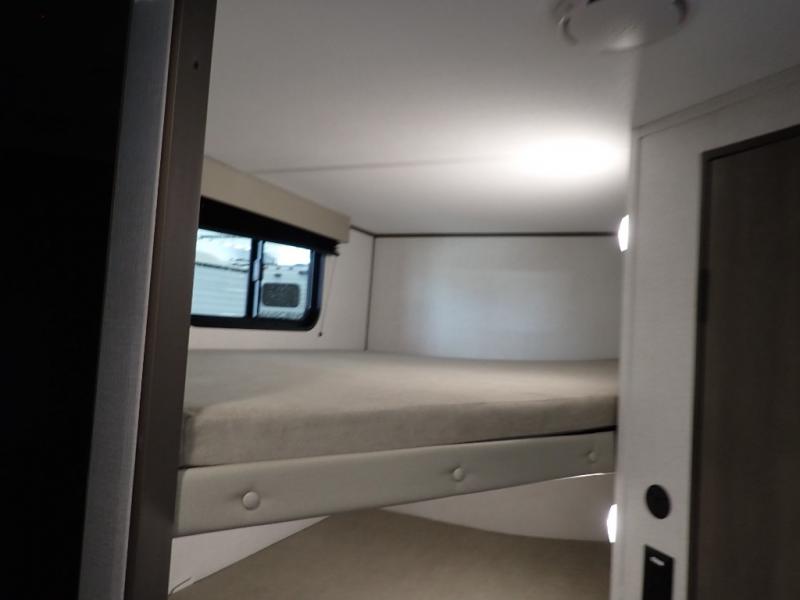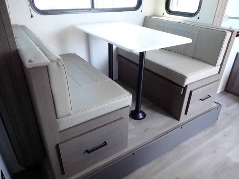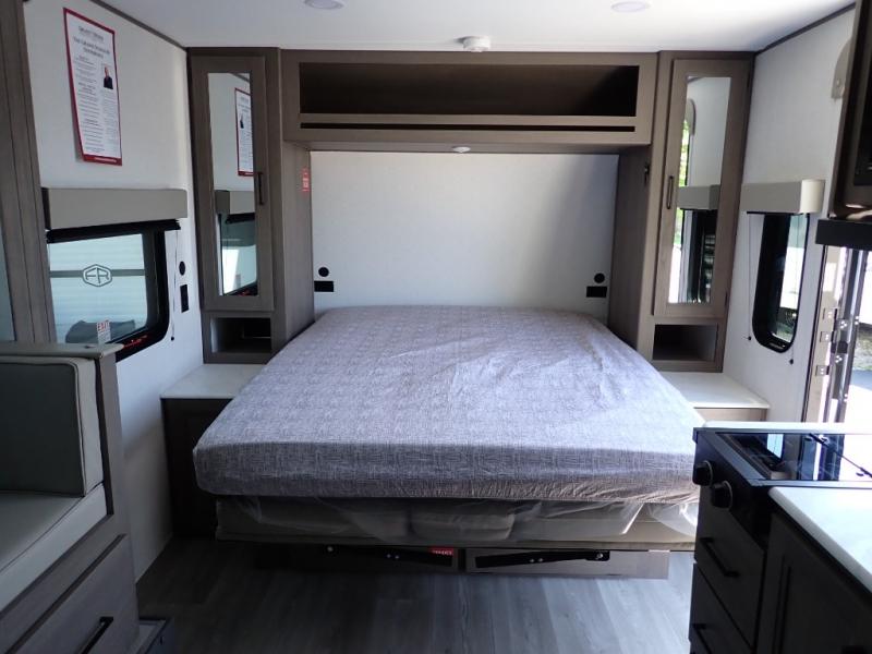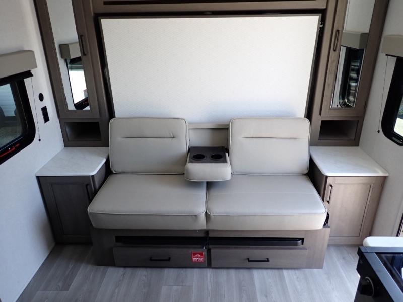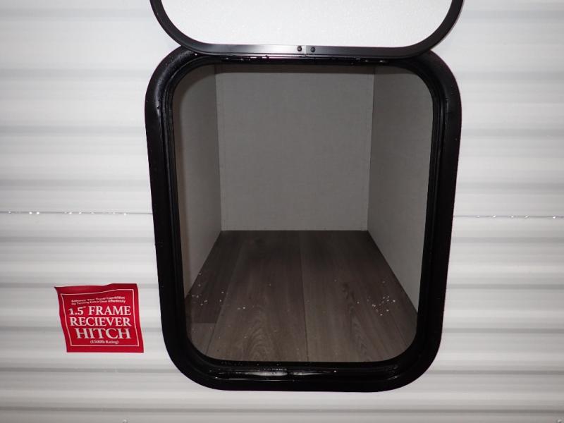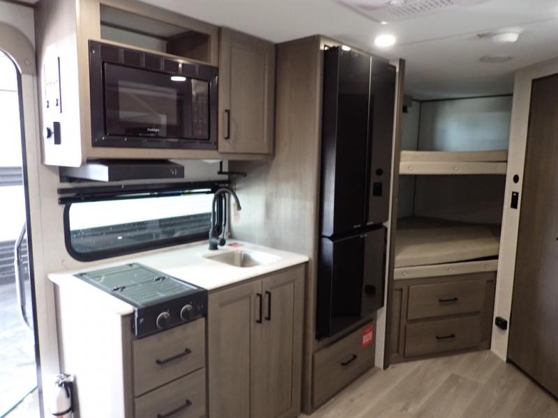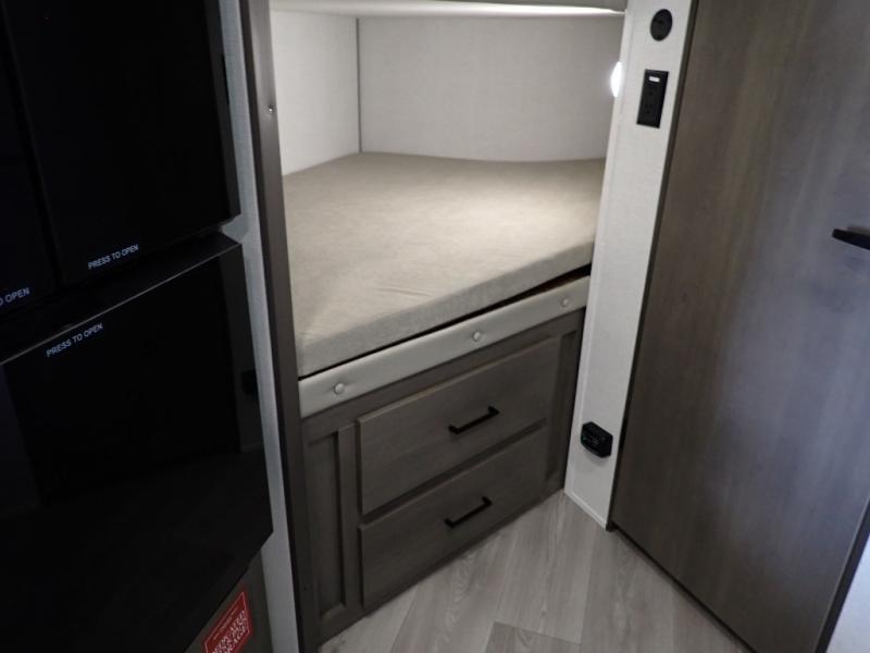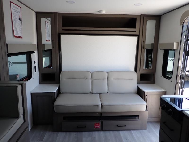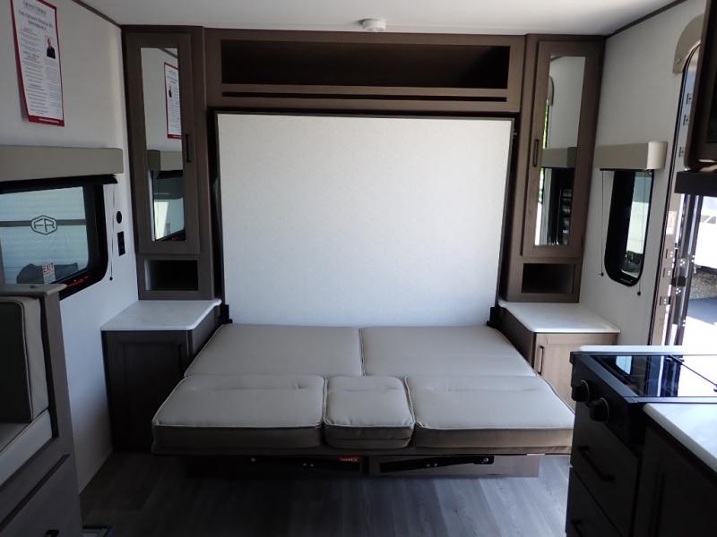 Spacious and versatile, this travel trailer is perfect for weekend trips to the campground or weeklong visits to the lake! There is a front Murphy bed with storage on both sides plus a pull-out pet drawer to keep your furry friends happy. Your guests or little ones will love the double-size bunks with privacy curtains, and the full bath is right next to the bunks for easy nighttime use. Once you make breakfast on the two burner range, you can dine at the booth dinette slide. And this model also includes an outdoor griddle and refrigerator if you want to make breakfast outdoors. Additional exterior features include a 16' power awning, an interior/exterior table, and a pass-thru storage for larger camp gear.