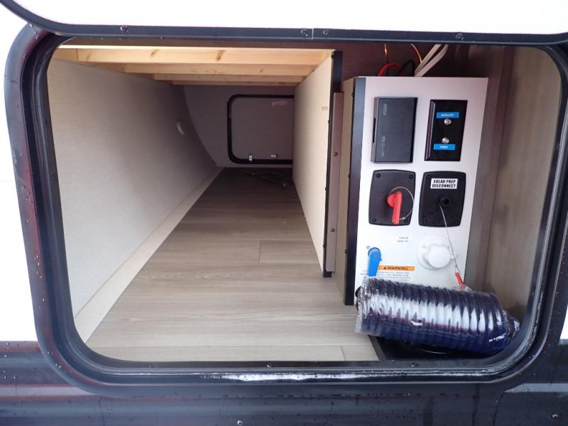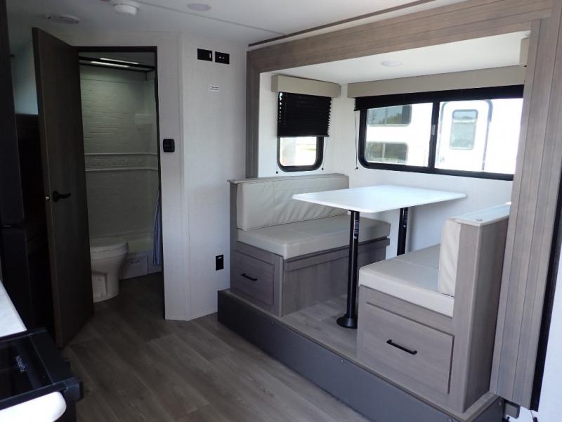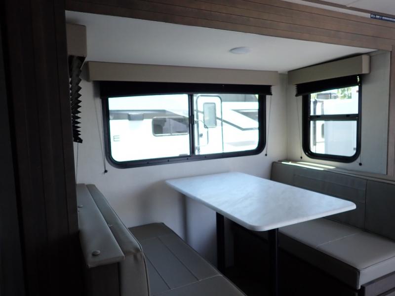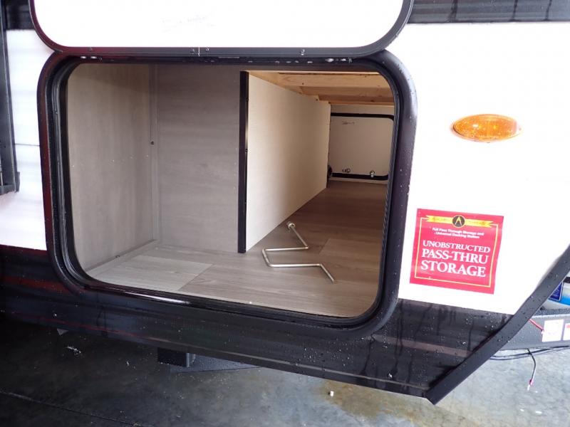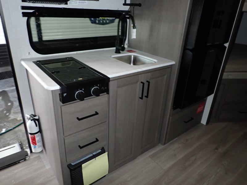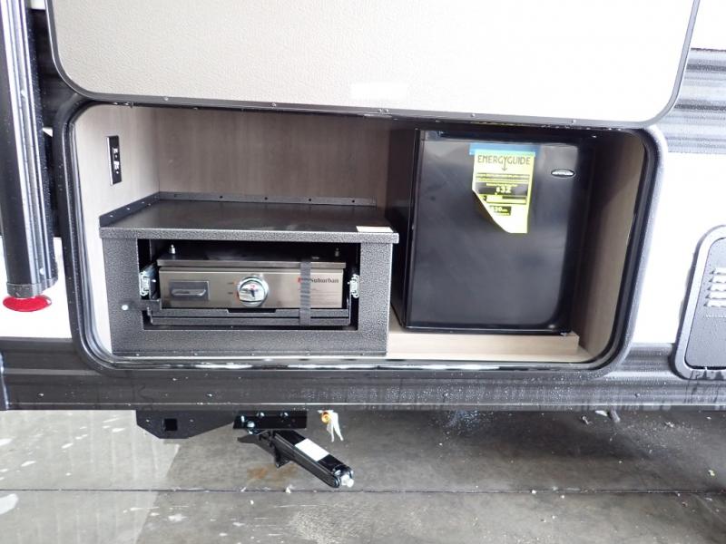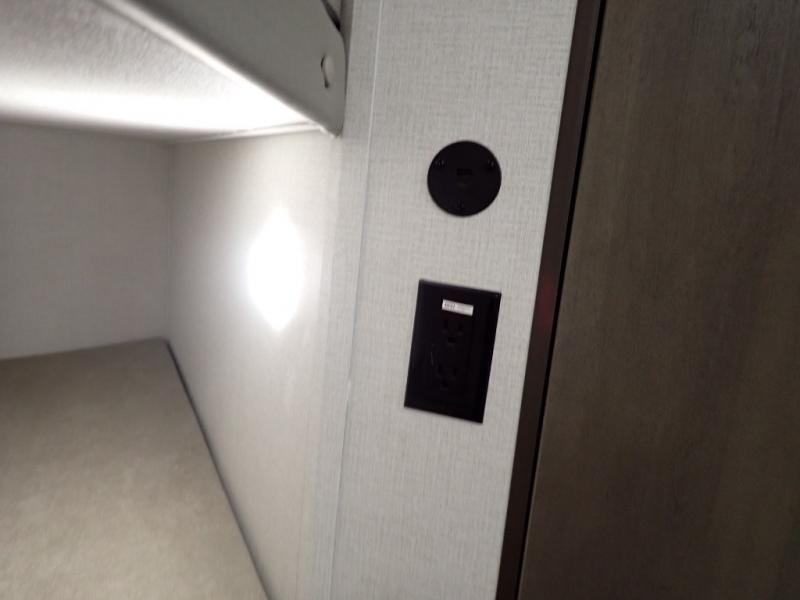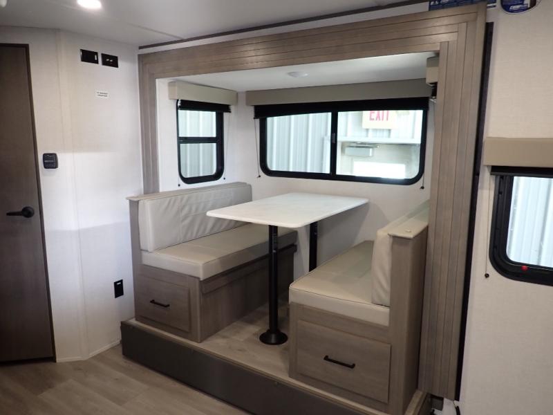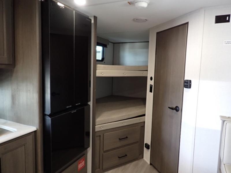 Spacious and versatile, this travel trailer is perfect for weekend trips to the campground or weeklong visits to the lake! There is a front Murphy bed with storage on both sides plus a pull-out pet drawer to keep your furry friends happy. Your guests or little ones will love the double-size bunks with privacy curtains, and the full bath is right next to the bunks for easy nighttime use. Once you make breakfast on the two burner range, you can dine at the booth dinette slide. And this model also includes an outdoor griddle and refrigerator if you want to make breakfast outdoors. Additional exterior features include a 16' power awning, an interior/exterior table, and a pass-thru storage for larger camp gear.