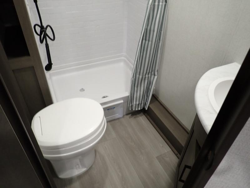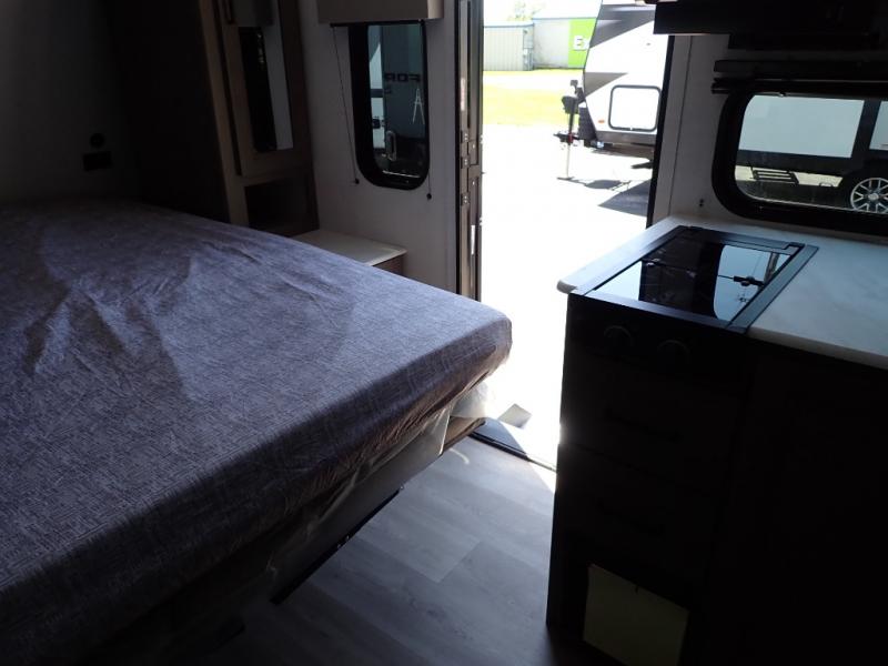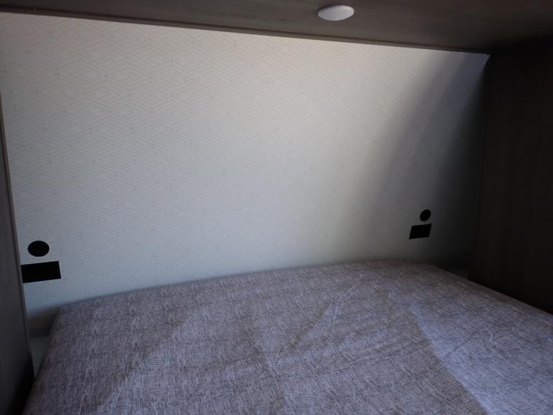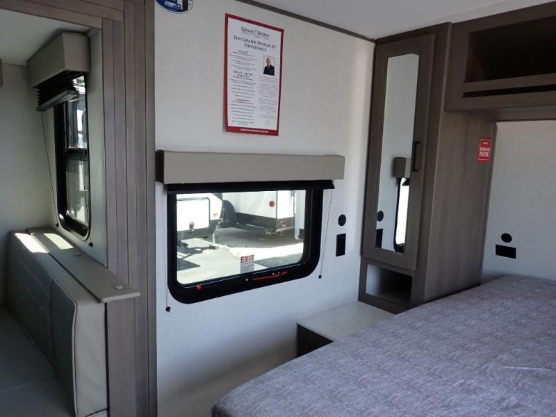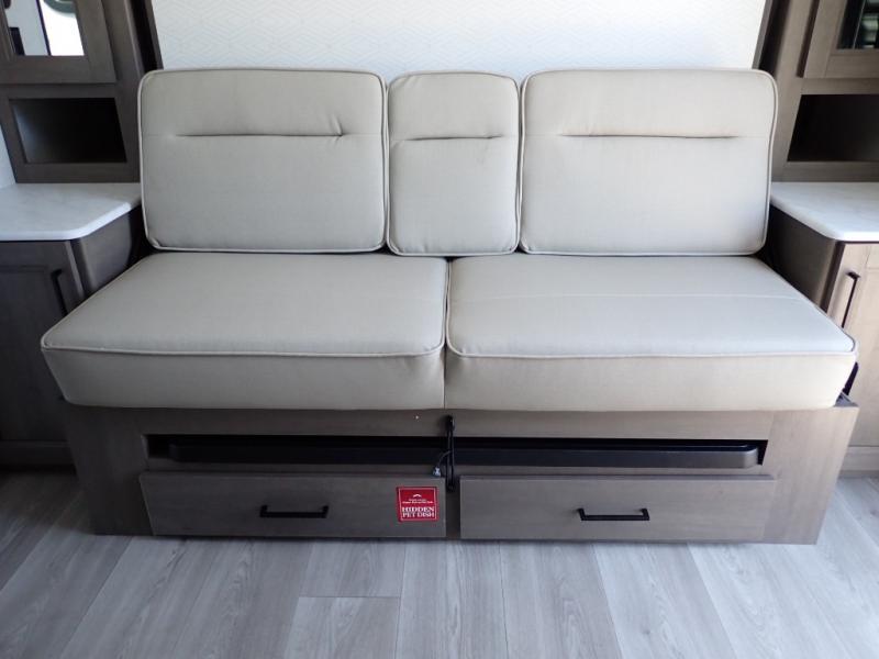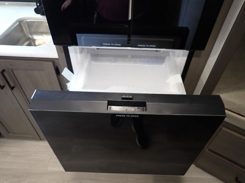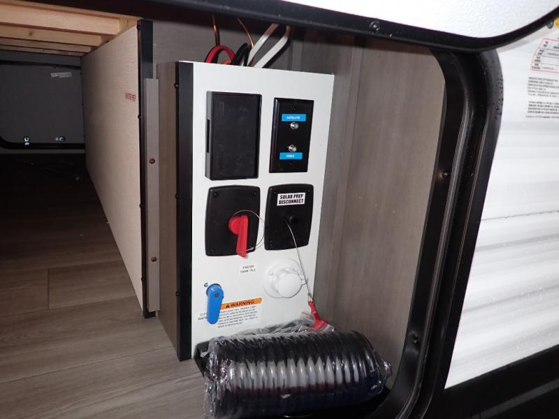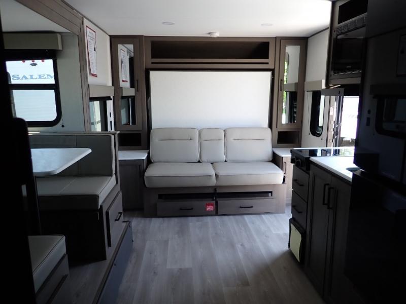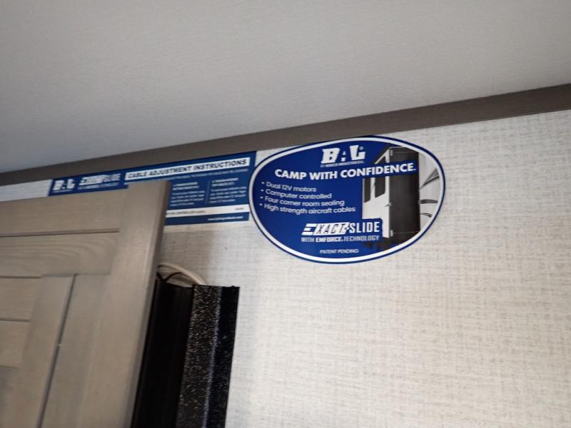 Spacious and versatile, this travel trailer is perfect for weekend trips to the campground or weeklong visits to the lake! There is a front Murphy bed with storage on both sides plus a pull-out pet drawer to keep your furry friends happy. Your guests or little ones will love the double-size bunks with privacy curtains, and the full bath is right next to the bunks for easy nighttime use. Once you make breakfast on the two burner range, you can dine at the booth dinette slide. And this model also includes an outdoor griddle and refrigerator if you want to make breakfast outdoors. Additional exterior features include a 16' power awning, an interior/exterior table, and a pass-thru storage for larger camp gear.