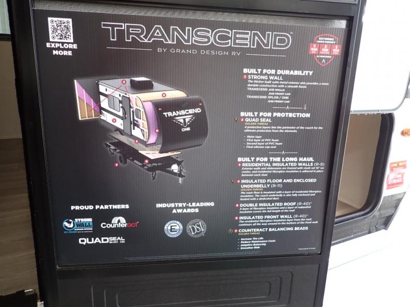 With any Transcend One travel trailer by Grand Design, you will enjoy lightweight towing thanks to their single-axle. There are many interior comforts to make camping easier than ever, such as recessed lighting, residential countertops, and a 6' 6" interior height. Each model is constructed with a heated and enclosed underbelly with suspended tanks, a moisture barrier floor enclosure, and Thermofoil over the roof and front cap for added protection. And a JBL sound system will let you listen to tunes as you visit under the power awning with a Fusion light!