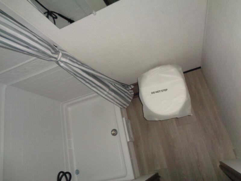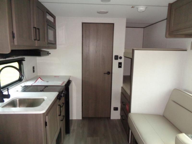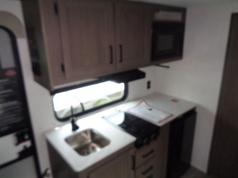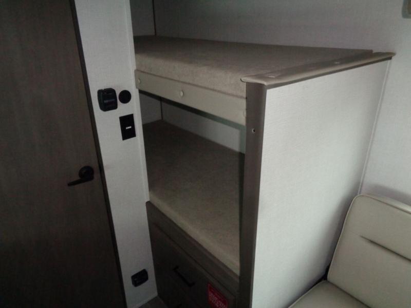 Camping trips to the lake have never been easier than with this travel trailer! The 28" x 67" bunks are right next to the private bath for easy nighttime use, and the front queen bed includes hidden storage for your things. There is also a 66" Jack knife sofa that provides a little more sleeping space for guests. A full kitchen lets you cook meals each day and there is an exterior LP quick connect if you want to fire up your own propane grill.