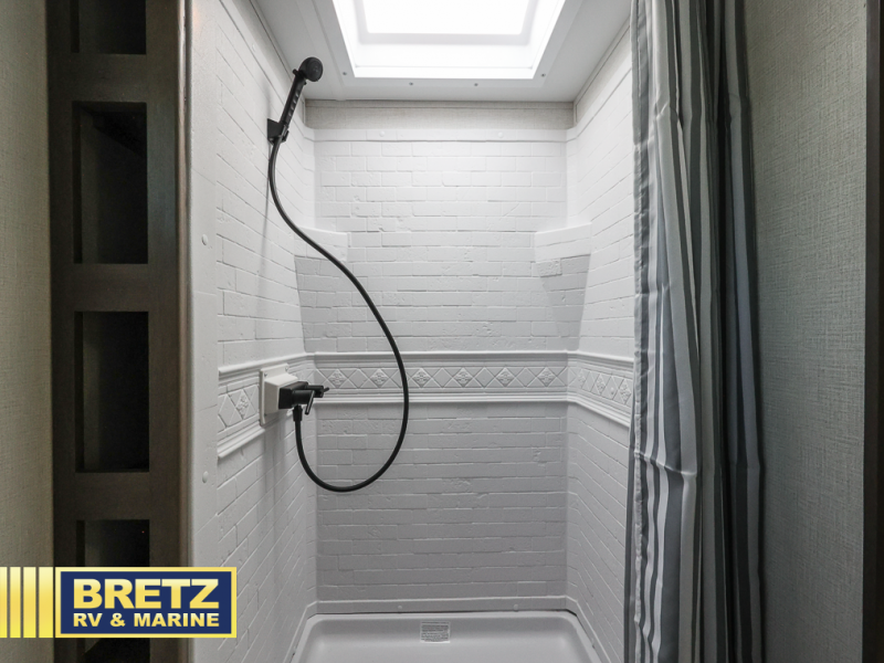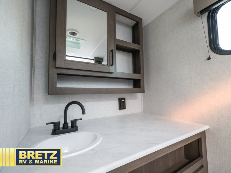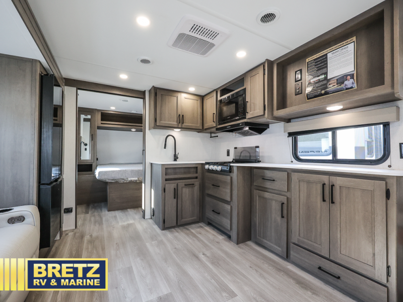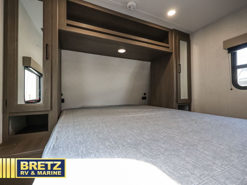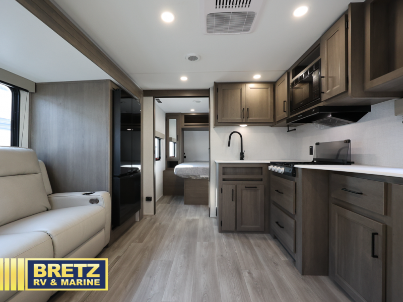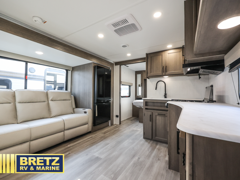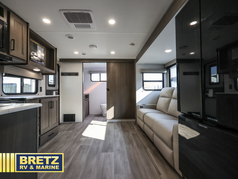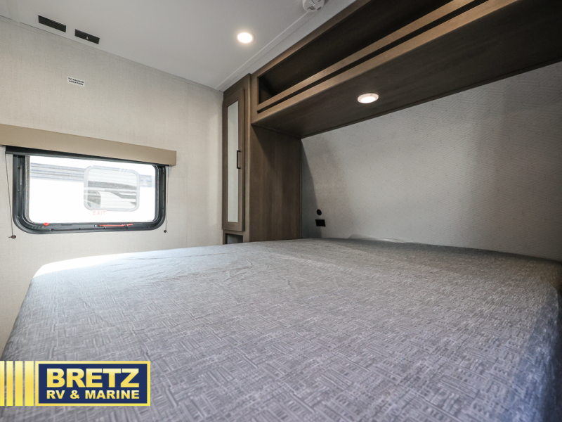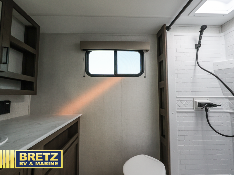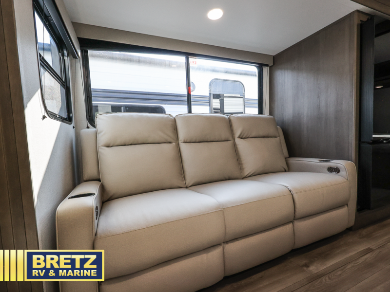 Pack your bags and head for the campground in this spacious travel trailer! Once you arrive, you can unload the pass-thru storage, then make lunch on the exterior griddle with a 1.7 cu. ft. exterior refrigerator. The U-shaped dinette slide will provide a place to dine if you decide not to stay outside under the 16' power awning. Optional theater seats can be chosen in place of the dinette for even more comfort! You'll sleep soundly on the queen bed in the front bedroom, and the full rear bath lets you freshen up each day.