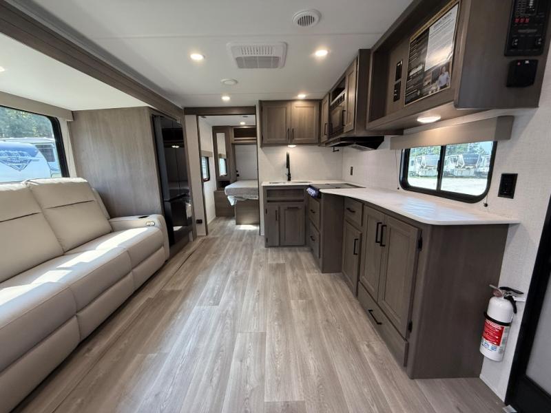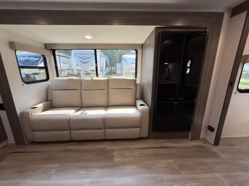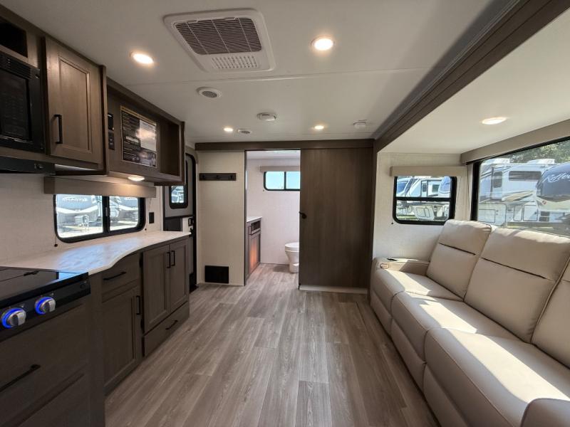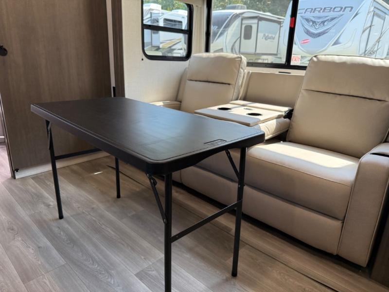 The large slide-out opens up the interior, creating an open and airy main living space perfect for relaxing, working remotely, or dining in style.