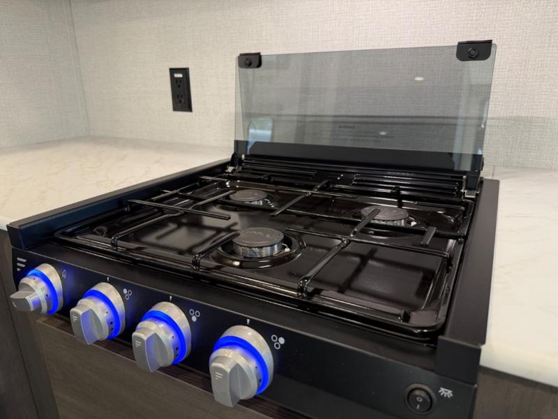 Whip up your favorite meals in the spacious galley, featuring a 3-burner range with oven, microwave, deep stainless steel sink, large refrigerator, and plenty of countertop space.