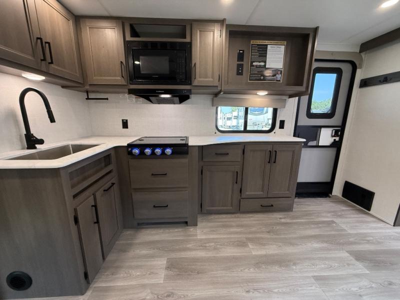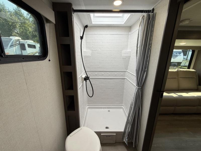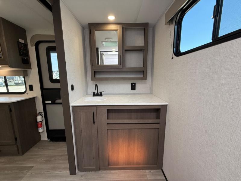Enjoy a rare luxury in a compact trailer—a full-size rear bathroom! Complete with a walk-in shower, linen storage, vanity, and room to breathe, this rear bath layout gives you the privacy and convenience you’ll appreciate at every stop.