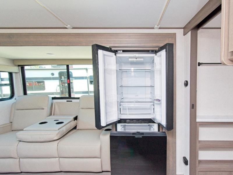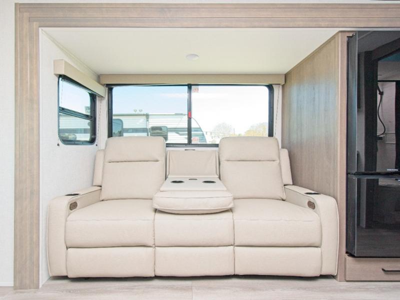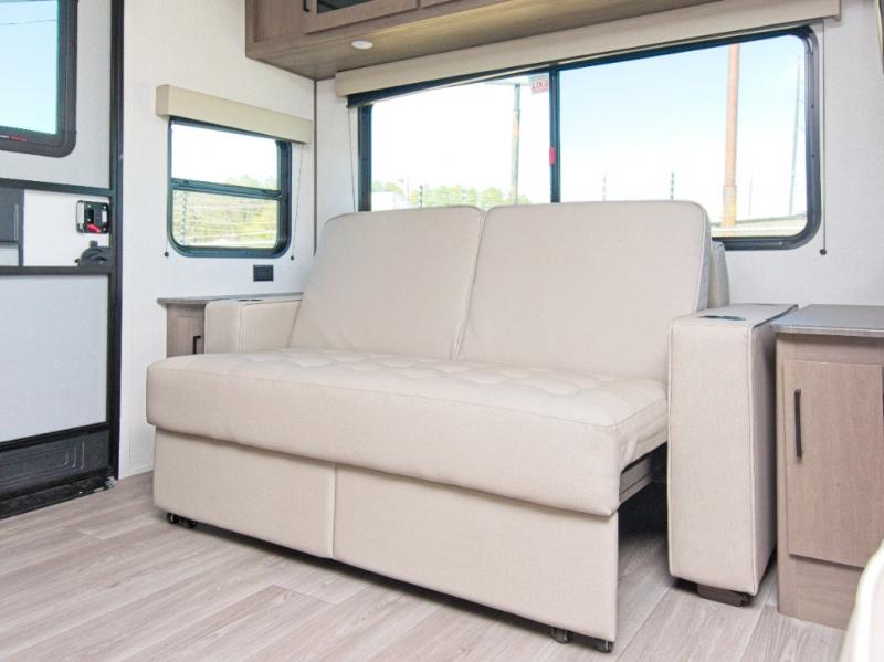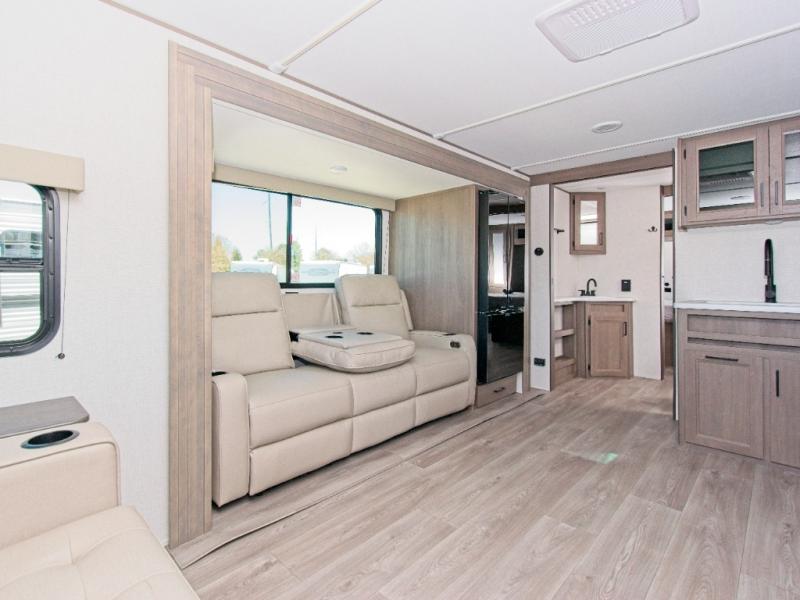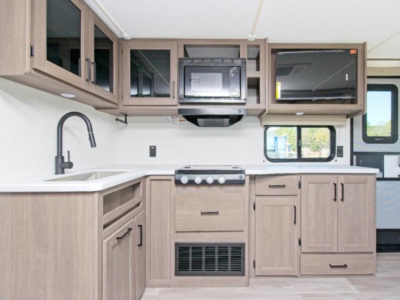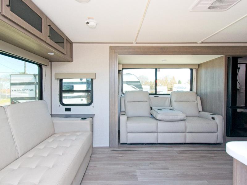 Perfect for Lake Camping Adventures: Elevate your camping experience with the Grand Design Transcend 245RLT, designed for comfort and convenience. The dual entry doors provide easy access, while the U-shaped dinette slide expands your living space. Switch out the dinette for optional theater seats if you prefer. The rear 70" sleeper sofa is ideal for guests, and the 32" TV ensures enjoyable movie nights. Cook delicious meals on the three-burner range and convection microwave/combo air fryer, or use the exterior griddle with a 1.7 cu. ft. refrigerator. The 17' power awning offers shade for relaxing with friends.