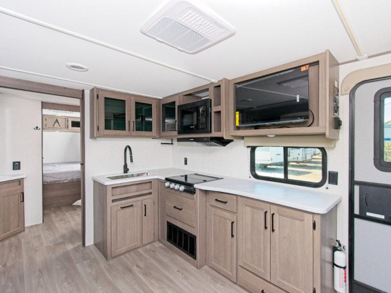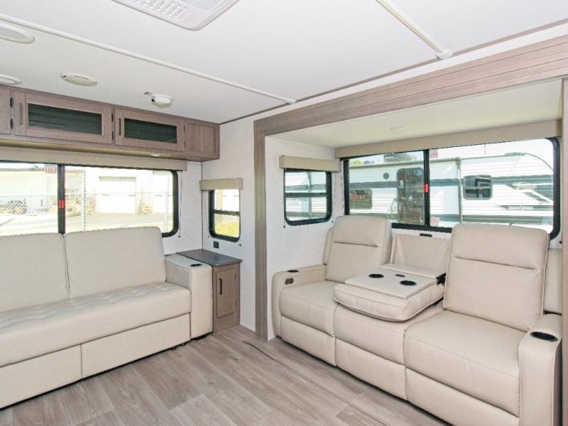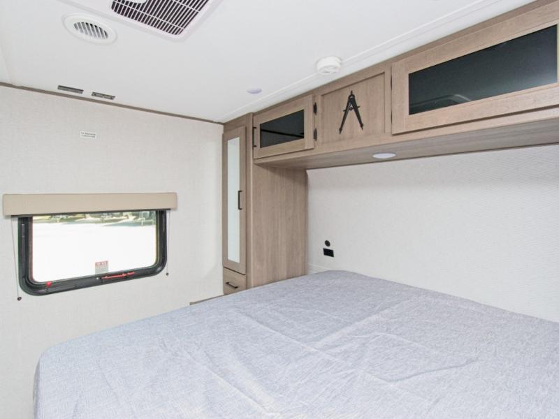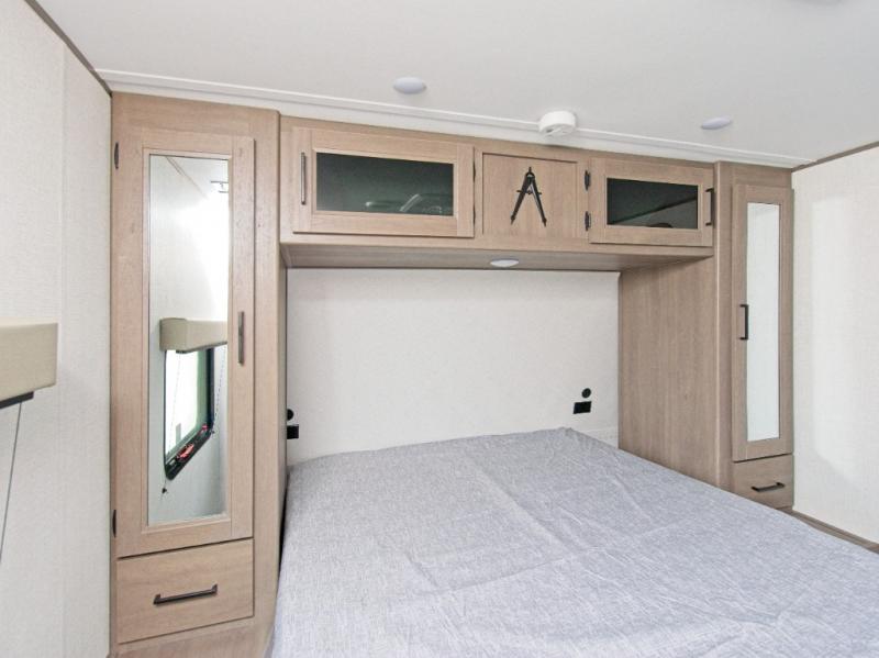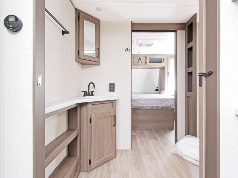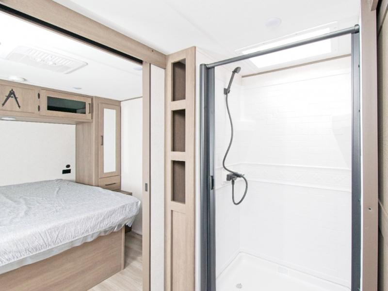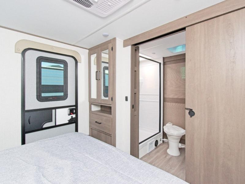 Spacious and Convenient Interior: The walk-thru bath connects the main living area to the front master bedroom, featuring a queen bed, ample storage, and TV prep. Enjoy the convenience of your own exterior entry door.