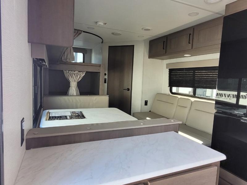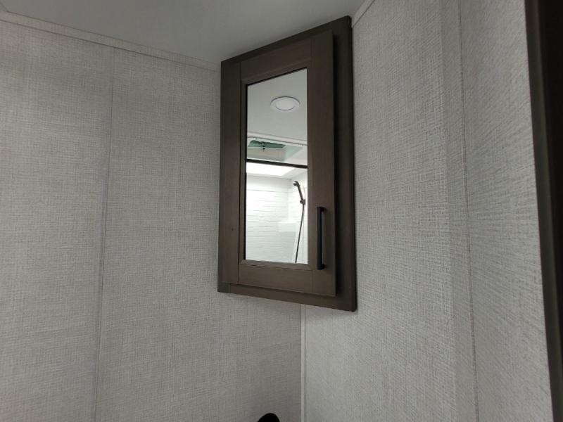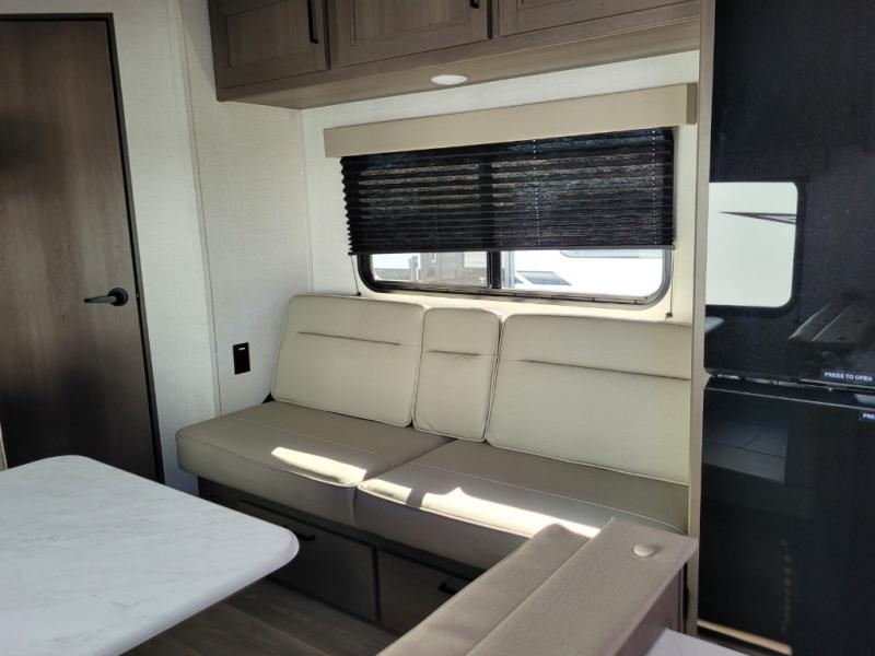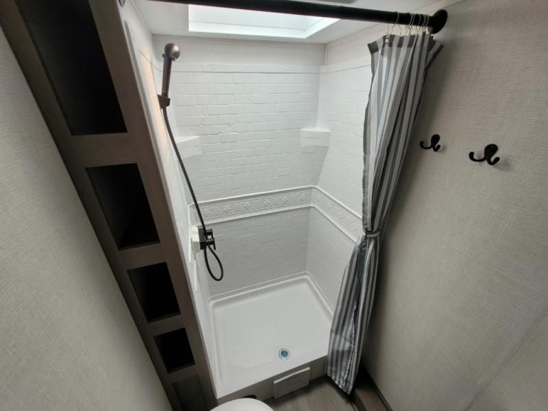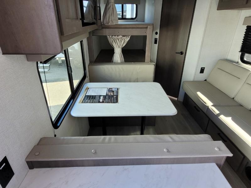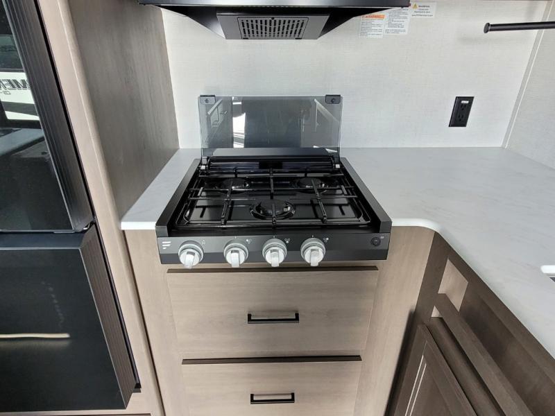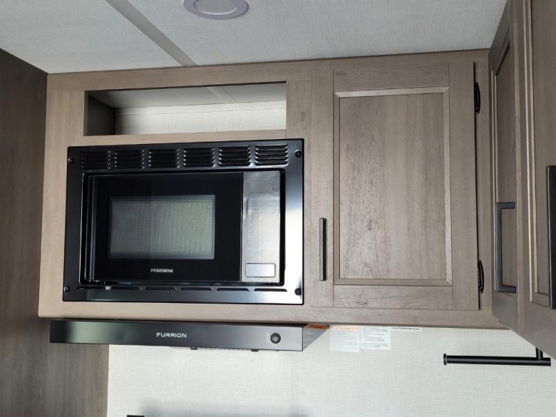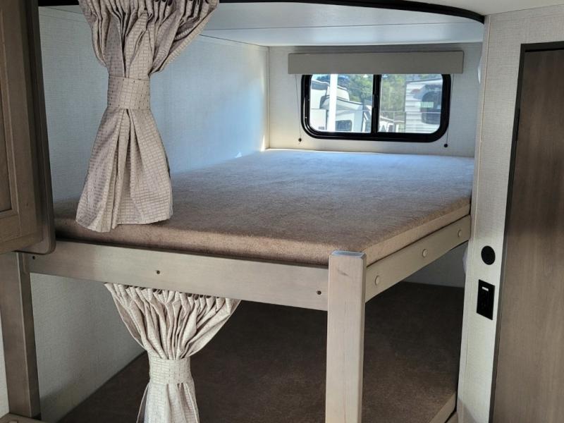 This is the perfect travel trailer if you like to camp with friends and family. Since there are double-size bunks, a queen bed in the front bedroom, plus a booth dinette and sofa, you can sleep eight campers each night! The three burner range and microwave in the kitchen will let you cook meals each day, and the 8 cu. ft. 12V refrigerator will keep your cold items fresh. This model also includes a counter with extra storage underneath, a pull-out trash can storage for convenience, and a full bath to freshen up in each day. And you'll love having your own space in the front bedroom with a privacy curtain, dual wardrobes, and TV prep if you want to add a television!