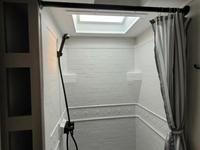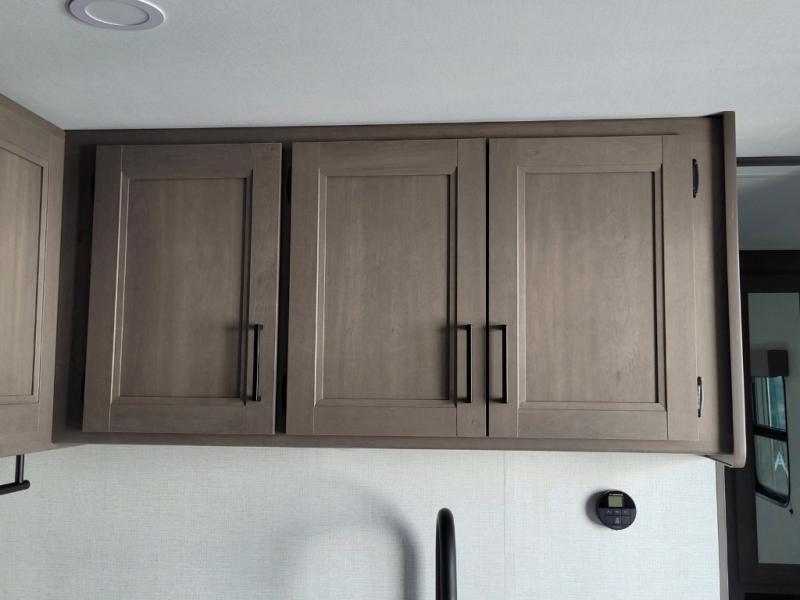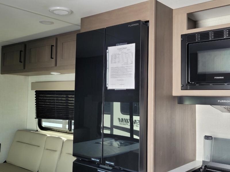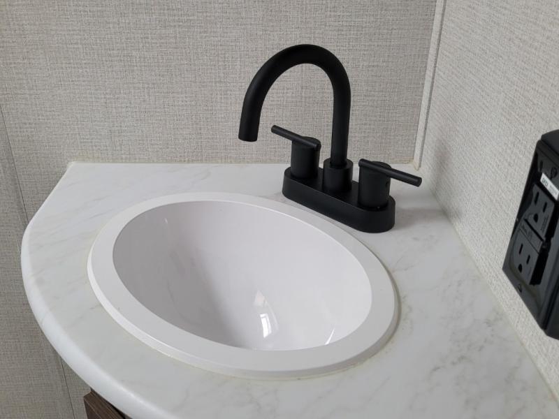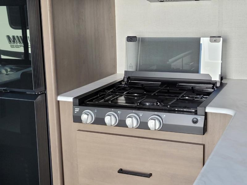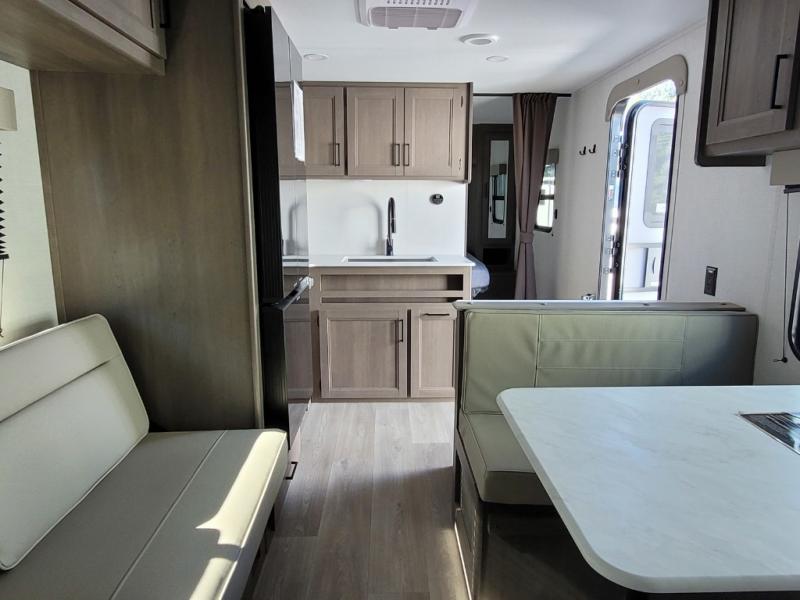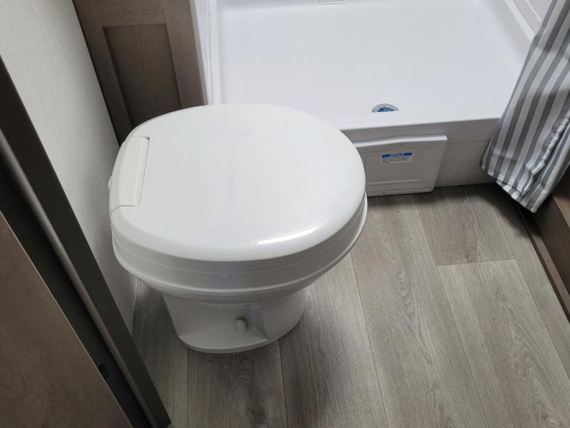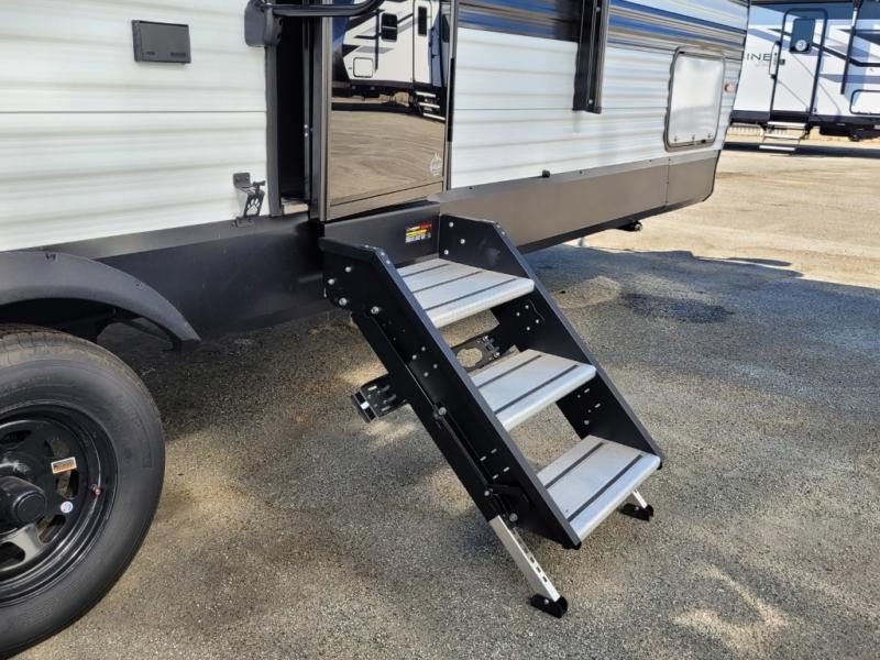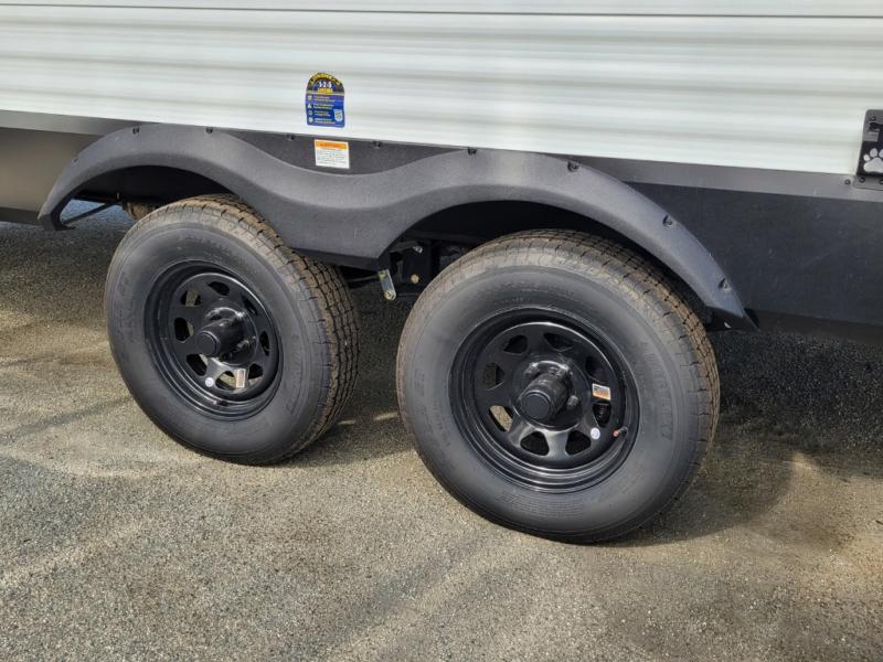 This is the perfect travel trailer if you like to camp with friends and family. Since there are double-size bunks, a queen bed in the front bedroom, plus a booth dinette and sofa, you can sleep eight campers each night! The three burner range and microwave in the kitchen will let you cook meals each day, and the 8 cu. ft. 12V refrigerator will keep your cold items fresh. This model also includes a counter with extra storage underneath, a pull-out trash can storage for convenience, and a full bath to freshen up in each day. And you'll love having your own space in the front bedroom with a privacy curtain, dual wardrobes, and TV prep if you want to add a television!