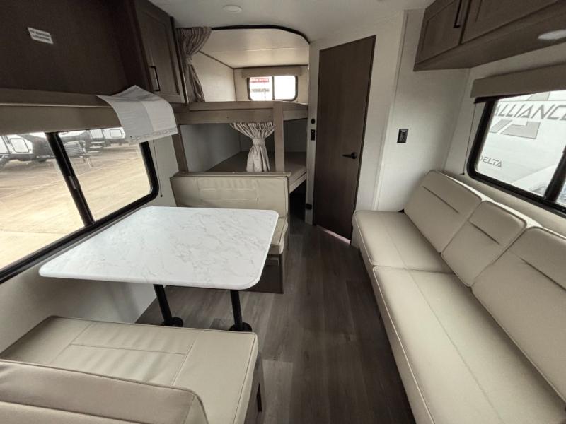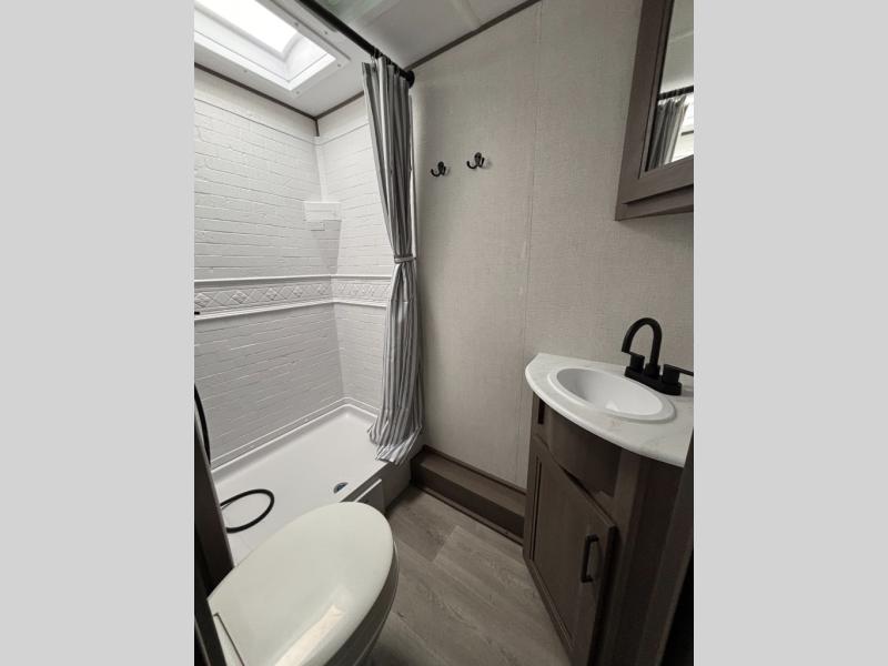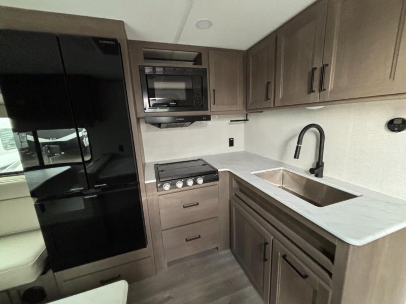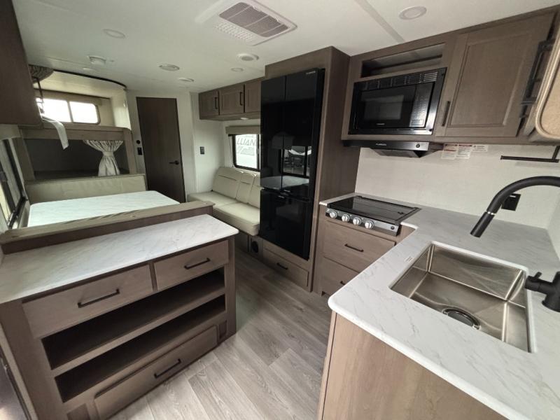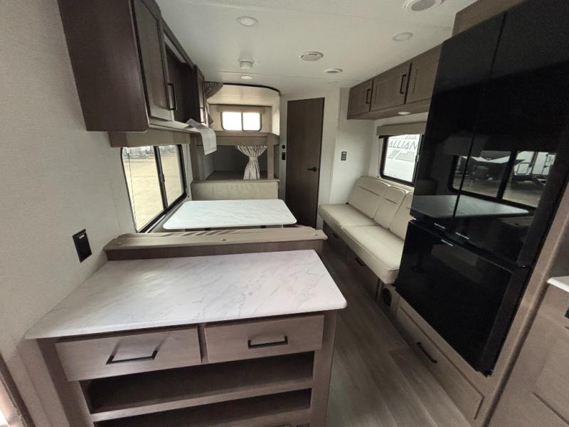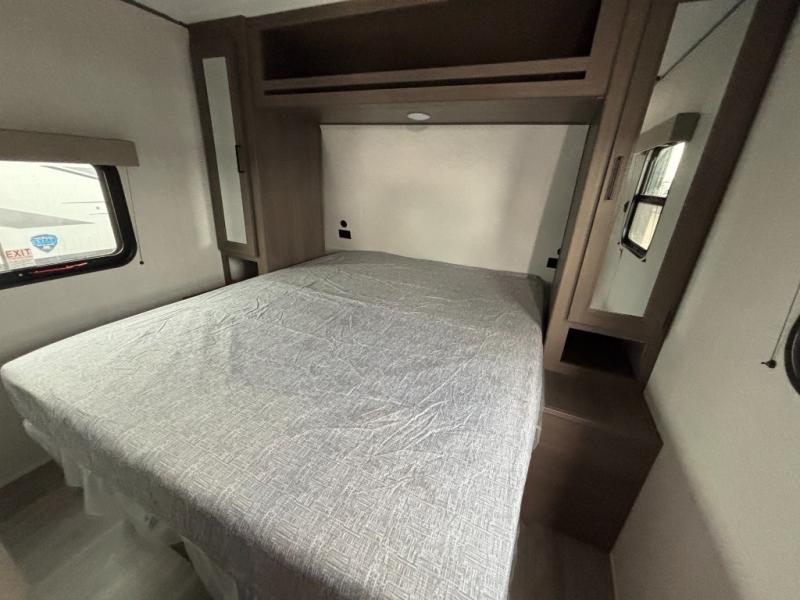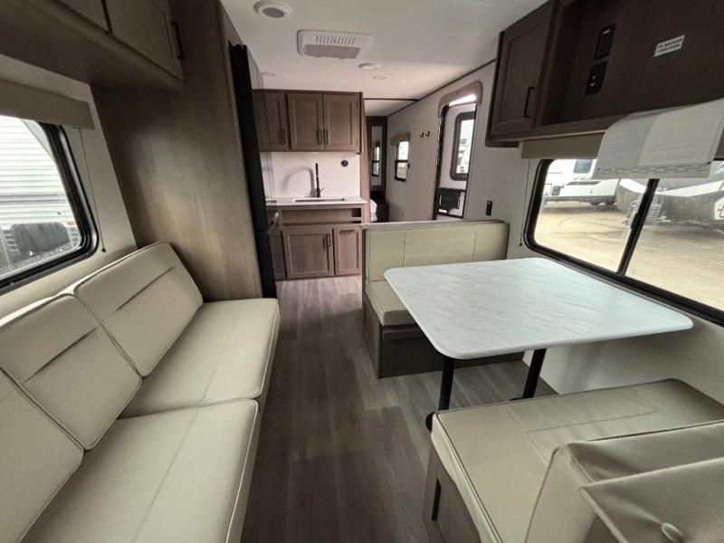 This is the perfect travel trailer if you like to camp with friends and family. Since there are double-size bunks, a queen bed in the front bedroom, plus a booth dinette and sofa, you can sleep eight campers each night! The three burner range and microwave in the kitchen will let you cook meals each day, and the 12V refrigerator will keep your cold items fresh. This model also includes a counter with extra storage underneath, a pull-out trash can storage for convenience, and a full bath to freshen up in each day. And you'll love having your own space in the front bedroom with a privacy curtain, dual wardrobes, and TV prep if you want to add a television!