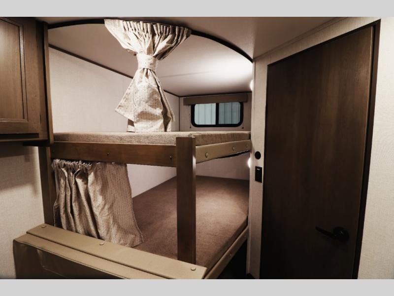 Sleeps Up to 8 Comfortably – Featuring double-size rear bunk beds, a 60 × 80 queen in front, a booth dinette, and a 69 rollover sofa.
