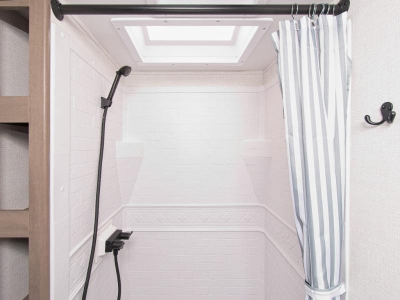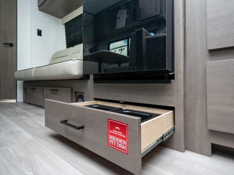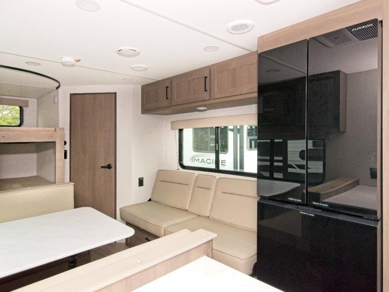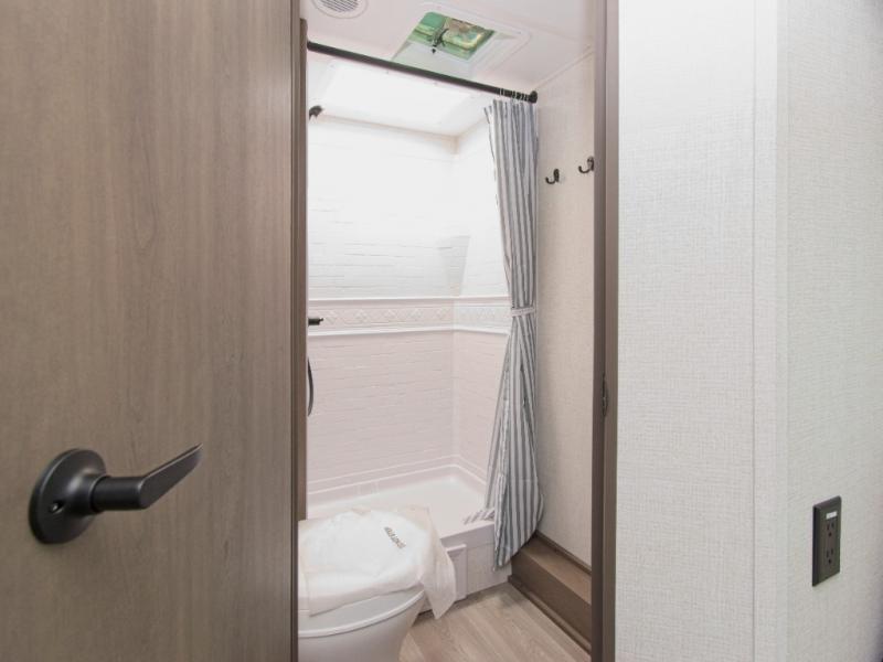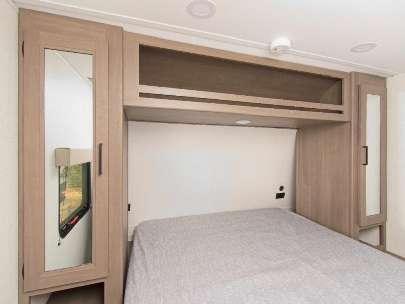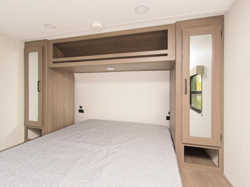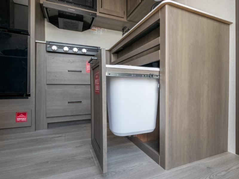 This is the perfect travel trailer if you like to camp with friends and family. Since there are double-size bunks, a queen bed in the front bedroom, plus a booth dinette and sofa, you can sleep eight campers each night! The three burner range and microwave in the kitchen will let you cook meals each day, and the 12V refrigerator will keep your cold items fresh. This model also includes a counter with extra storage underneath, a pull-out trash can storage for convenience, and a full bath to freshen up in each day. And you'll love having your own space in the front bedroom with a privacy curtain, dual wardrobes, and TV prep if you want to add a television!