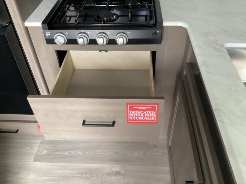 Equipped with a 3-burner range, microwave, and a 12V refrigerator, making meal prep a breeze. -