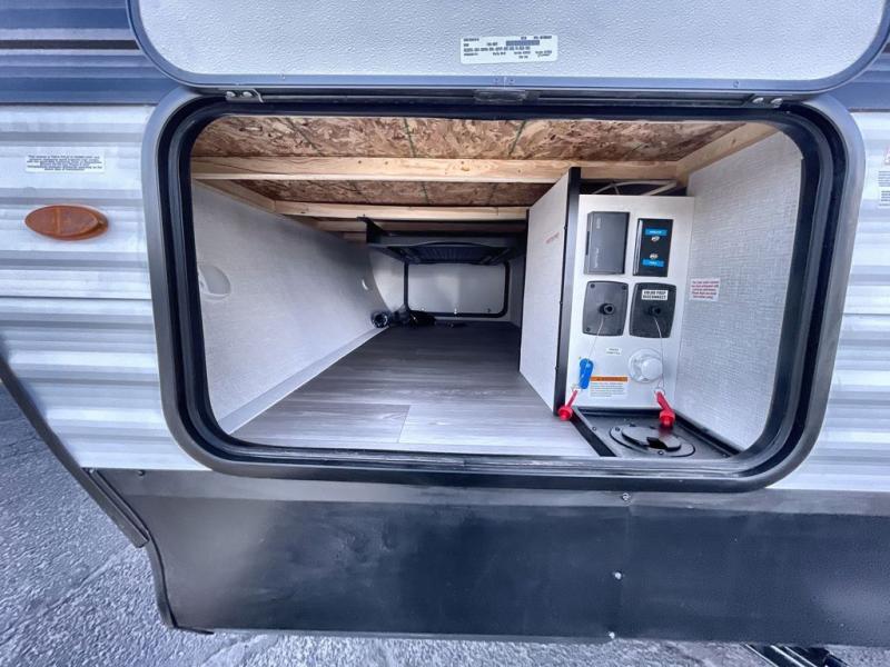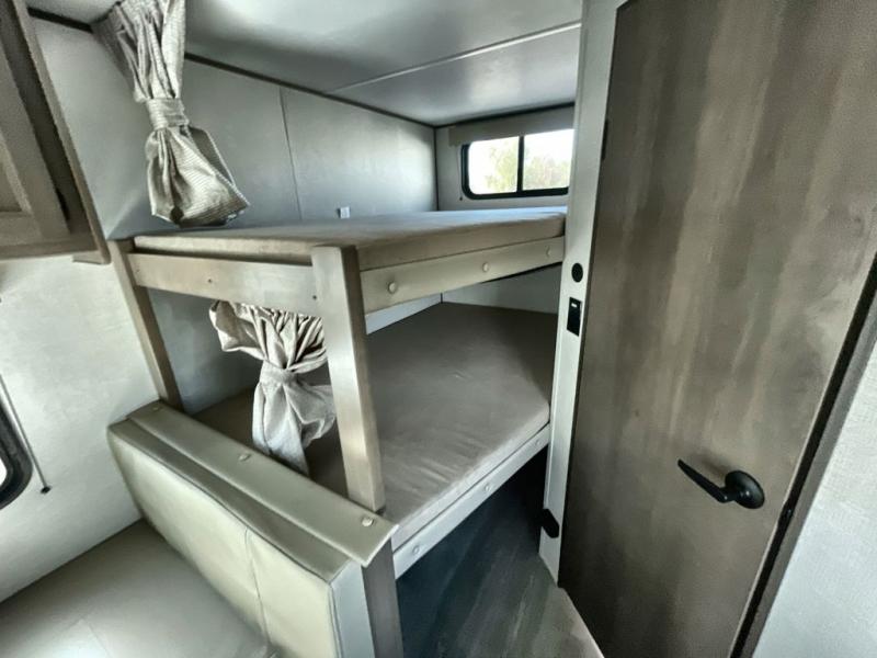 This is the perfect travel trailer if you like to camp with friends and family. Since there are double-size bunks, a queen bed in the front bedroom, plus a booth dinette and sofa, you can sleep eight campers each night! The three burner range and microwave in the kitchen will let you cook meals each day, and the 12V refrigerator will keep your cold items fresh. This model also includes a counter with extra storage underneath, a pull-out trash can storage for convenience, and a full bath to freshen up in each day. And you'll love having your own space in the front bedroom with a privacy curtain, dual wardrobes, and TV prep if you want to add a television!