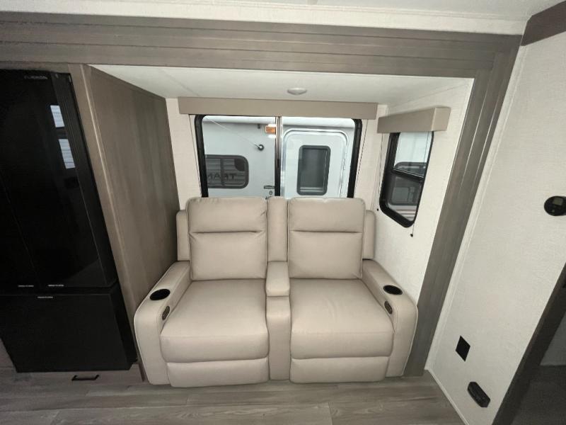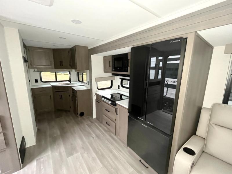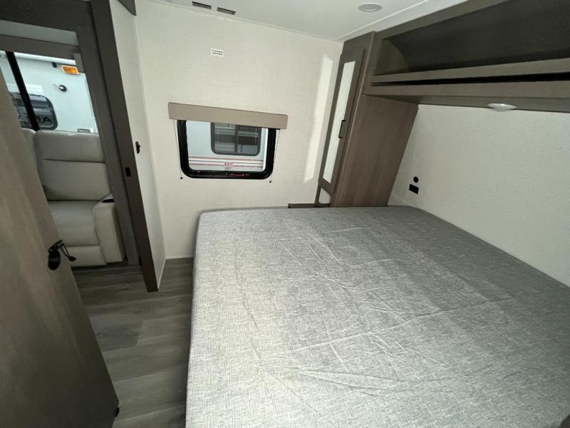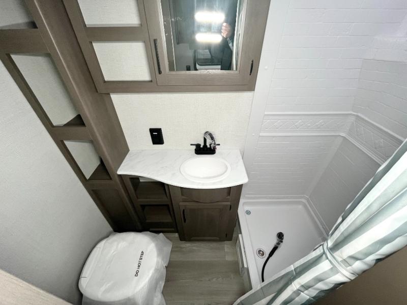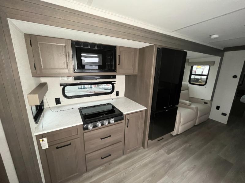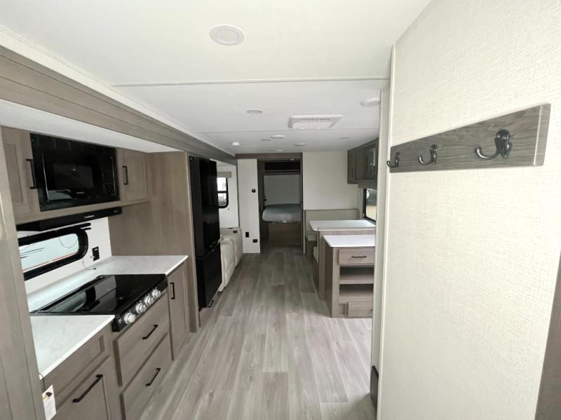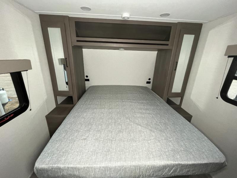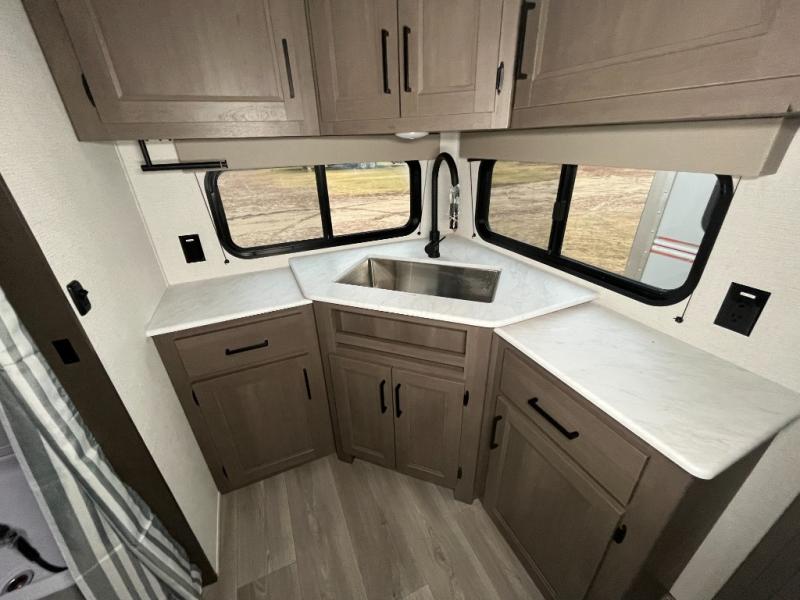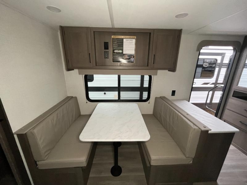 It will be so easy to enjoy camping trips in this travel trailer for five to six! The main living area is made spacious by the large slide out, and here you'll find the 60" sleeper sofa and the kitchen appliances. A booth dinette across the room provides a place to dine and play board games, or you can head outdoors to sit under the 17' power awning with LED lights. The queen bed in the front private bedroom will have you feeling right at home, and the TV prep here gives you the option to watch movies in bed. This model also includes a rear corner kitchen with ample counter space and a large sink, and you'll find the full bath in the other rear corner!