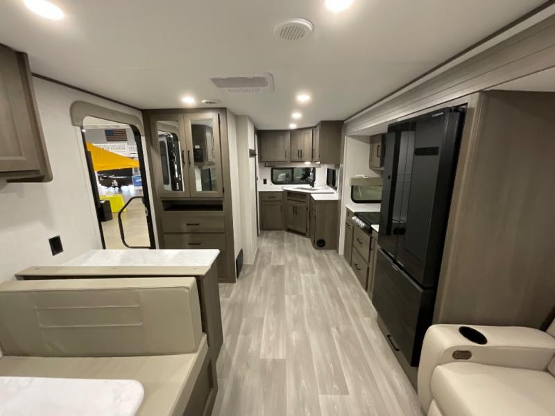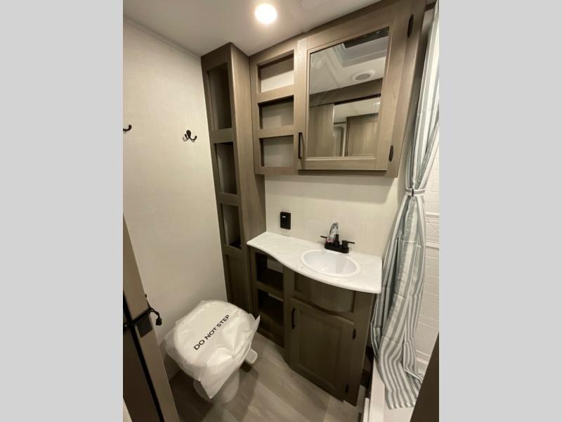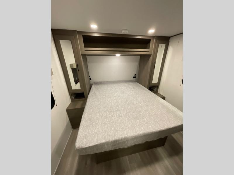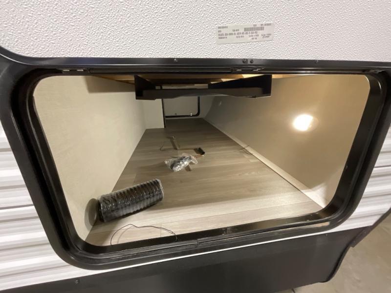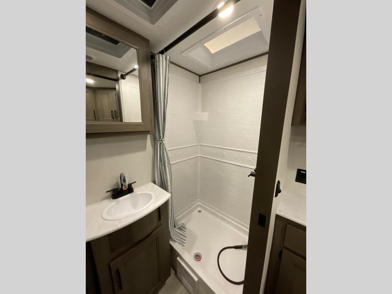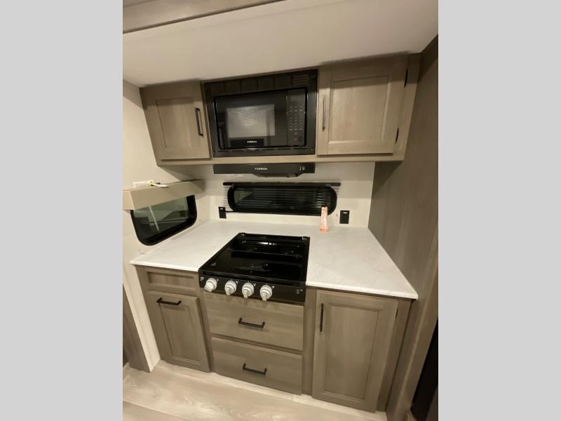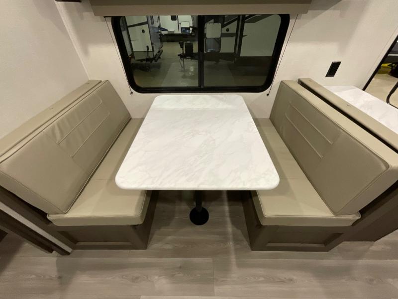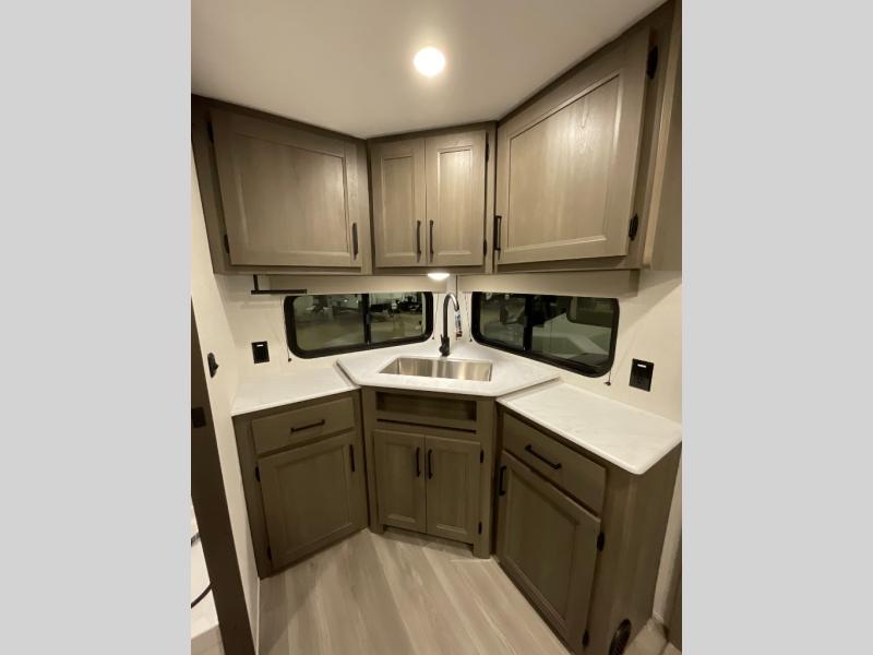 It will be so easy to enjoy camping trips in this travel trailer for five to six! The main living area is made spacious by the large slide out, and here you'll find the 60" sleeper sofa and the kitchen appliances. A booth dinette across the room provides a place to dine and play board games, or you can head outdoors to sit under the 17' power awning with LED lights. The queen bed in the front private bedroom will have you feeling right at home, and the TV prep here gives you the option to watch movies in bed. This model also includes a rear corner kitchen with ample counter space and a large sink, and you'll find the full bath in the other rear corner!