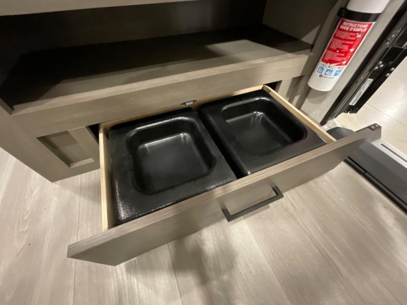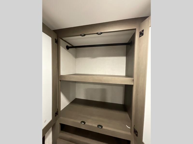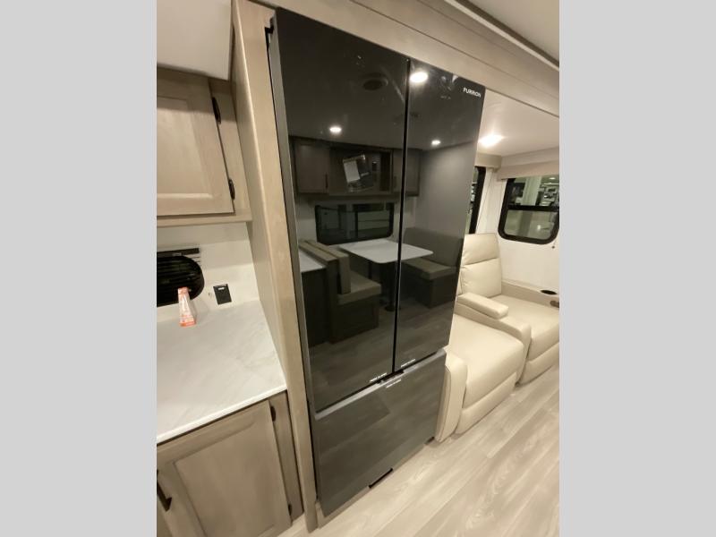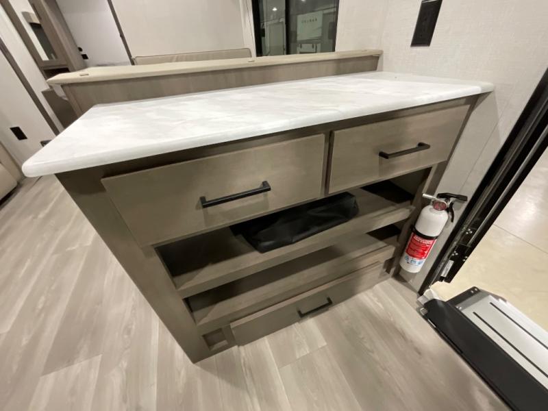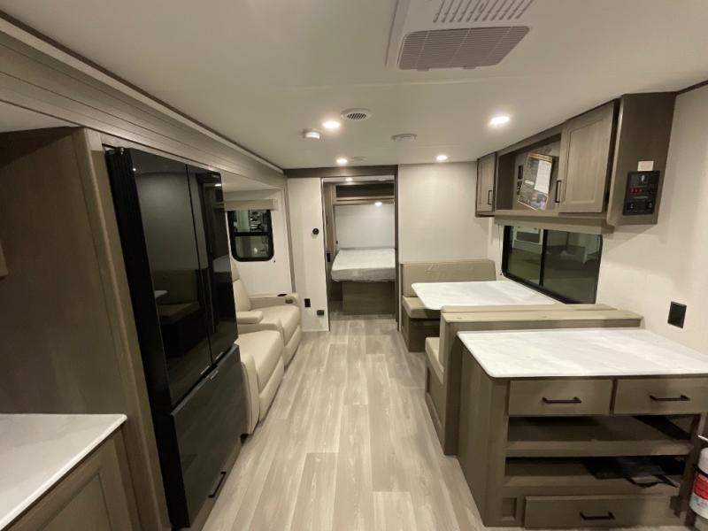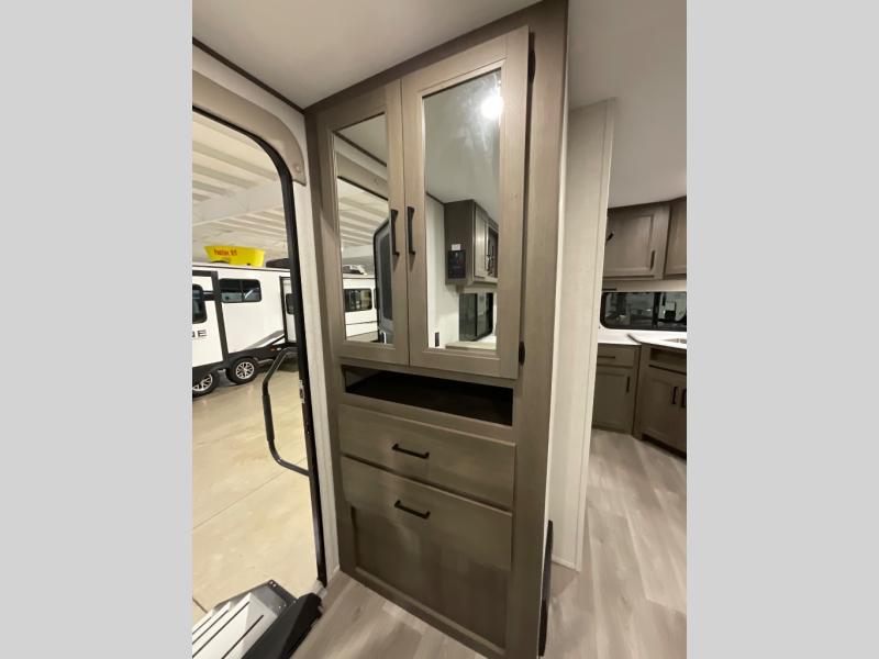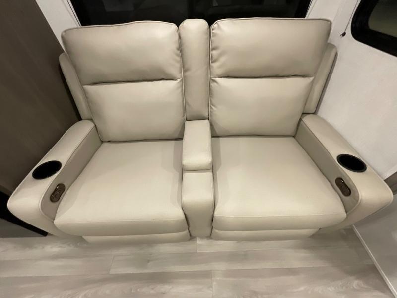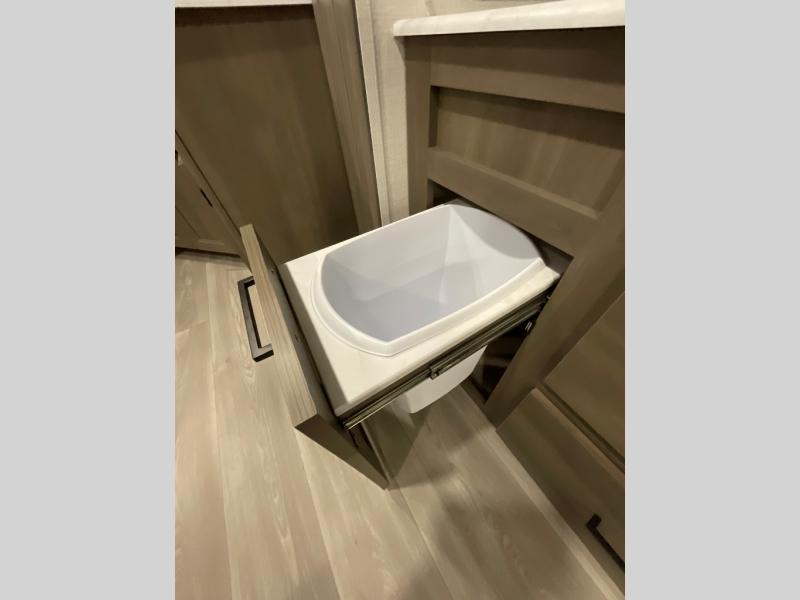It will be so easy to enjoy camping trips in this travel trailer for five to six! The main living area is made spacious by the large slide out, and here you'll find the 60" sleeper sofa and the kitchen appliances. A booth dinette across the room provides a place to dine and play board games, or you can head outdoors to sit under the 17' power awning with LED lights. The queen bed in the front private bedroom will have you feeling right at home, and the TV prep here gives you the option to watch movies in bed. This model also includes a rear corner kitchen with ample counter space and a large sink, and you'll find the full bath in the other rear corner!