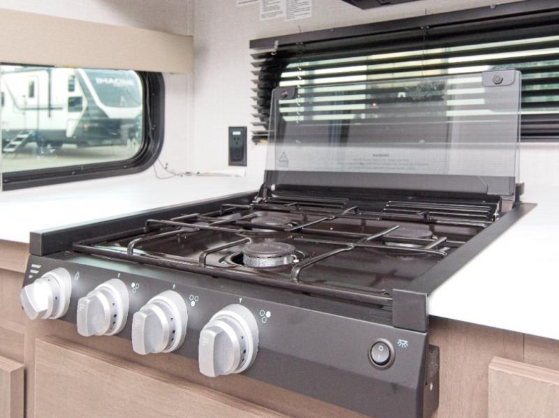 Modern Kitchen: Whip up gourmet meals on the go in the fully equipped kitchen, featuring stainless steel appliances, a spacious refrigerator, a three-burner cooktop, and a microwave. The ample counter space and storage ensure you have everything you need to cook like a pro.