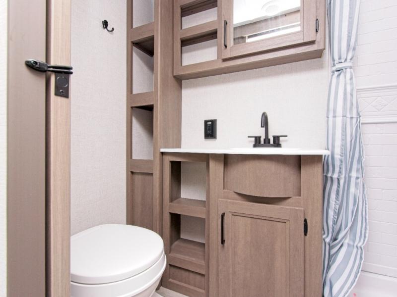 Luxurious Bathroom: The bathroom is equipped with a roomy shower, a vanity with a sink, and a mirrored medicine cabinet, offering all the conveniences of home while on the road.
