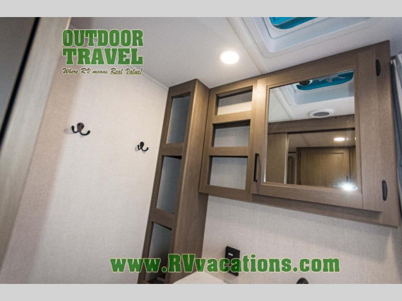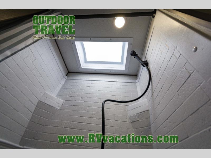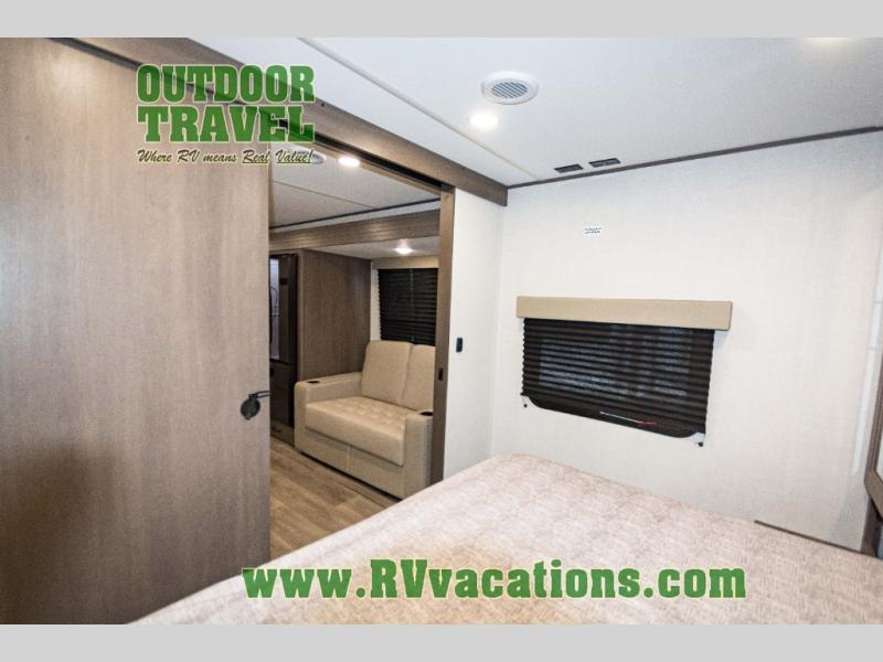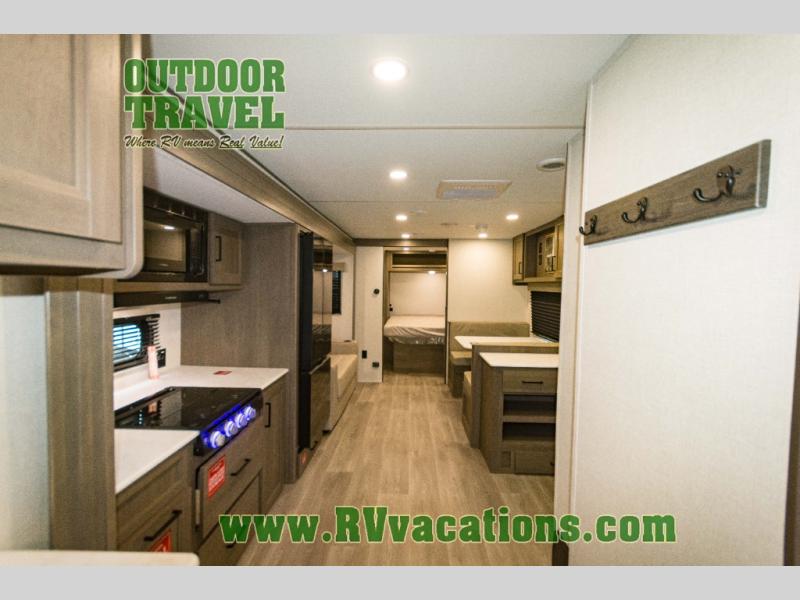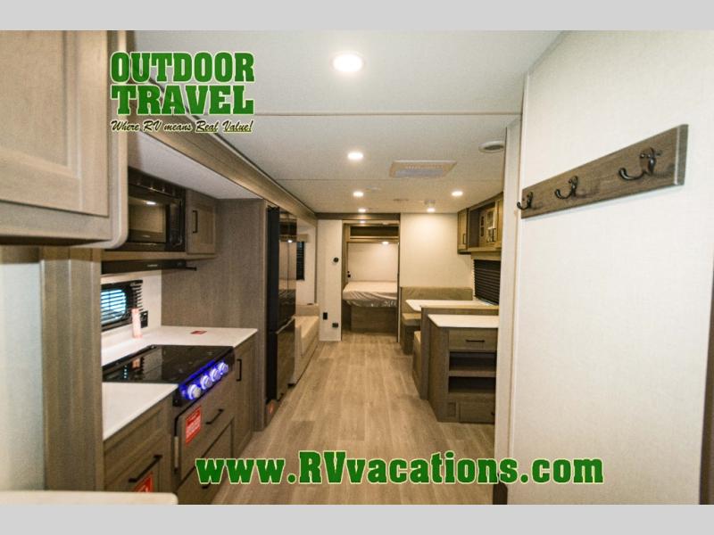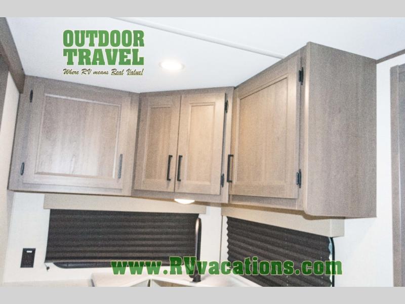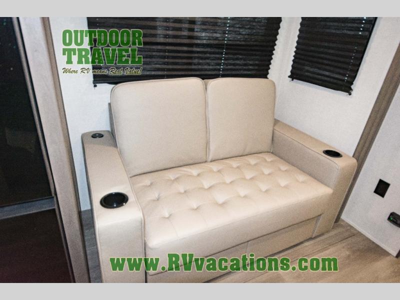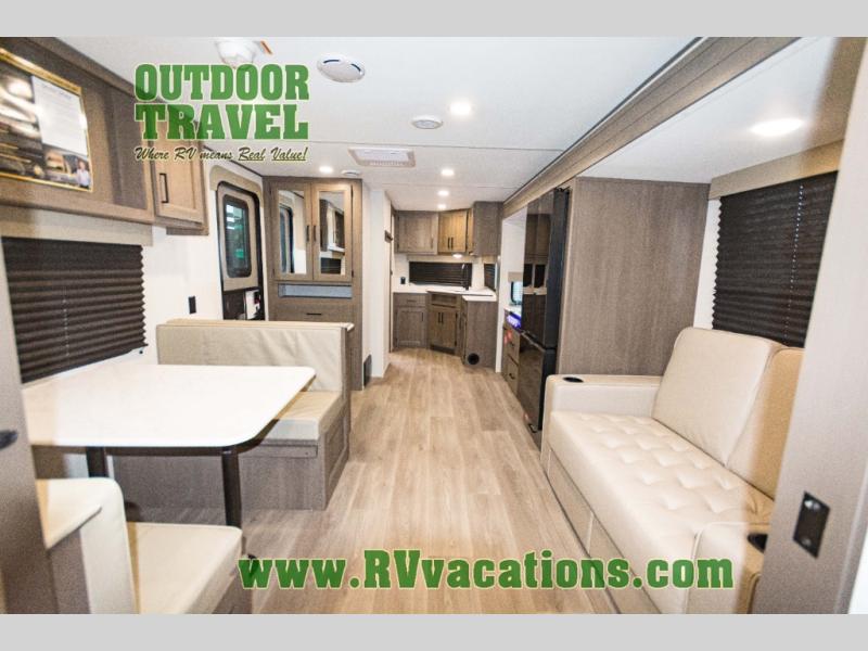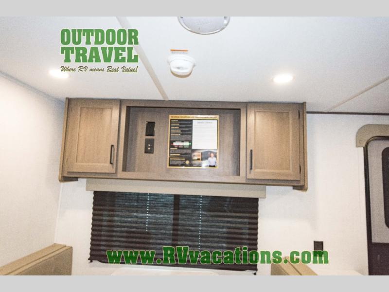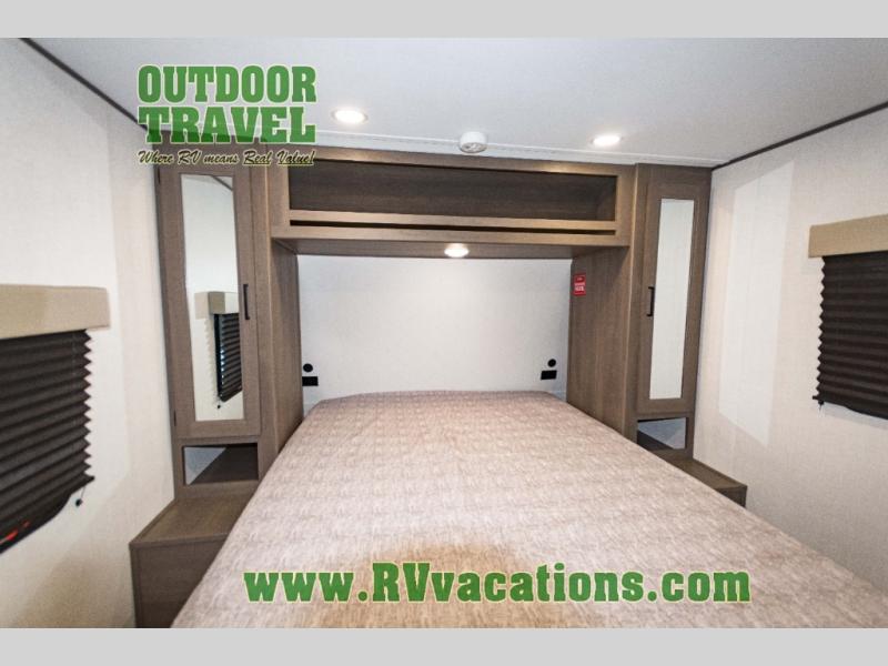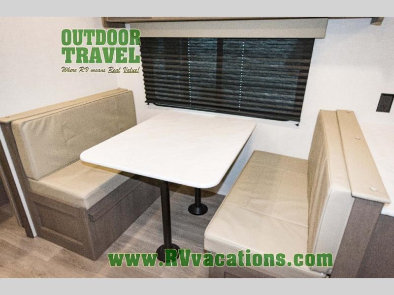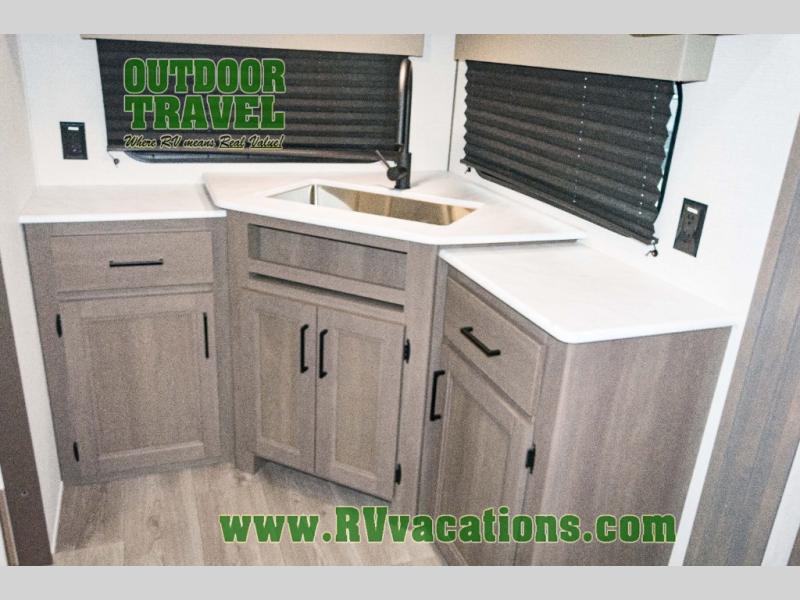 It will be so easy to enjoy camping trips in this travel trailer for five to six! The main living area is made spacious by the large slide out, and here you'll find the 60" sleeper sofa and the kitchen appliances. A booth dinette across the room provides a place to dine and play board games, or you can head outdoors to sit under the 17' power awning with LED lights. The queen bed in the front private bedroom will have you feeling right at home, and the TV prep here gives you the option to watch movies in bed. This model also includes a rear corner kitchen with ample counter space and a large sink, and you'll find the full bath in the other rear corner!
