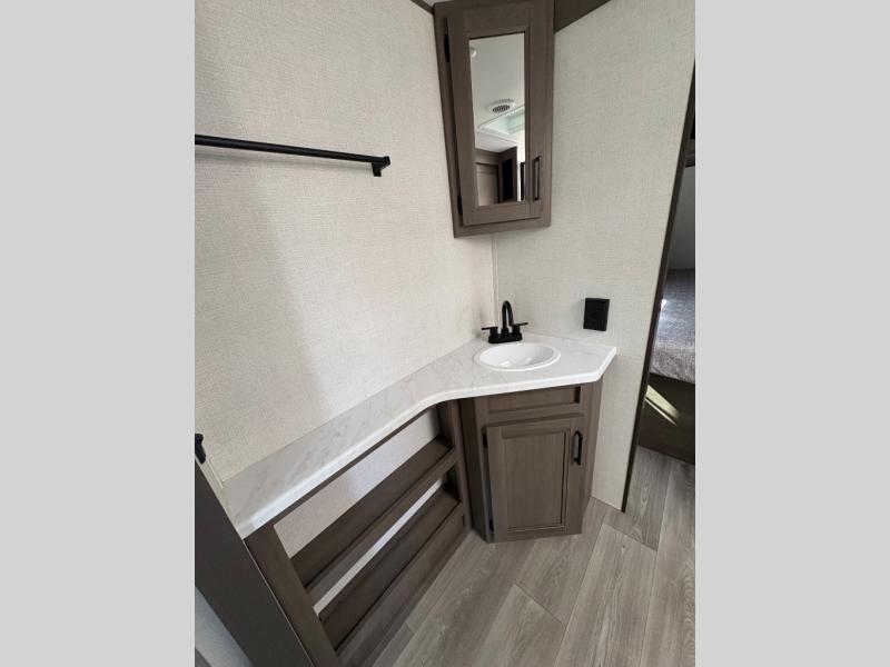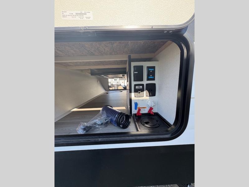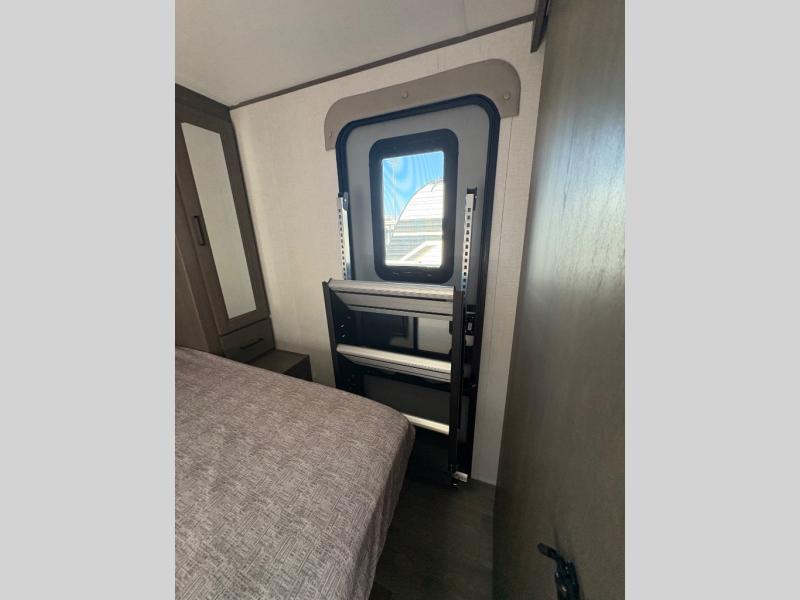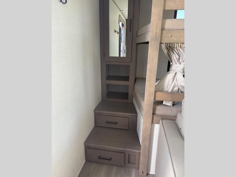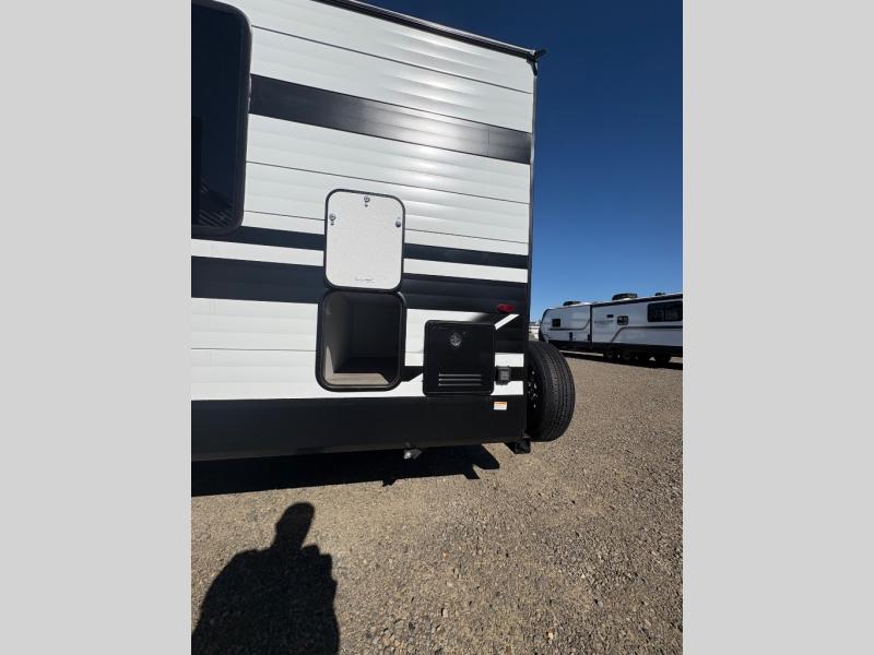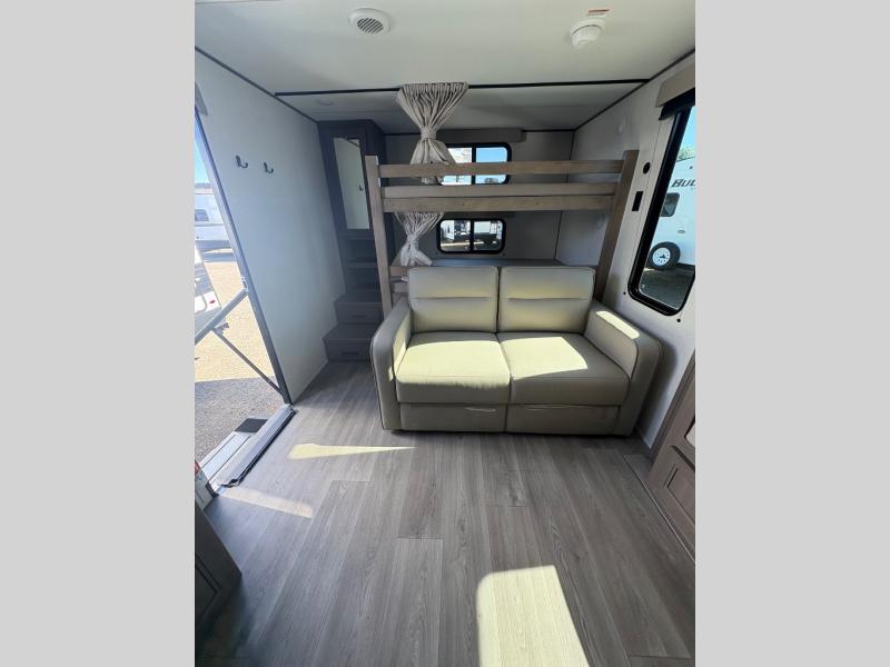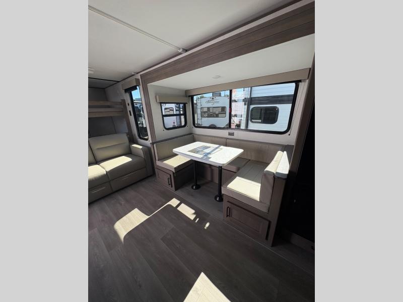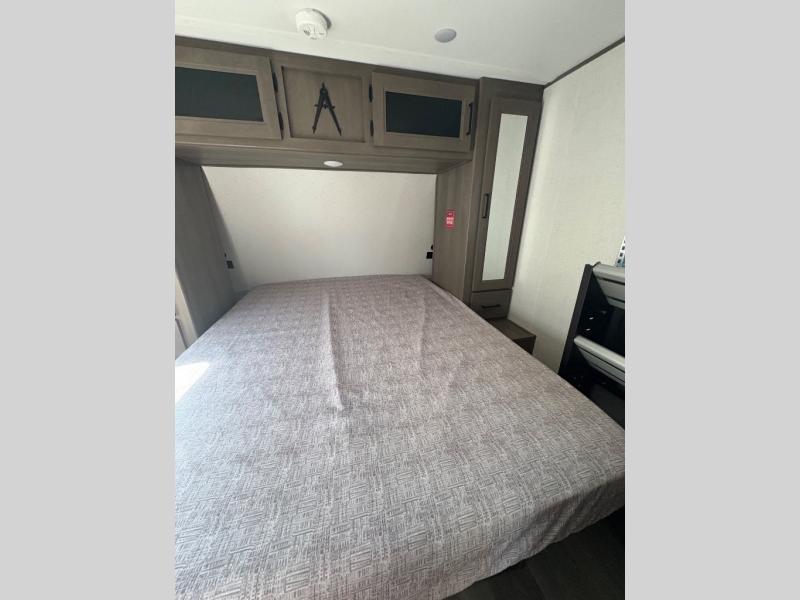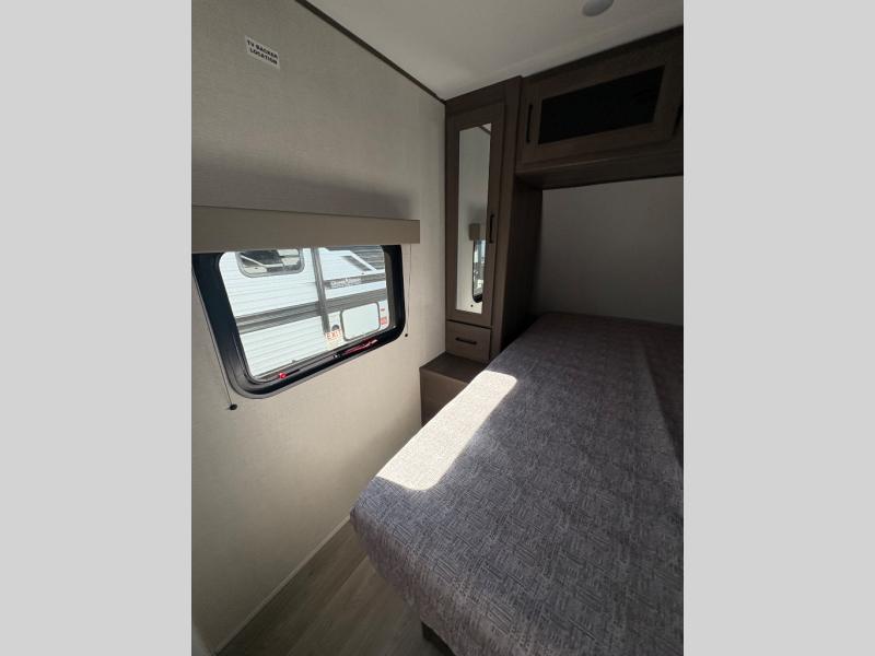 Are you ready to camp in comfort with your family or friends? This travel trailer allows you to do just that! There are double-size bunks in the back with step storage for books or board games. There is also a closet here to keep clothes wrinkle-free. The large slide features a U-Shaped dinette which is perfect for everyone to gather for a meal or games, and there is also theater seating adjacent to the slide. This model features a walk-through bath that leads to the front master bedroom. You'll love the queen bed here, overhead storage, and your own exterior entry door for convenience.