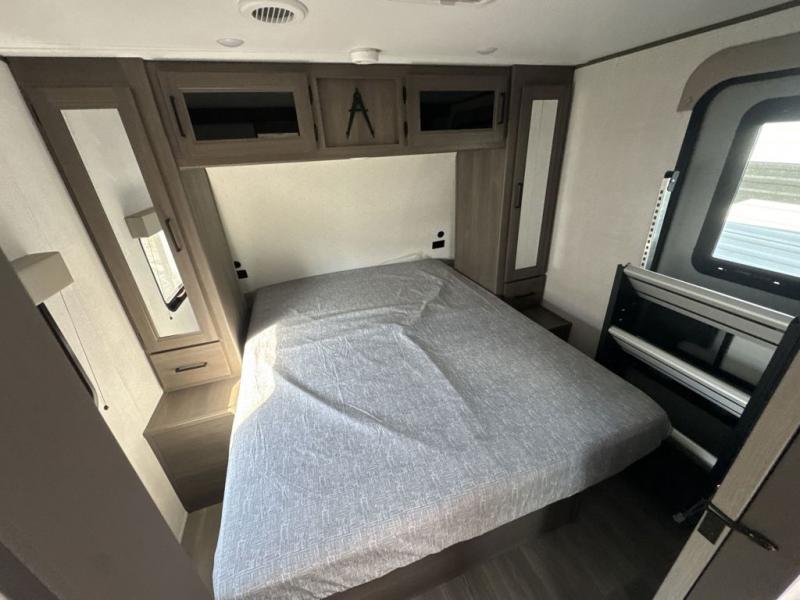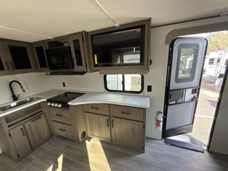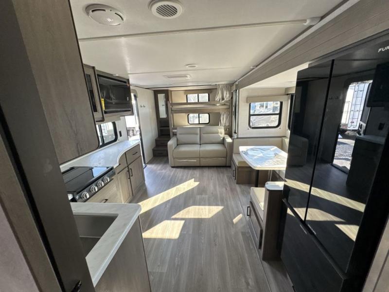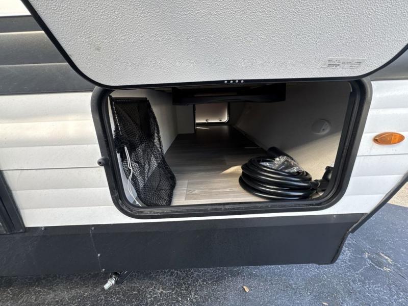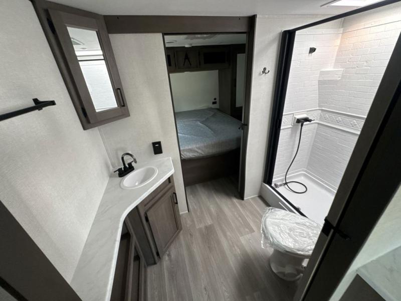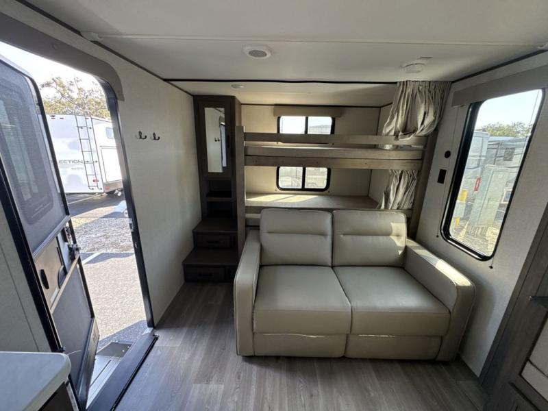 Are you ready to camp in comfort with your family or friends? This travel trailer allows you to do just that! There are double-size bunks in the back with step storage for books or board games. There is also a closet here to keep clothes wrinkle-free. The large slide features a U-Shaped dinette which is perfect for everyone to gather for a meal or games, and there is also theater seating adjacent to the slide. This model features a walk-through bath that leads to the front master bedroom. You'll love the queen bed here, overhead storage, and your own exterior entry door for convenience.