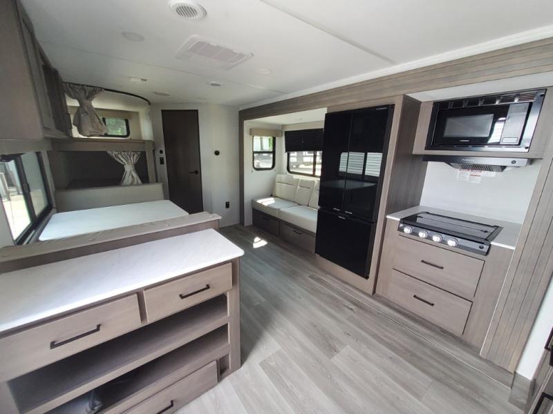 Camping with your larger family or when you want to take along a few extra friends is easy with this trailer. This unit sleeps nine with the double-size bunks in the rear corner, the 60" roll over sofa, and the queen bed in the front semi-private bedroom. The booth dinette can also be used to sleep a guest or two little ones at night once converted. Prepare your meals on the three-burner cooktop indoors, or out on the two-burner cooktop at the outside kitchen! You'll also find a handy exterior spray port and an outdoor refrigerator for cold drinks! It will be so easy to fill the dog's food bowl with the added pet dish under the refrigerator, and the full bath in this model means you don't have to use the camp's facilities. Having a 17' awning outside along with a large unobstructed pass-through compartment allows you extended living outdoors and plenty of space for all of your gear!
