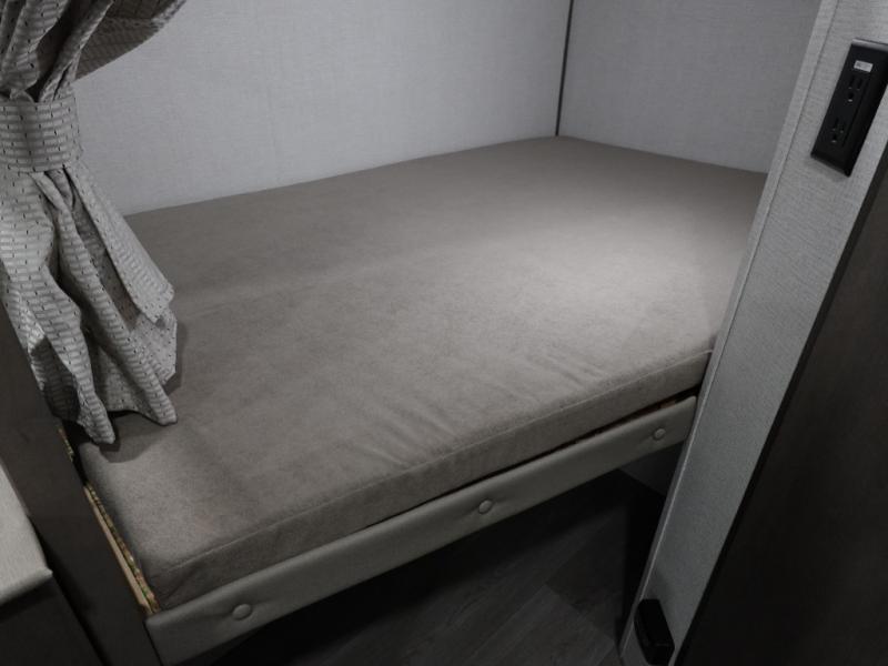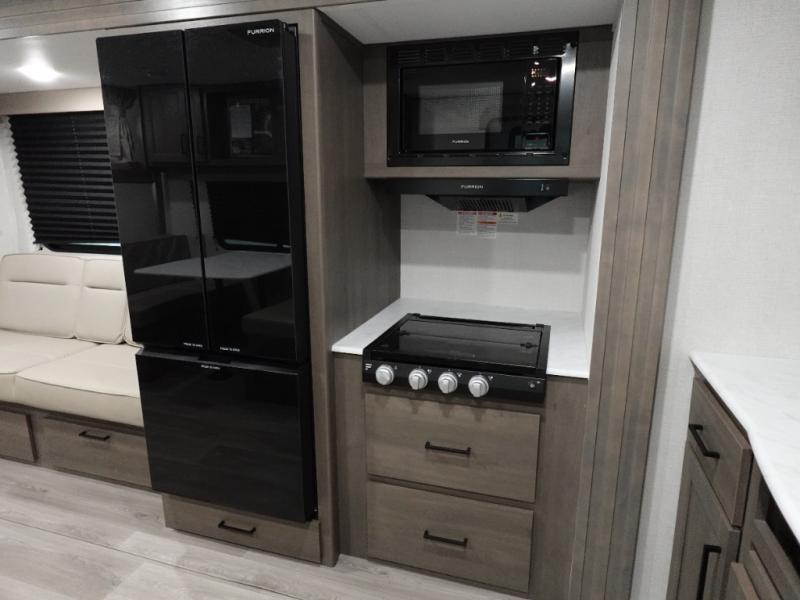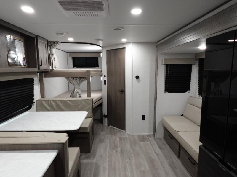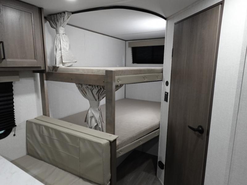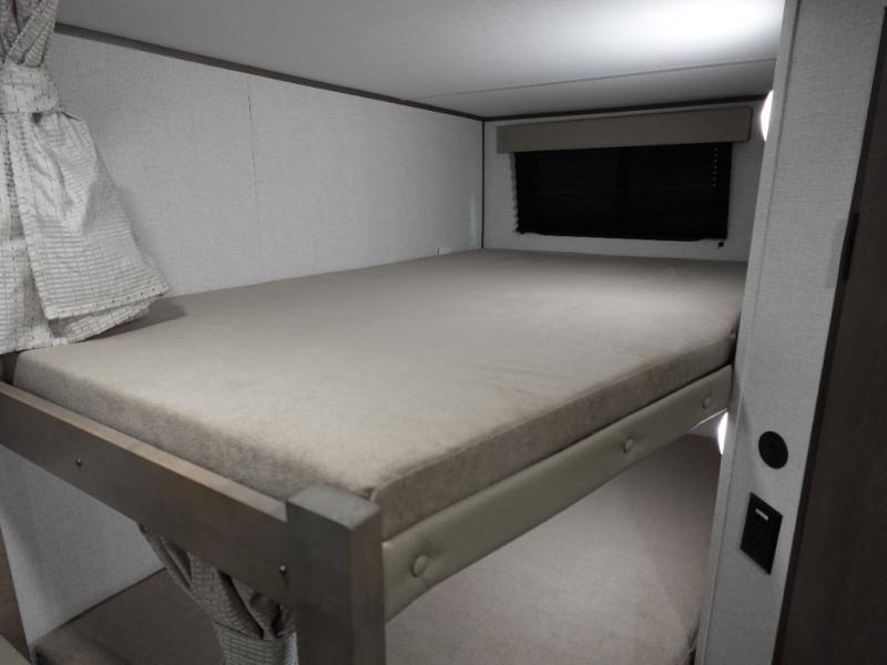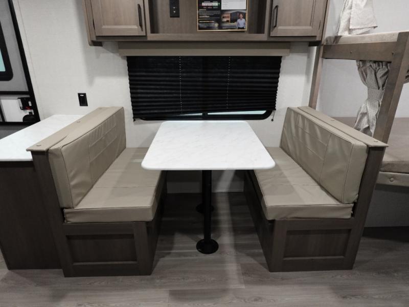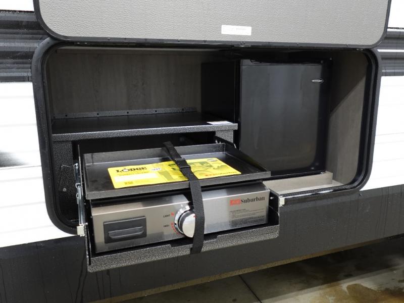 Camping with your larger family or when you want to take along a few extra friends is easy with this trailer. This unit sleeps nine with the double-size bunks in the rear corner, the 60" roll over sofa, and the queen bed in the front semi-private bedroom. The booth dinette can also be used to sleep a guest or two little ones at night once converted. Prepare your meals on the three-burner cooktop indoors, or out on the two-burner cooktop at the outside kitchen! You'll also find a handy exterior spray port and an outdoor refrigerator for cold drinks! It will be so easy to fill the dog's food bowl with the added pet dish under the refrigerator, and the full bath in this model means you don't have to use the camp's facilities. Having a 17' awning outside along with a large unobstructed pass-through compartment allows you extended living outdoors and plenty of space for all of your gear!