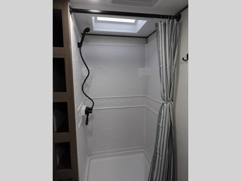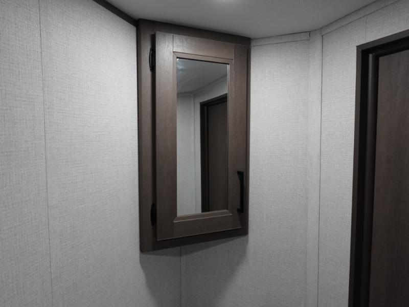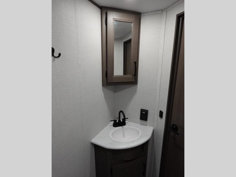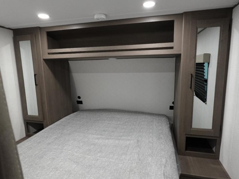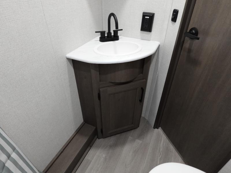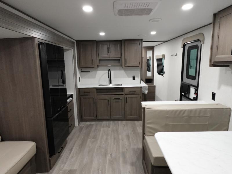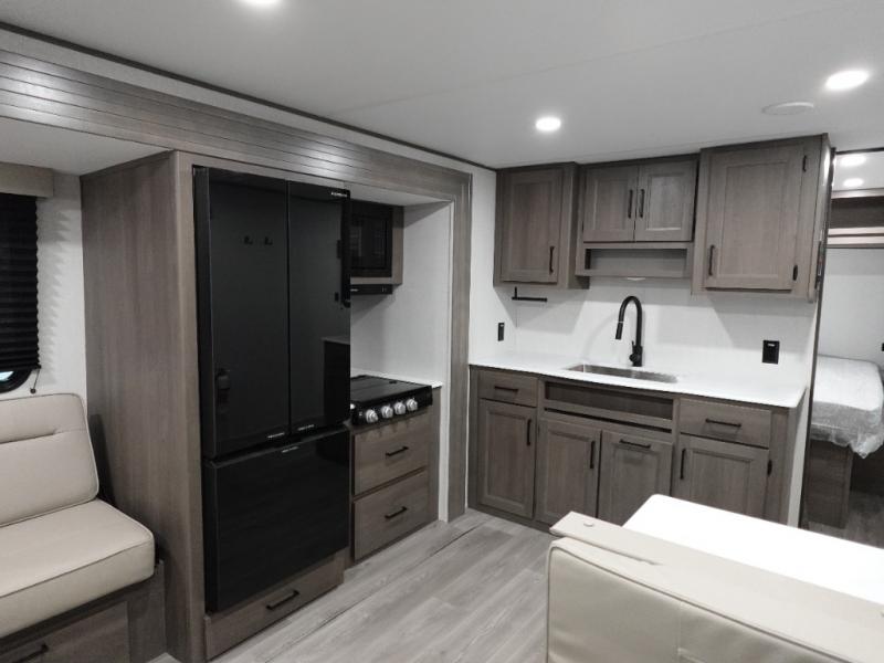 Camping with your larger family or when you want to take along a few extra friends is easy with this trailer. This unit sleeps nine with the double-size bunks in the rear corner, the 60" roll over sofa, and the queen bed in the front semi-private bedroom. The booth dinette can also be used to sleep a guest or two little ones at night once converted. Prepare your meals on the three-burner cooktop indoors, or out on the two-burner cooktop at the outside kitchen! You'll also find a handy exterior spray port and an outdoor refrigerator for cold drinks! It will be so easy to fill the dog's food bowl with the added pet dish under the refrigerator, and the full bath in this model means you don't have to use the camp's facilities. Having a 17' awning outside along with a large unobstructed pass-through compartment allows you extended living outdoors and plenty of space for all of your gear!