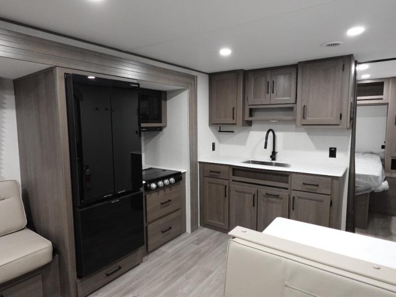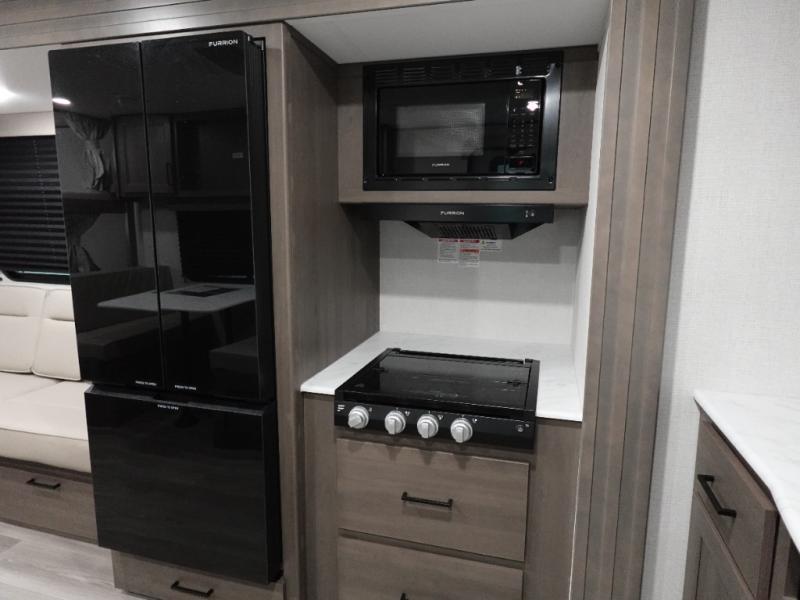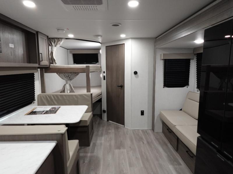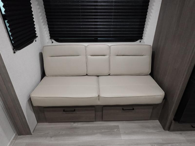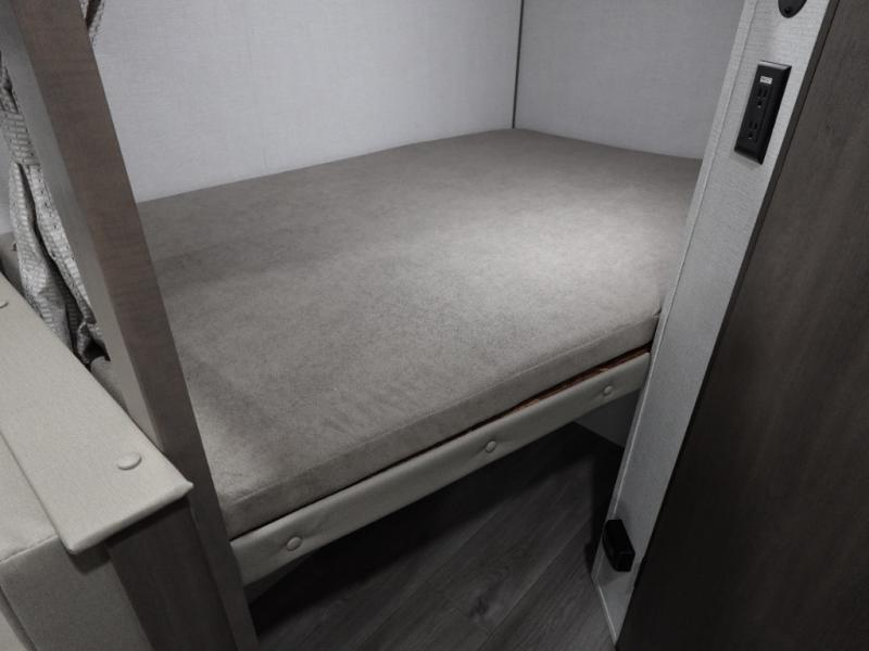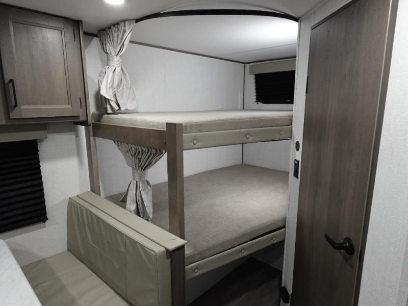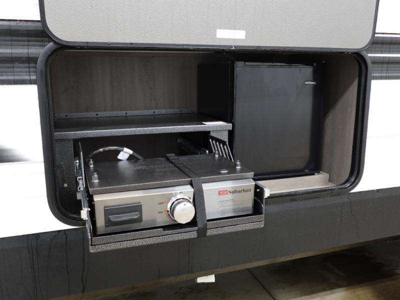 Camping with your larger family or when you want to take along a few extra friends is easy with this trailer. This unit sleeps nine with the double-size bunks in the rear corner, the 60" roll over sofa, and the queen bed in the front semi-private bedroom. The booth dinette can also be used to sleep a guest or two little ones at night once converted. Prepare your meals on the three-burner cooktop indoors, or out on the two-burner cooktop at the outside kitchen! You'll also find a handy exterior spray port and an outdoor refrigerator for cold drinks! It will be so easy to fill the dog's food bowl with the added pet dish under the refrigerator, and the full bath in this model means you don't have to use the camp's facilities. Having a 17' awning outside along with a large unobstructed pass-through compartment allows you extended living outdoors and plenty of space for all of your gear!