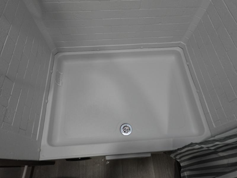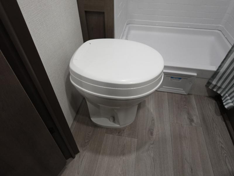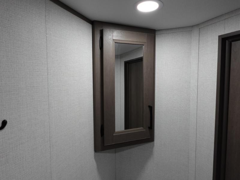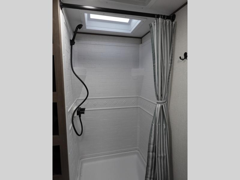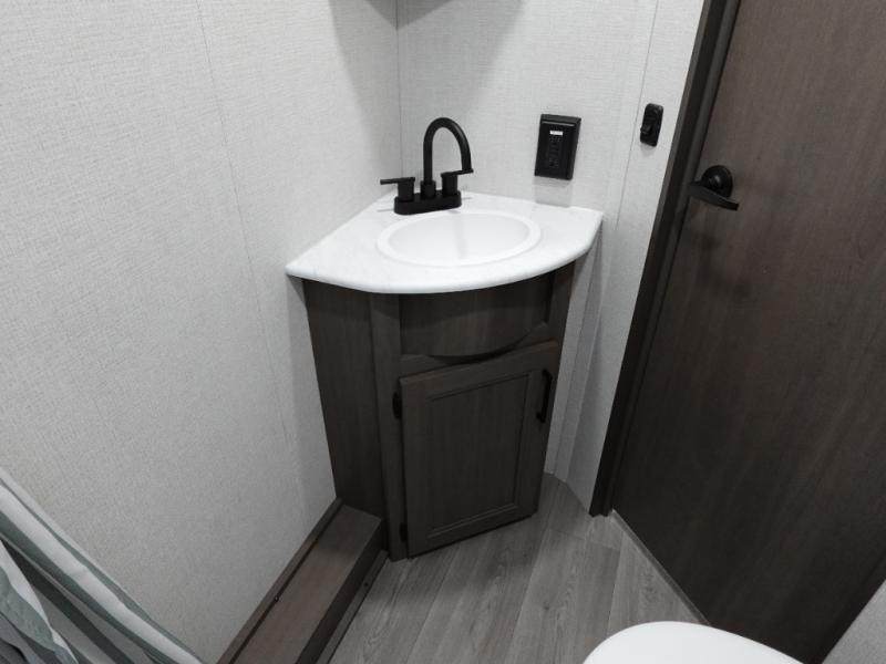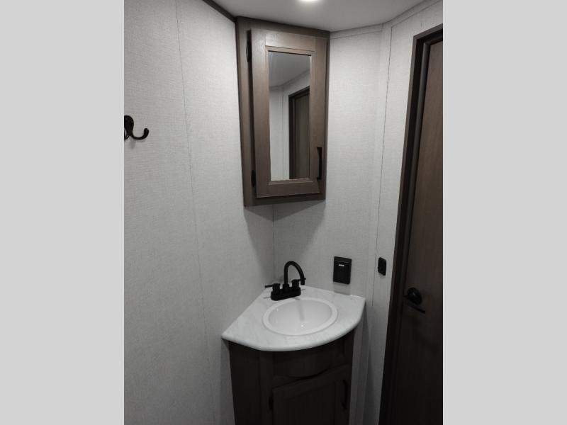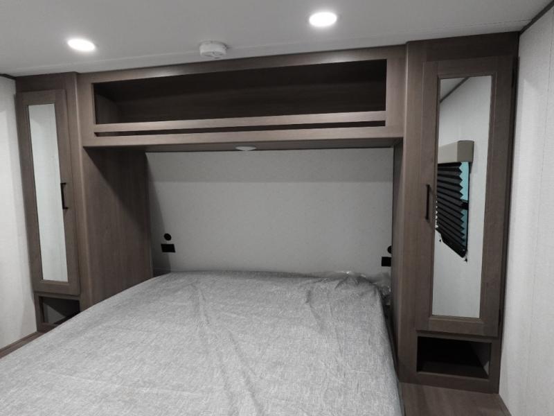Camping with your larger family or when you want to take along a few extra friends is easy with this trailer. This unit sleeps nine with the double-size bunks in the rear corner, the 60" roll over sofa, and the queen bed in the front semi-private bedroom. The booth dinette can also be used to sleep a guest or two little ones at night once converted. Prepare your meals on the three-burner cooktop indoors, or out on the two-burner cooktop at the outside kitchen! You'll also find a handy exterior spray port and an outdoor refrigerator for cold drinks! It will be so easy to fill the dog's food bowl with the added pet dish under the refrigerator, and the full bath in this model means you don't have to use the camp's facilities. Having a 17' awning outside along with a large unobstructed pass-through compartment allows you extended living outdoors and plenty of space for all of your gear!