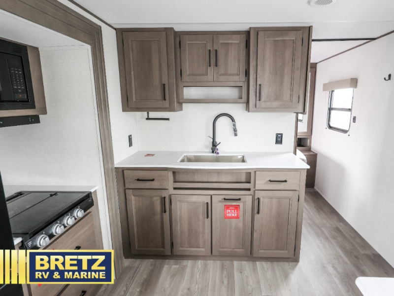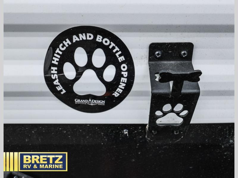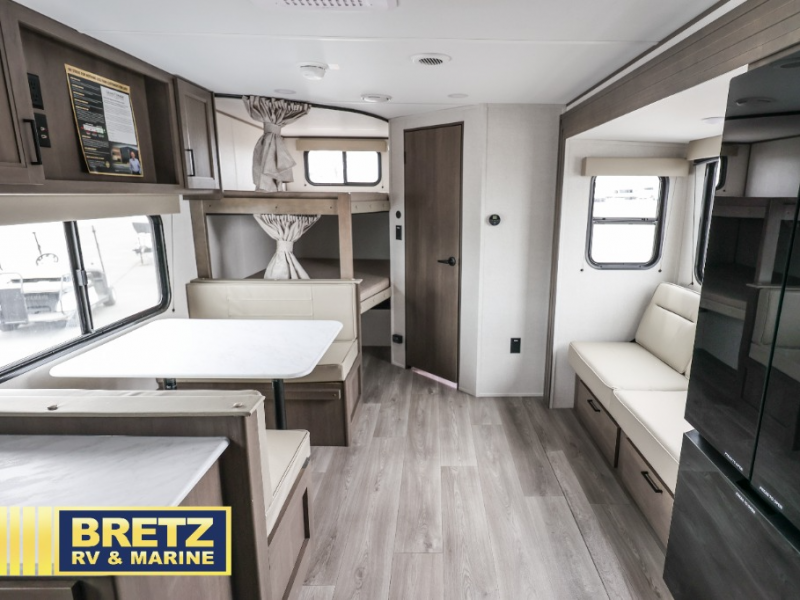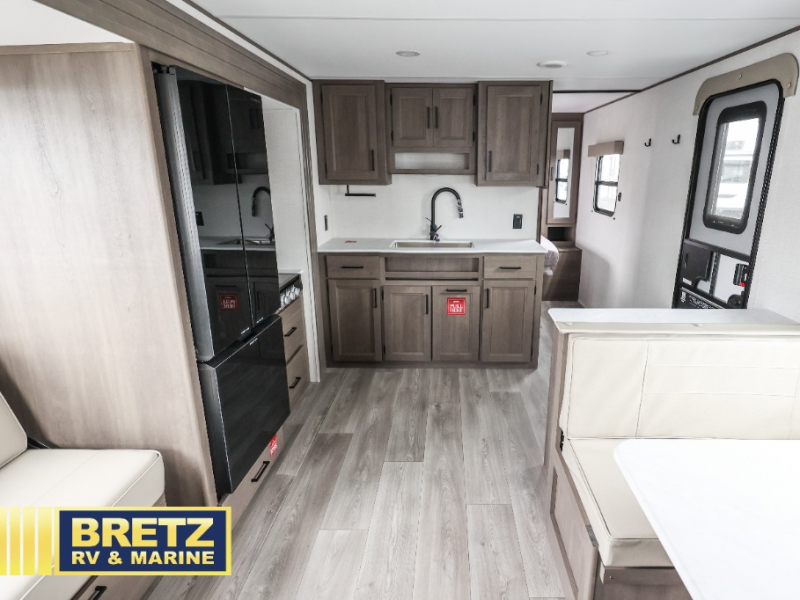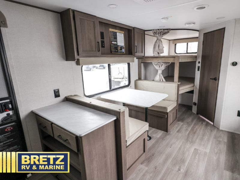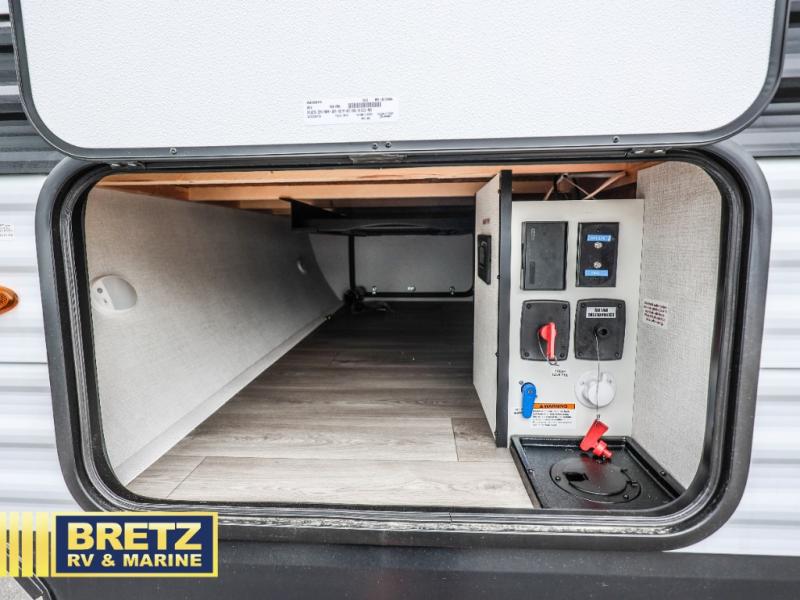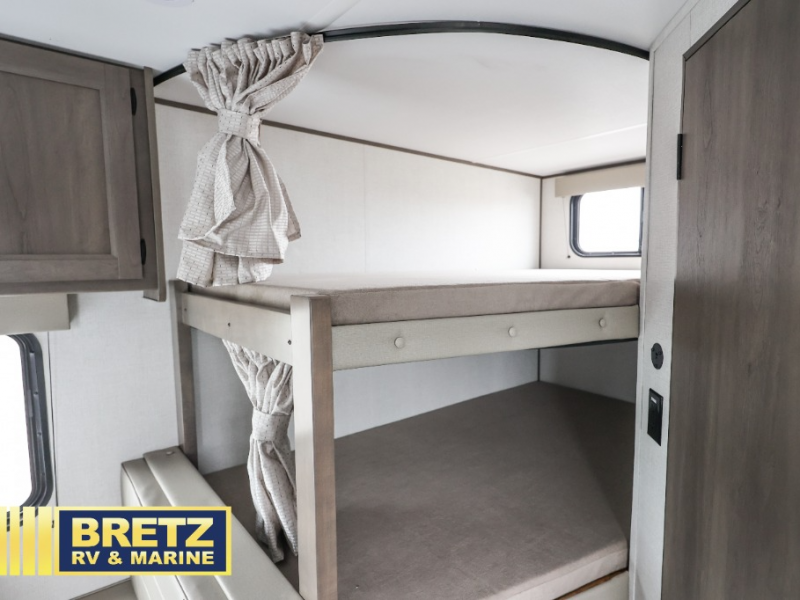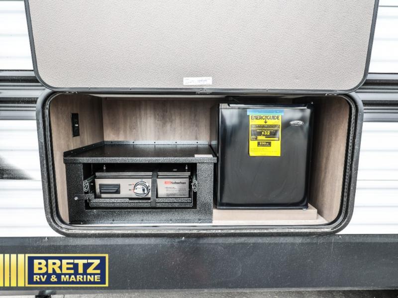 Camping with your larger family or when you want to take along a few extra friends is easy with this trailer. This unit sleeps nine with the double-size bunks in the rear corner, the 60" roll over sofa, and the queen bed in the front semi-private bedroom. The booth dinette can also be used to sleep a guest or two little ones at night once converted. Prepare your meals on the three-burner cooktop indoors, or out on the two-burner cooktop at the outside kitchen! You'll also find a handy exterior spray port and an outdoor refrigerator for cold drinks! It will be so easy to fill the dog's food bowl with the added pet dish under the refrigerator, and the full bath in this model means you don't have to use the camp's facilities. Having a 17' awning outside along with a large unobstructed pass-through compartment allows you extended living outdoors and plenty of space for all of your gear!