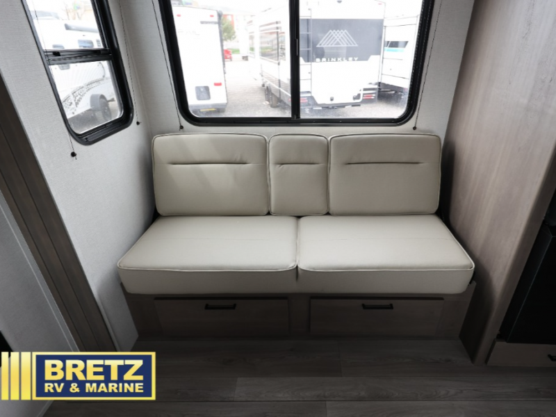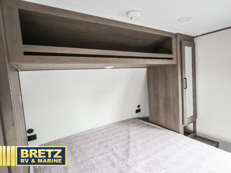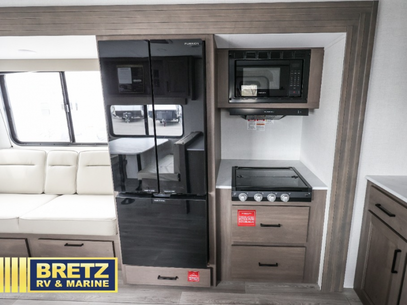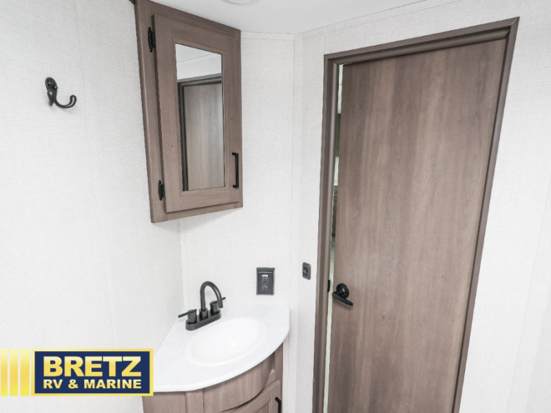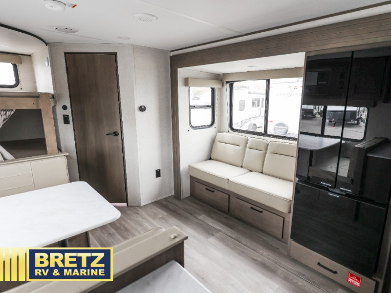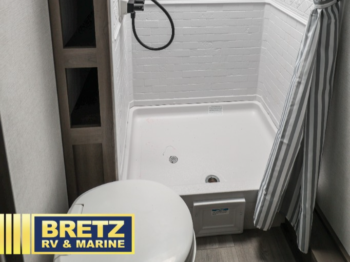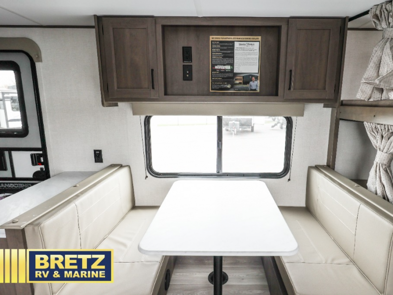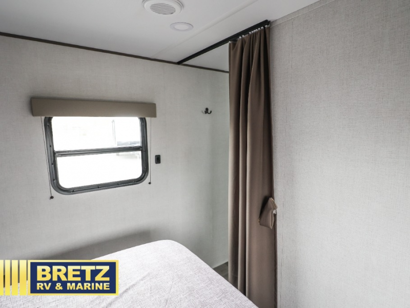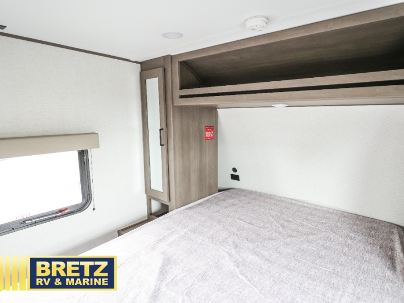 Camping with your larger family or when you want to take along a few extra friends is easy with this trailer. This unit sleeps nine with the double-size bunks in the rear corner, the 60" roll over sofa, and the queen bed in the front semi-private bedroom. The booth dinette can also be used to sleep a guest or two little ones at night once converted. Prepare your meals on the three-burner cooktop indoors, or out on the two-burner cooktop at the outside kitchen! You'll also find a handy exterior spray port and an outdoor refrigerator for cold drinks! It will be so easy to fill the dog's food bowl with the added pet dish under the refrigerator, and the full bath in this model means you don't have to use the camp's facilities. Having a 17' awning outside along with a large unobstructed pass-through compartment allows you extended living outdoors and plenty of space for all of your gear!