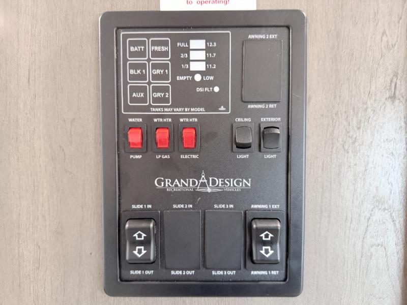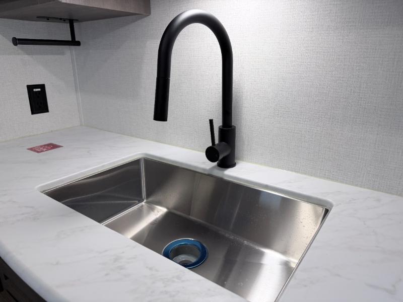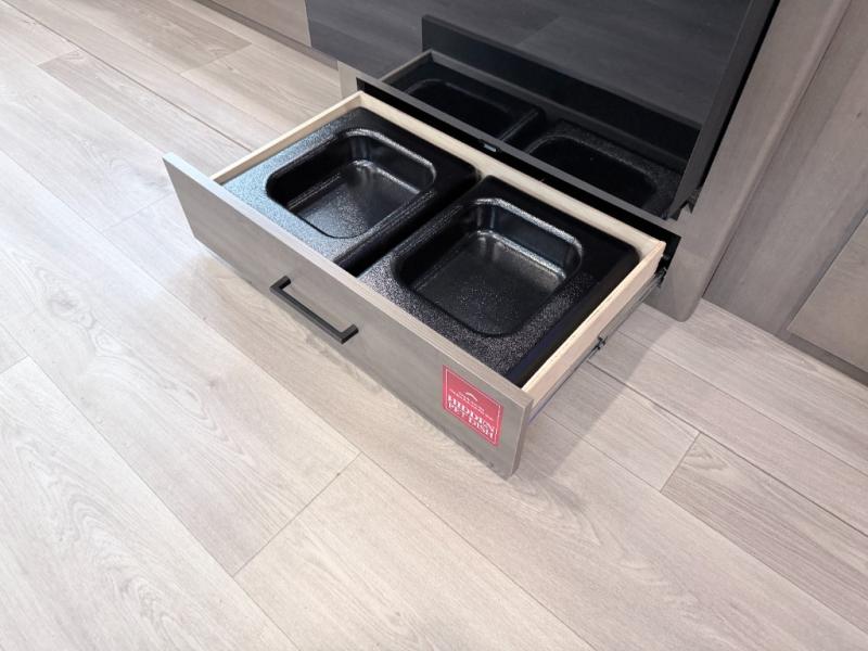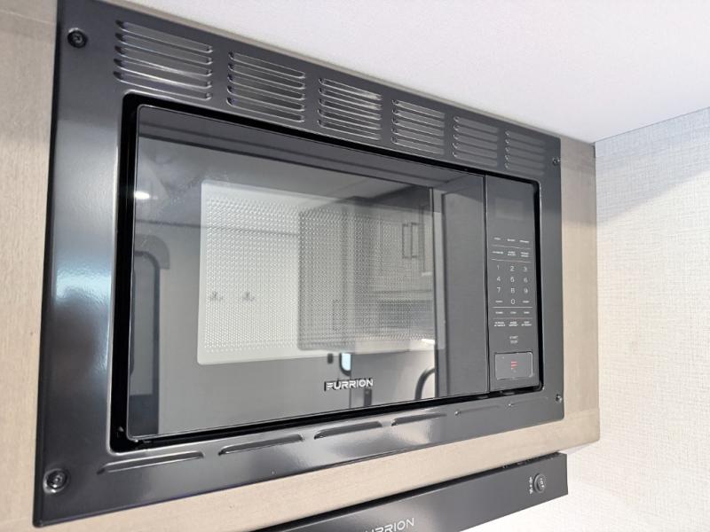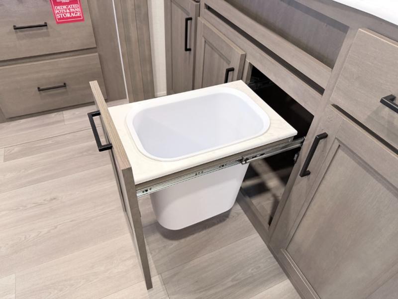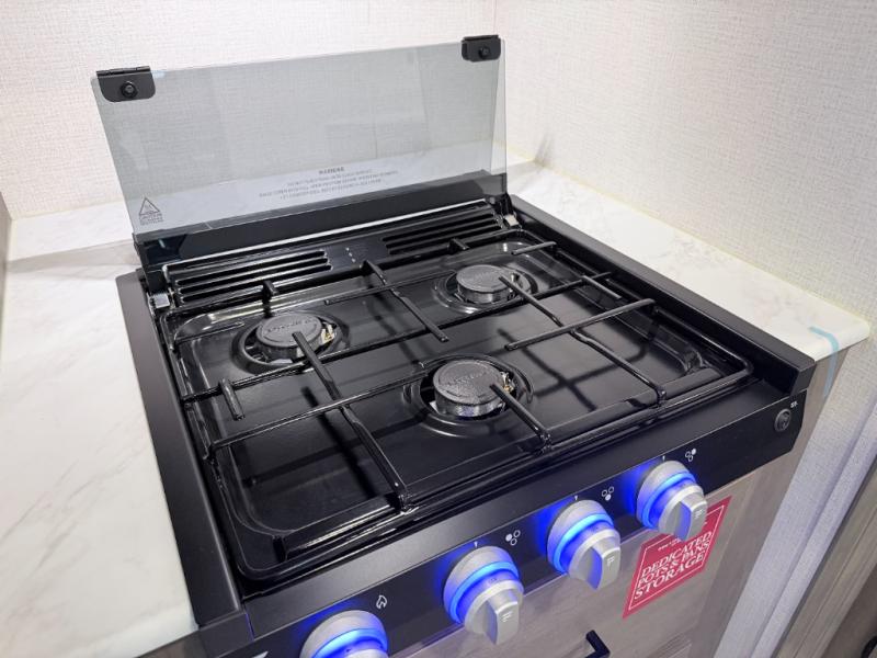 Prepare meals inside on the three-burner cooktop or take the cooking outdoors to the two-burner outside kitchen. A handy exterior spray port makes cleanup quick, and the outdoor refrigerator keeps drinks chilled and ready. Inside, the added pet dish under the refrigerator makes camping more convenient for your four-legged family members.
