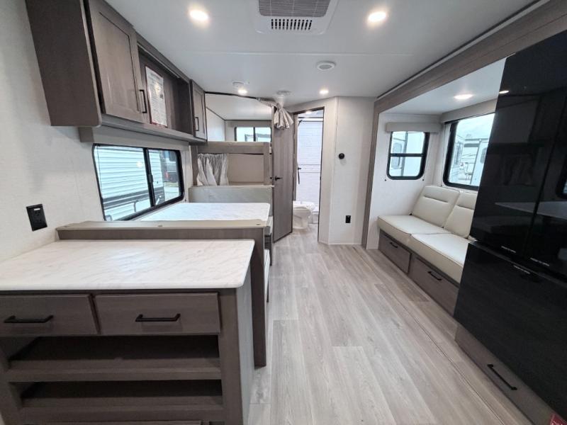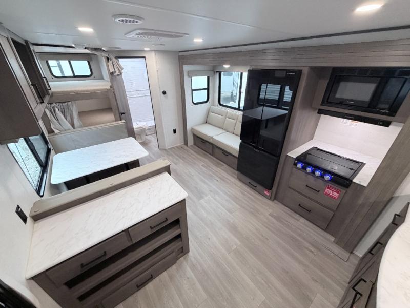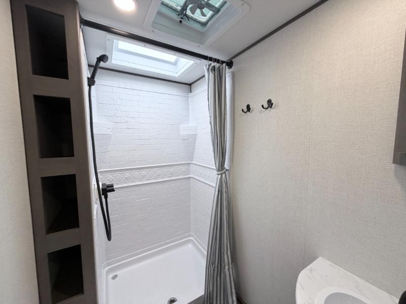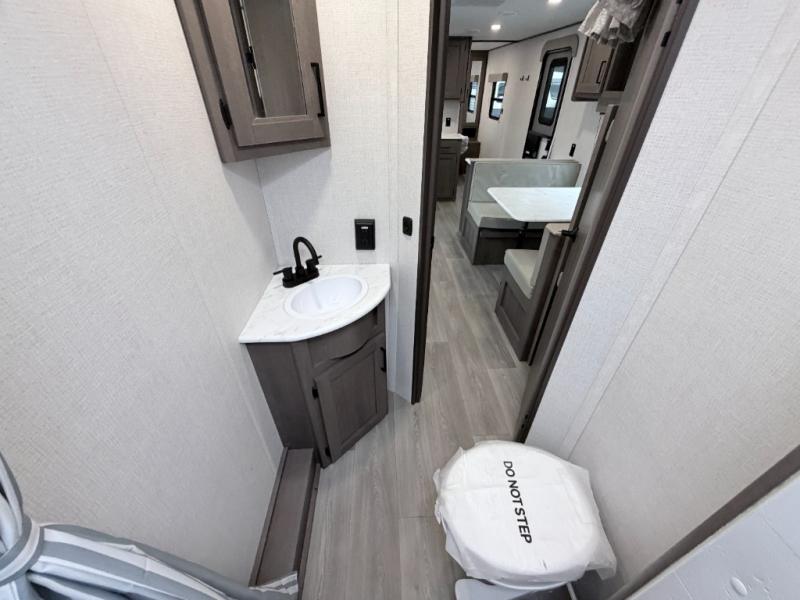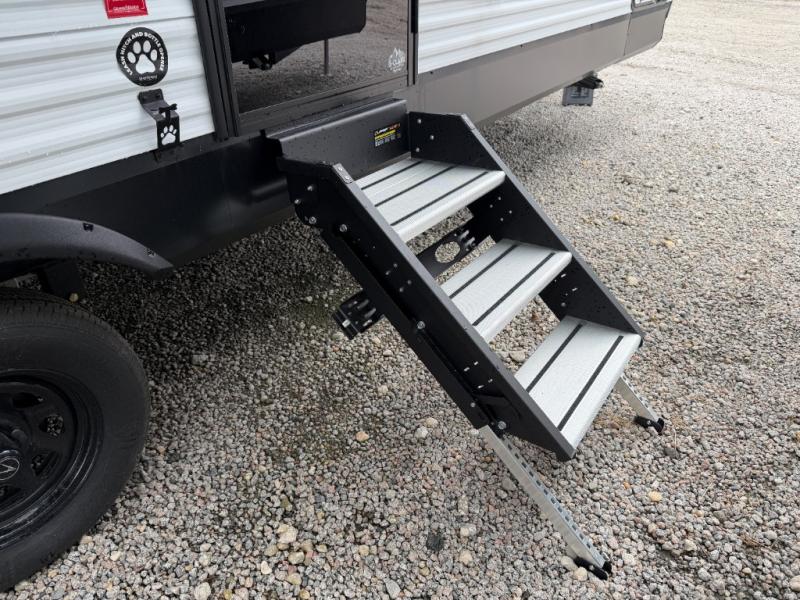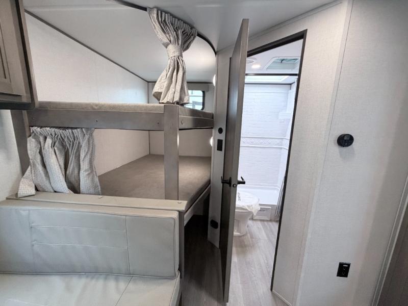 Enjoy the convenience of a full bath, perfect for avoiding campground facilities. The 17' power awning creates a shaded outdoor living space, and the large, unobstructed pass-through compartment offers room for chairs, gear, and adventure essentials. Throughout the interior, upgraded residential furniture and cabinetry give the 26BHX a comfortable, home-like feel.